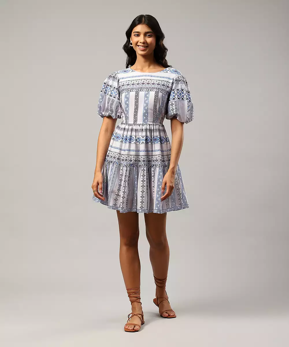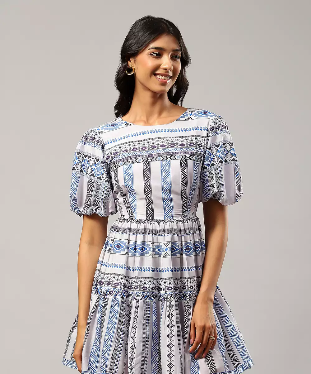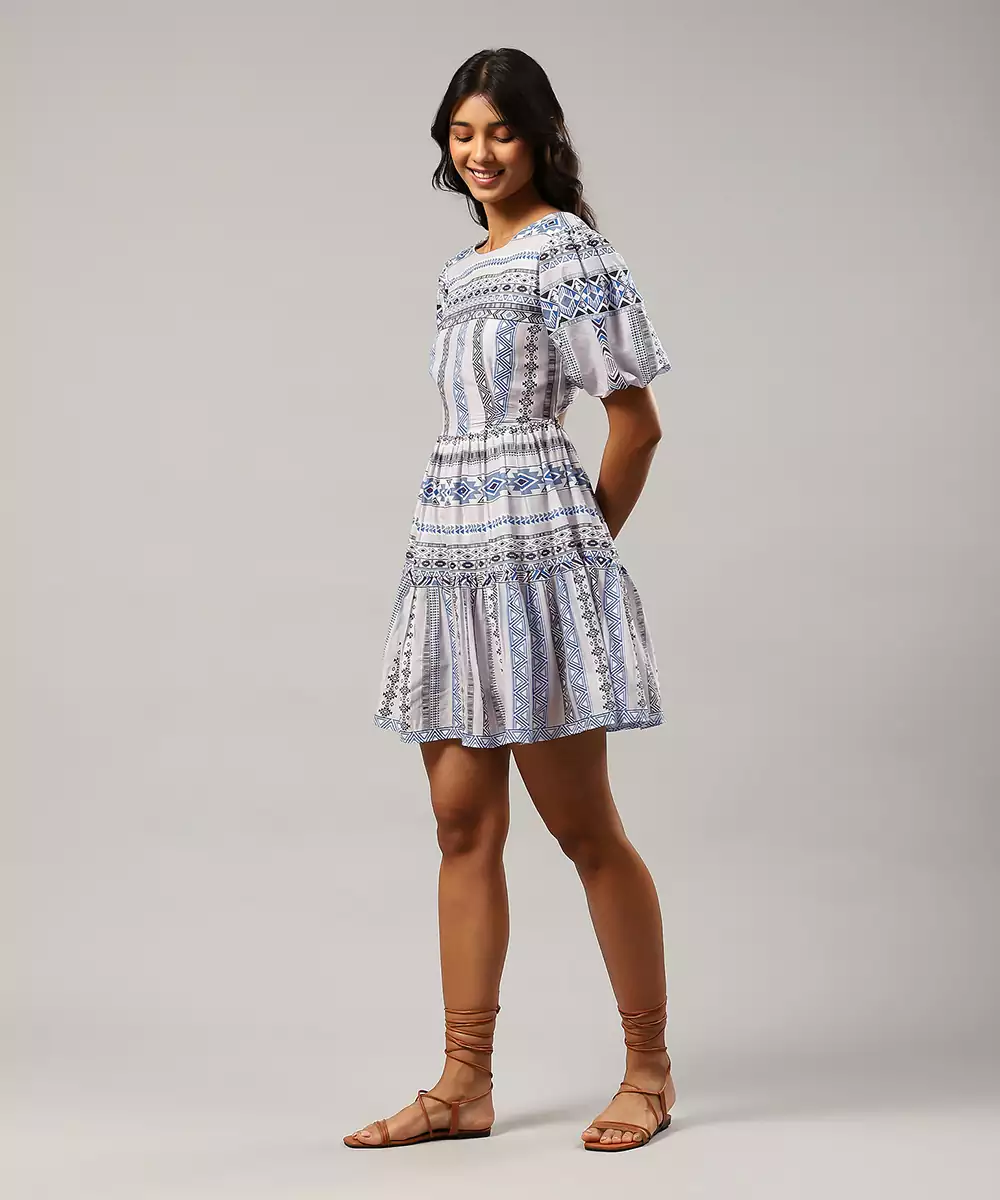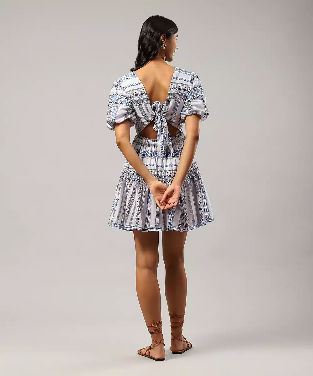 Featuring Blue Geometric Print Short Dress.