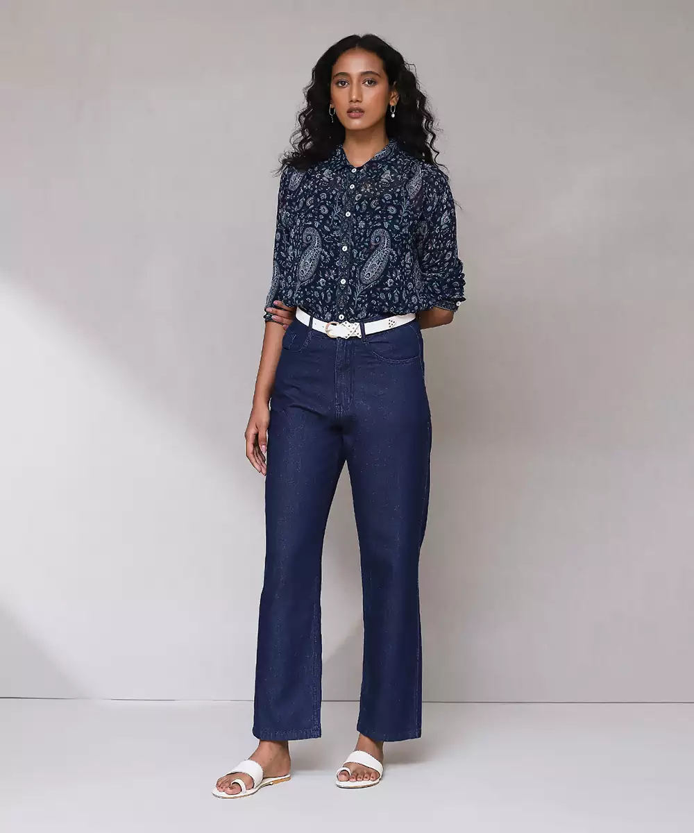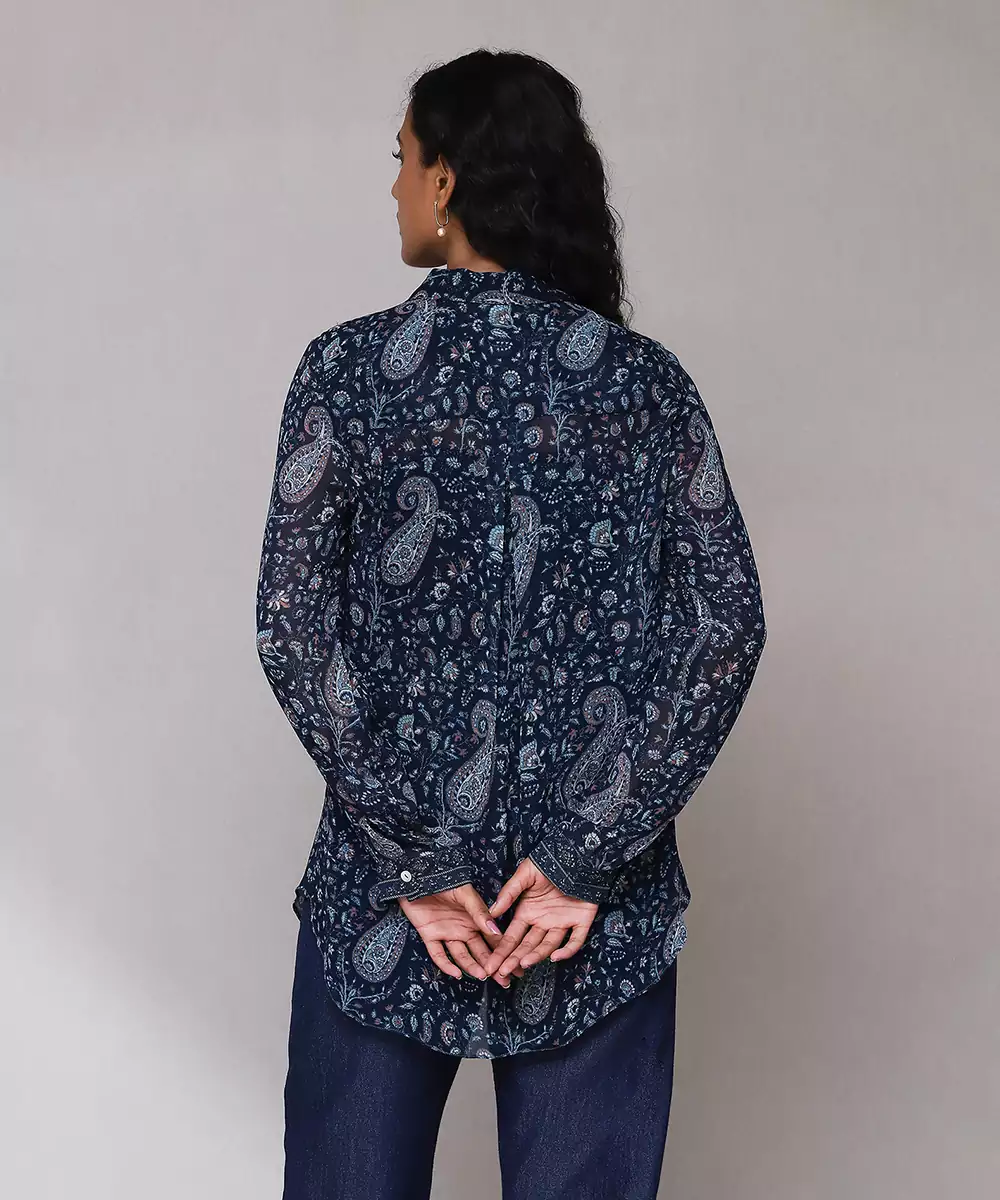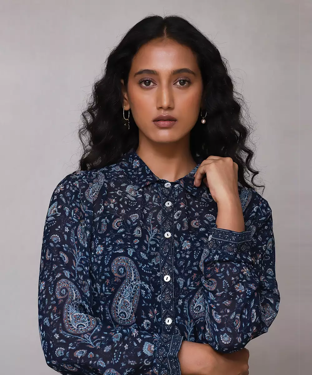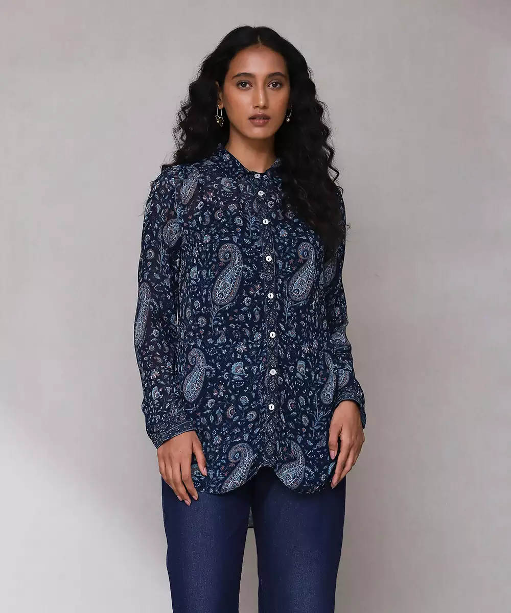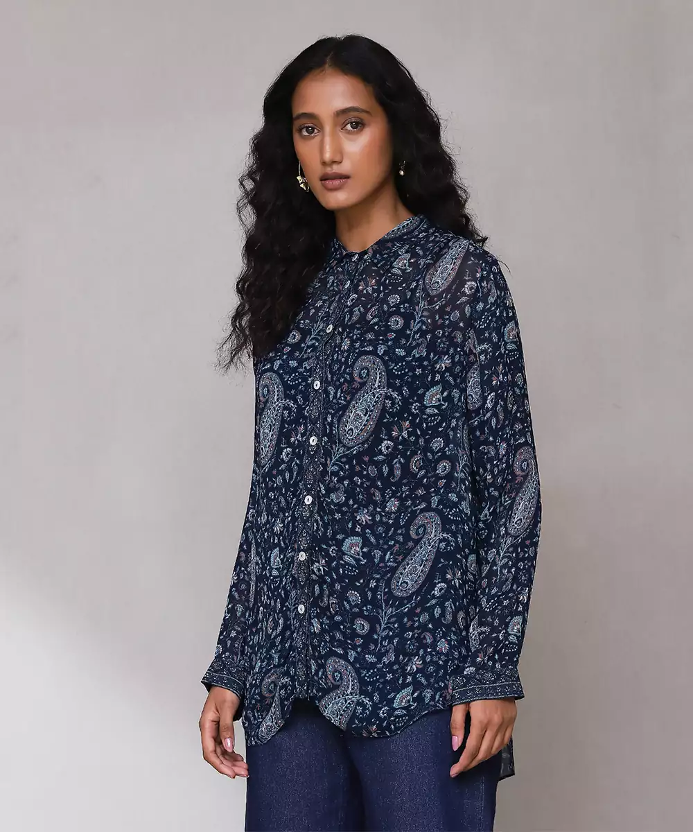 Featuring Blue Paisley Print Shirt With Camisole. Colour :Blue Fabric :Blended Cotton Components : 2 (Shirt, Camisole) Work :Embroidered