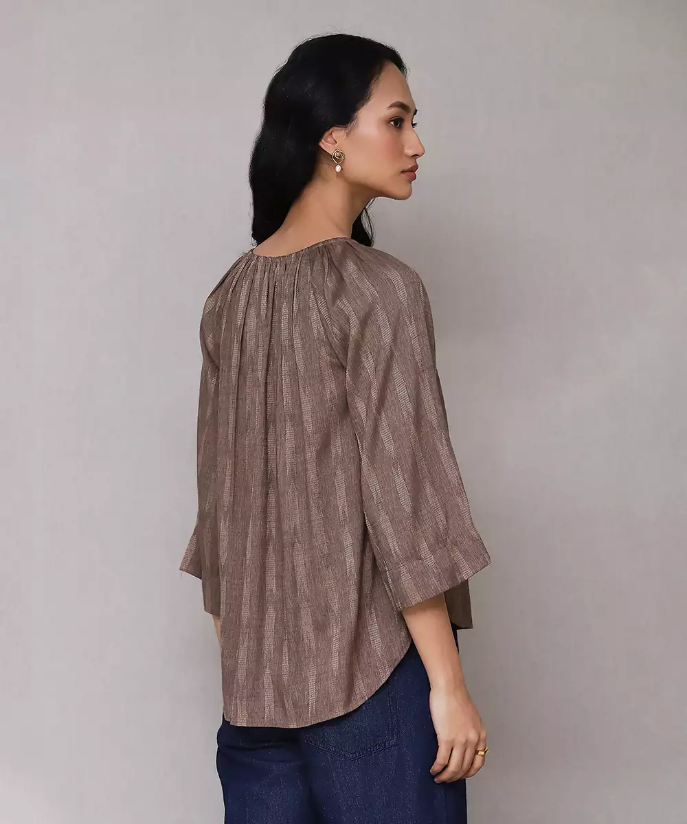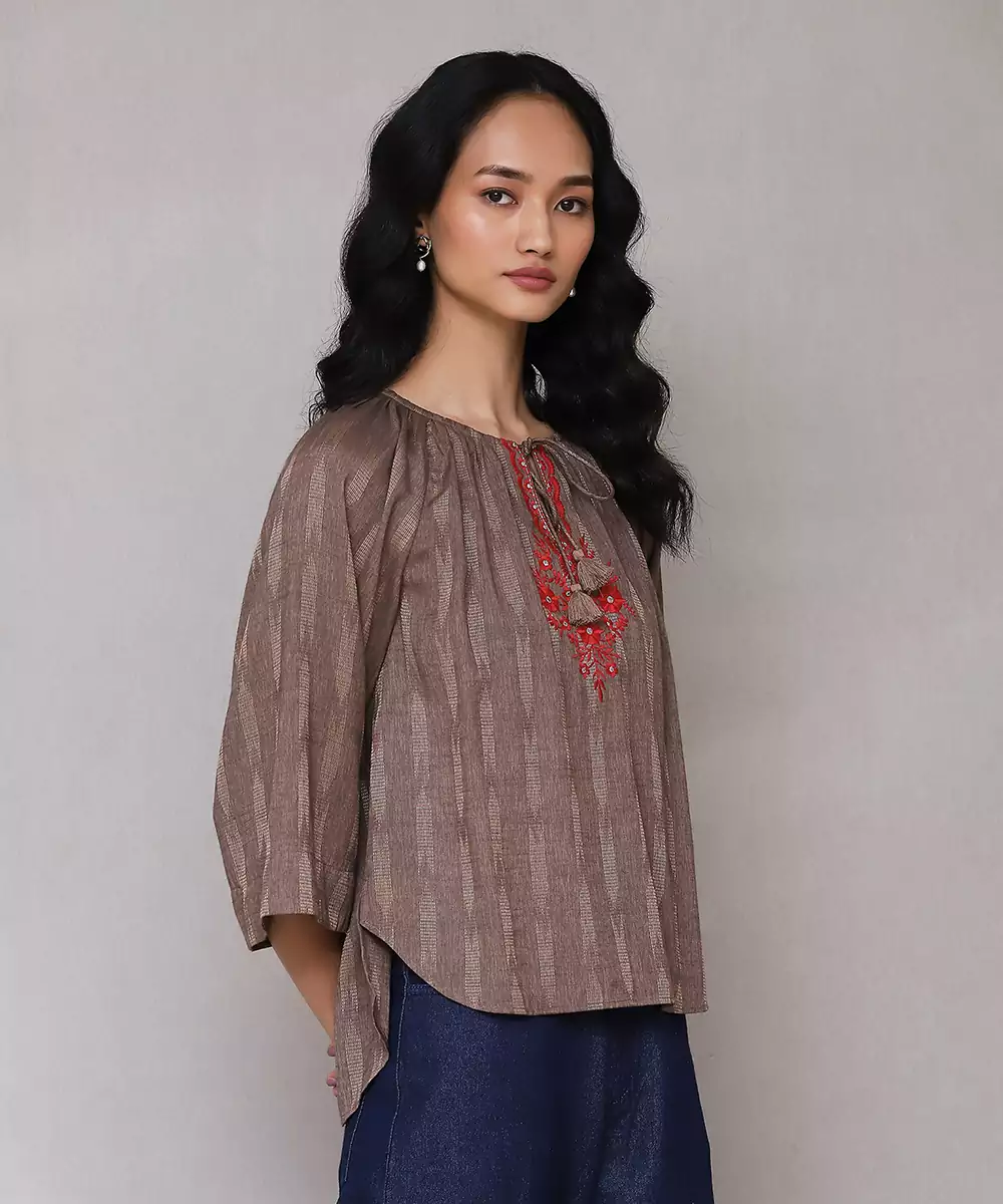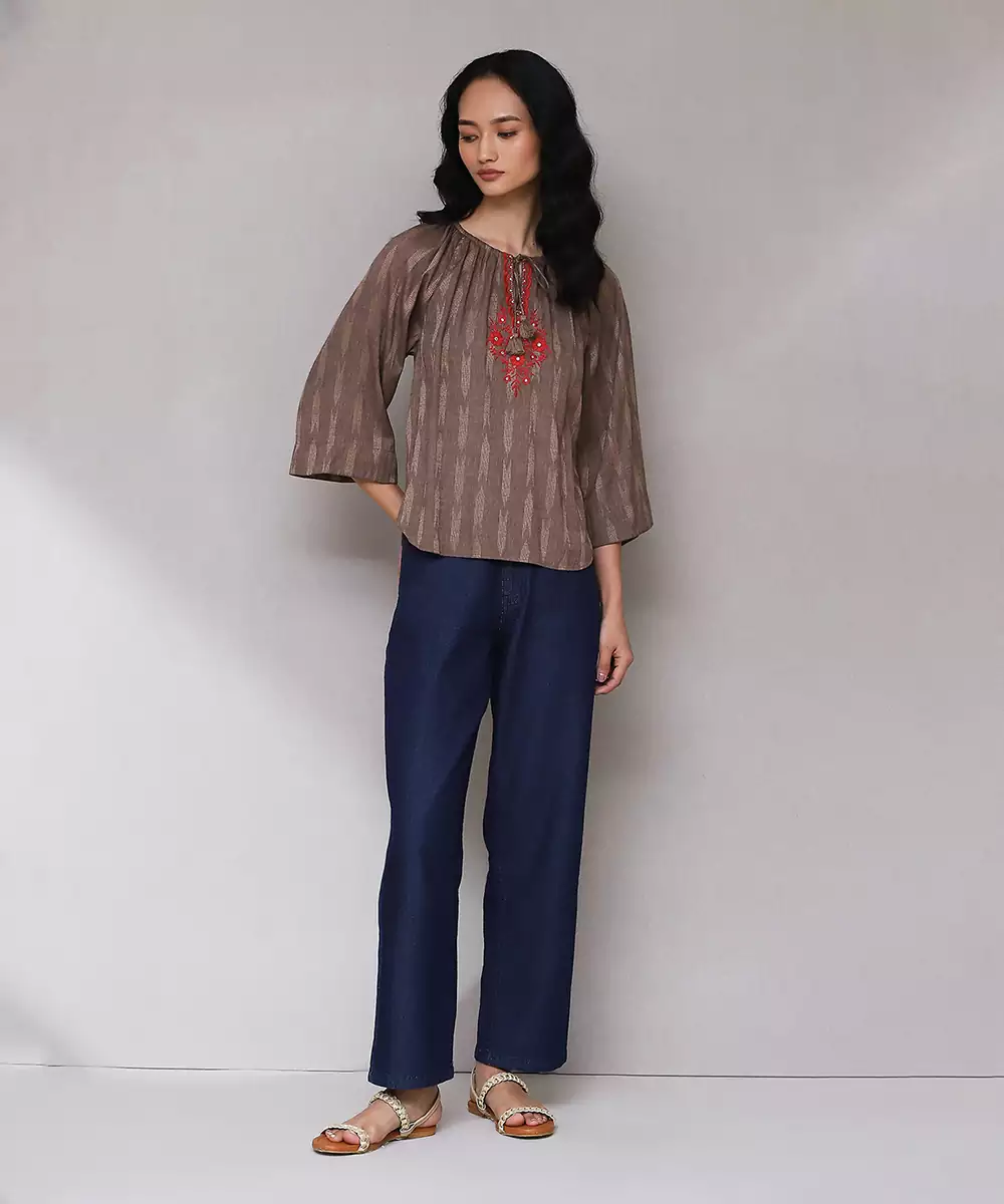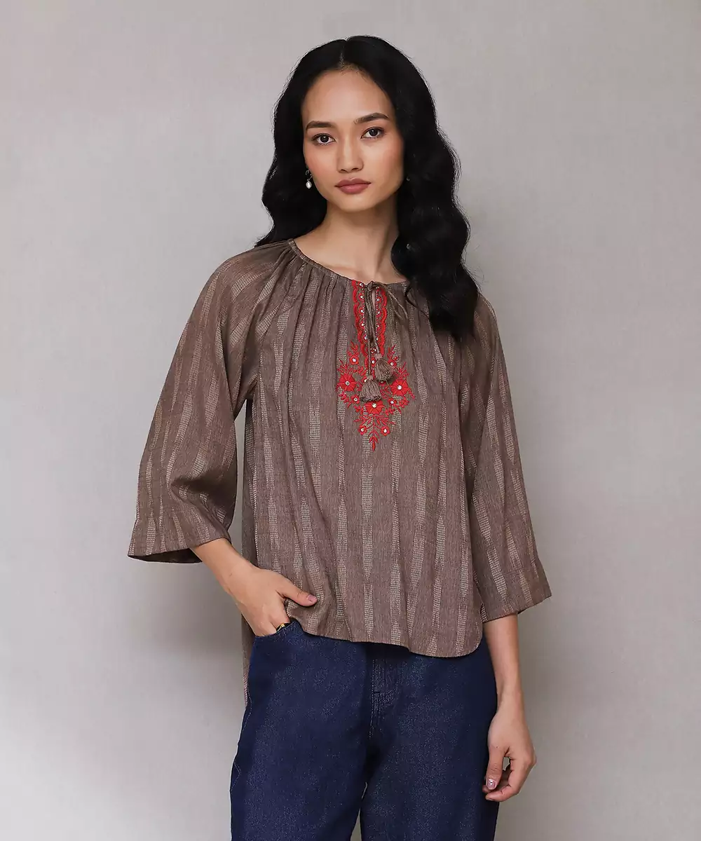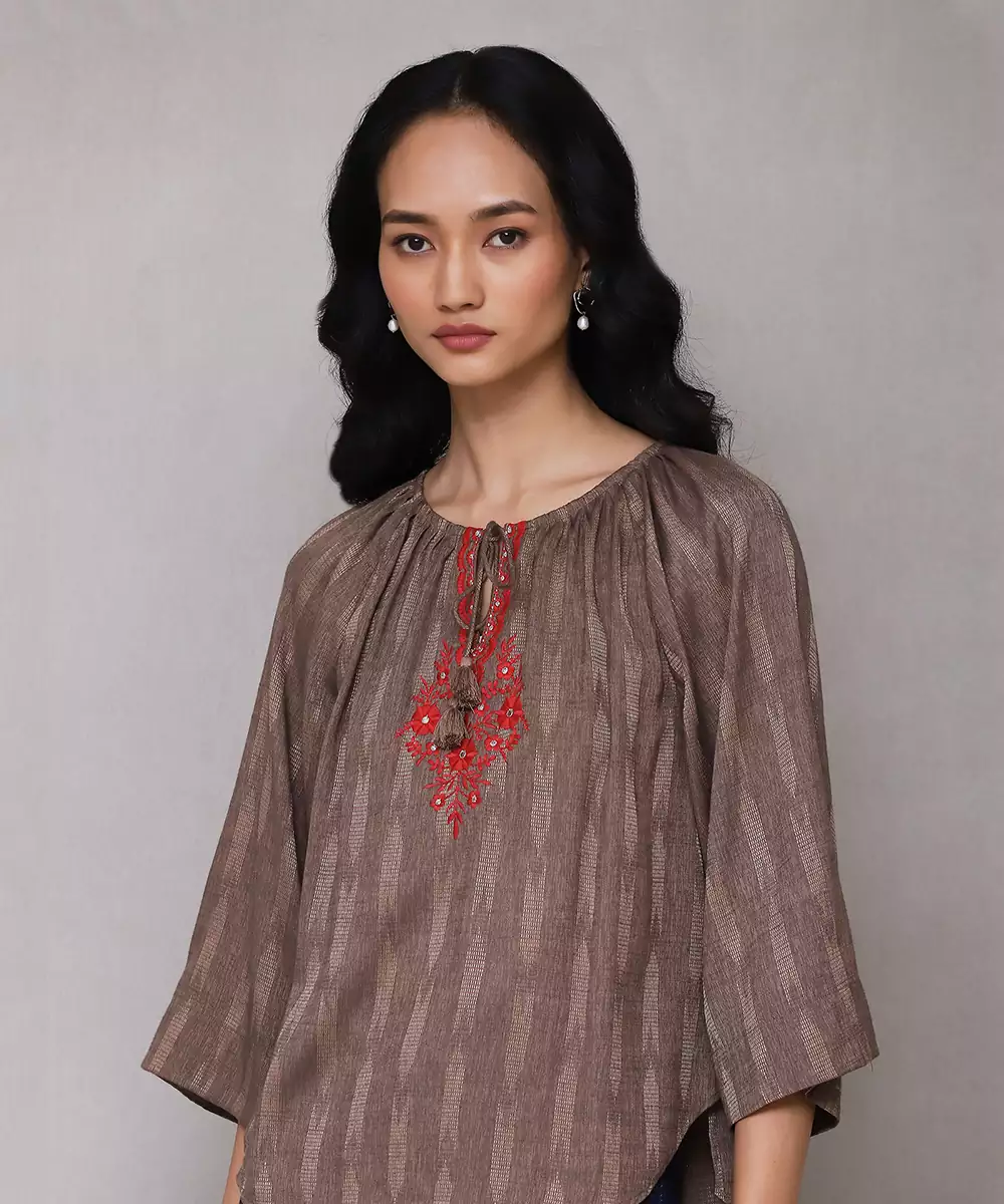 Featuring Brown Embroidered Ikat Top.