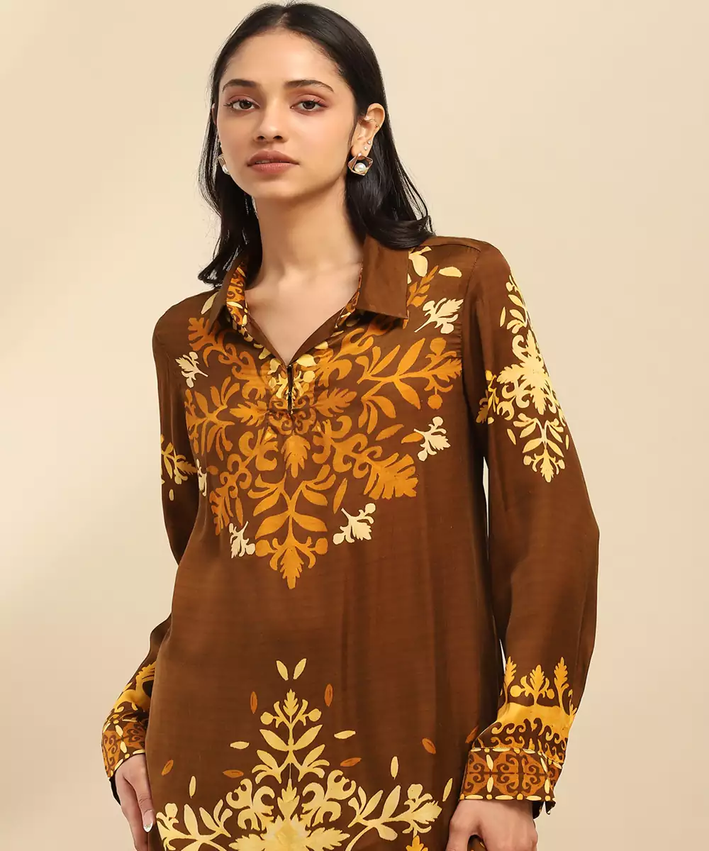 Brown Maple Kurti With Pant Co Ord Set Colour: Brown Fabric: Polyester Components : 1 Kurti / 1 Pant