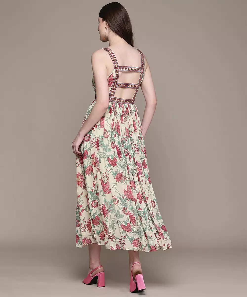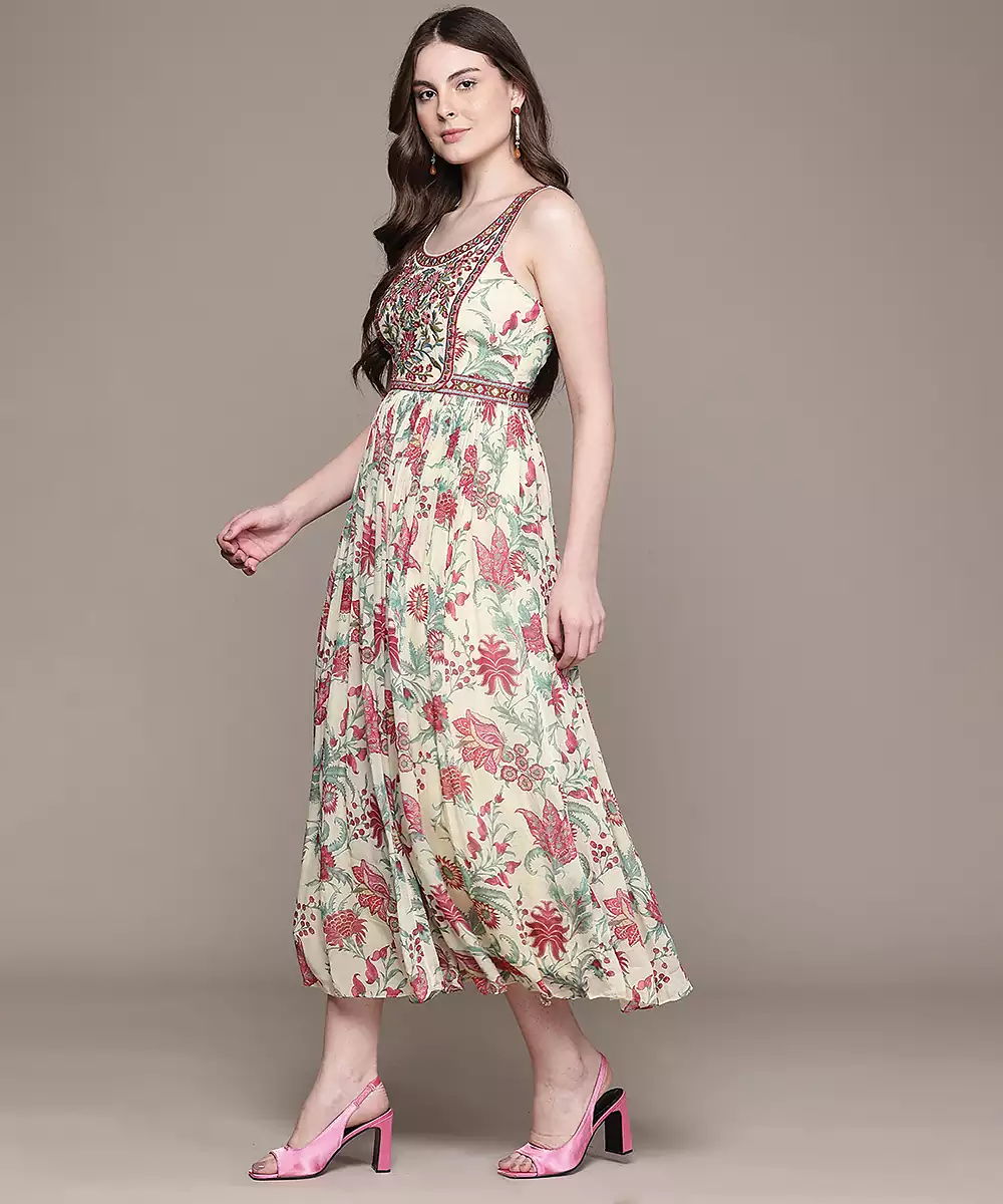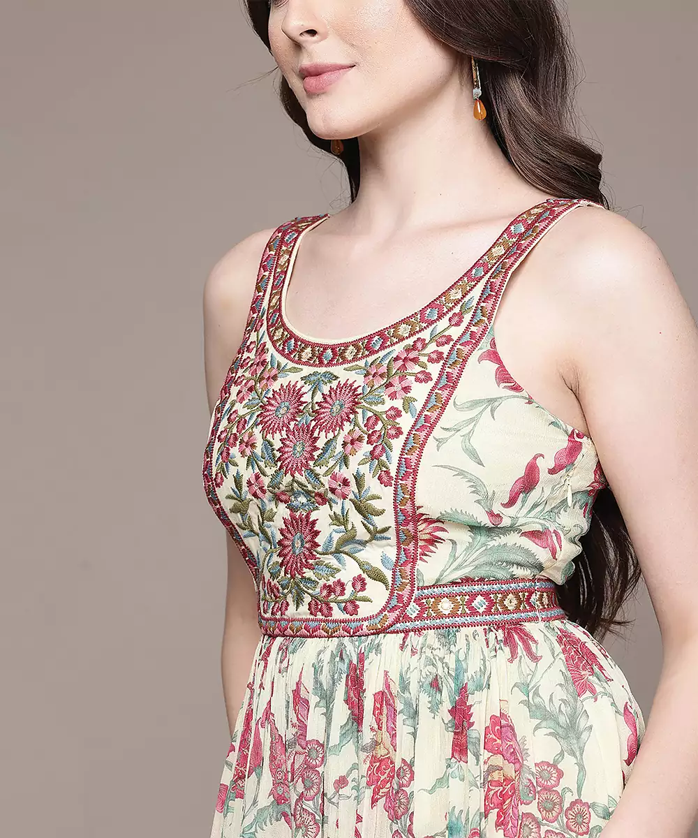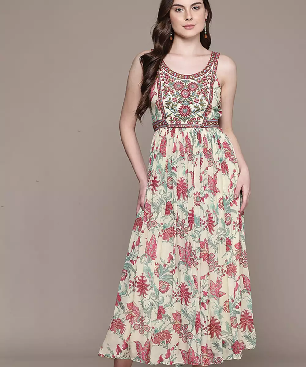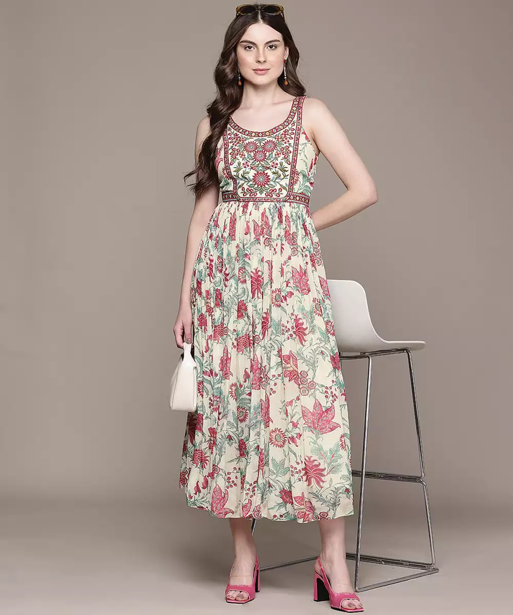 This Cream Printed Chinon Dress Offers A Soft And Flowy Silhouette With Delicate Prints. The Lightweight Fabric Ensures Comfort, While The Elegant Design Enhances Its Appeal. Perfect For Casual And Semi Formal Occasions, It Provides A Graceful And Stylish Look.