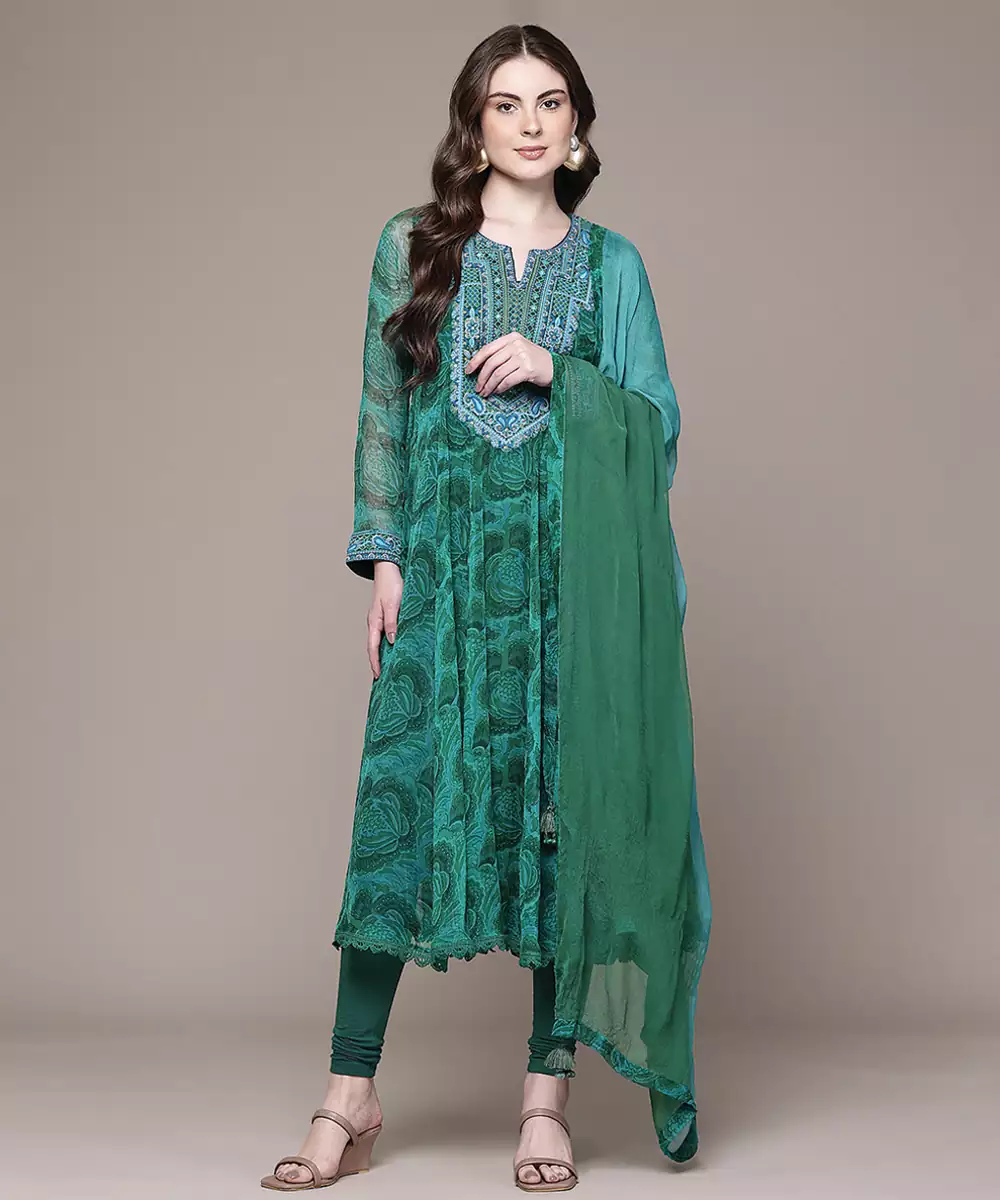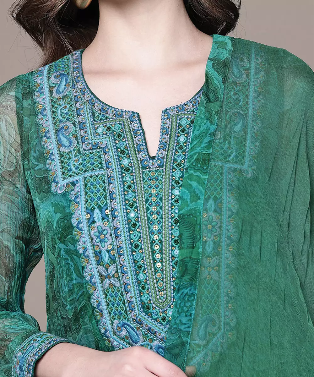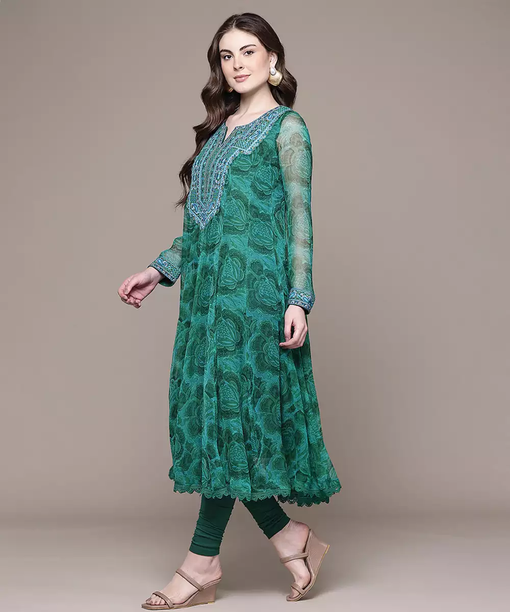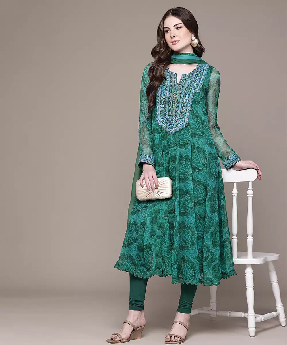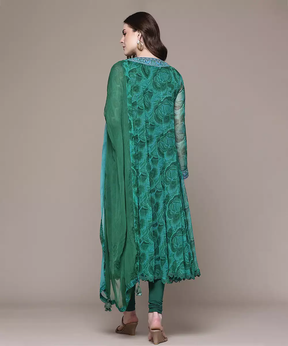 This Emerald Green Printed Chiffon Kurta Set Features A Rich Hue With Delicate Prints On A Lightweight Fabric. The Flowy Texture Ensures Comfort And Elegance, Making It Ideal For Festive And Casual Occasions. A Graceful Ensemble That Blends Vibrant Color With Modern Ethnic Style Effortlessly.