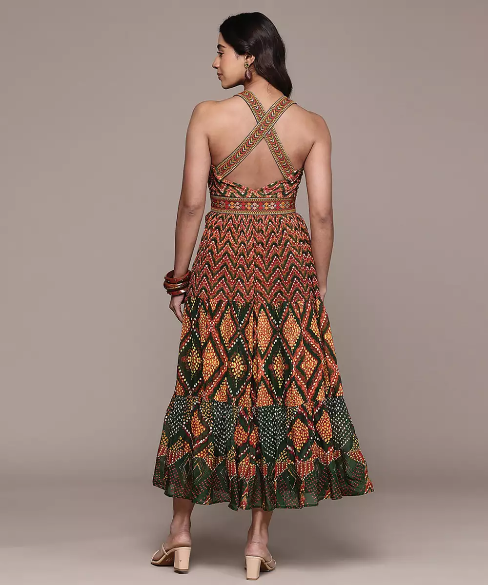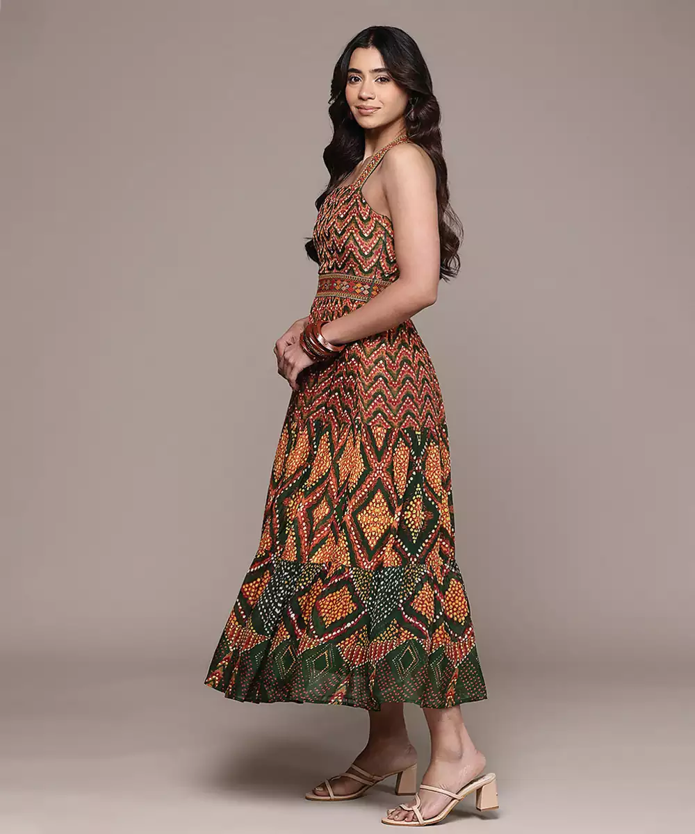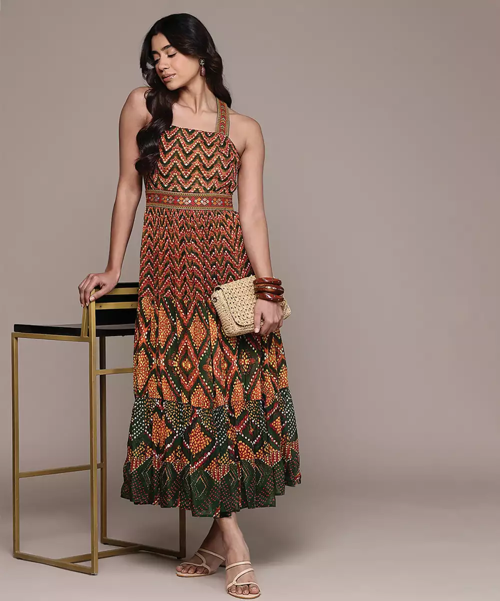 This Green Printed Chinon Dress Features A Soft, Flowy Texture With Elegant Patterns. The Lightweight Fabric Ensures Comfort, While The Graceful Silhouette Adds Charm. Ideal For Casual And Semi Formal Occasions, It Offers A Stylish And Contemporary Look With Ease.