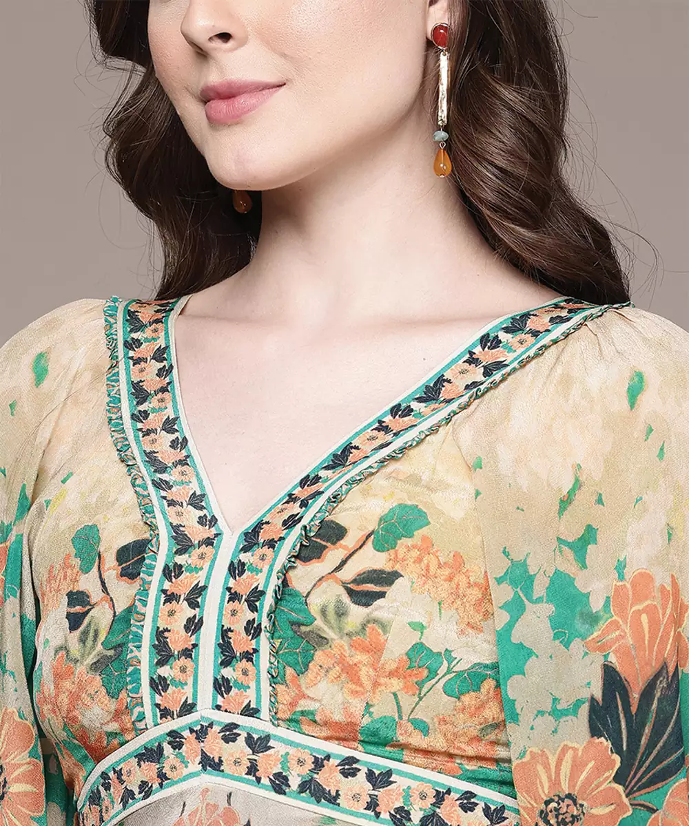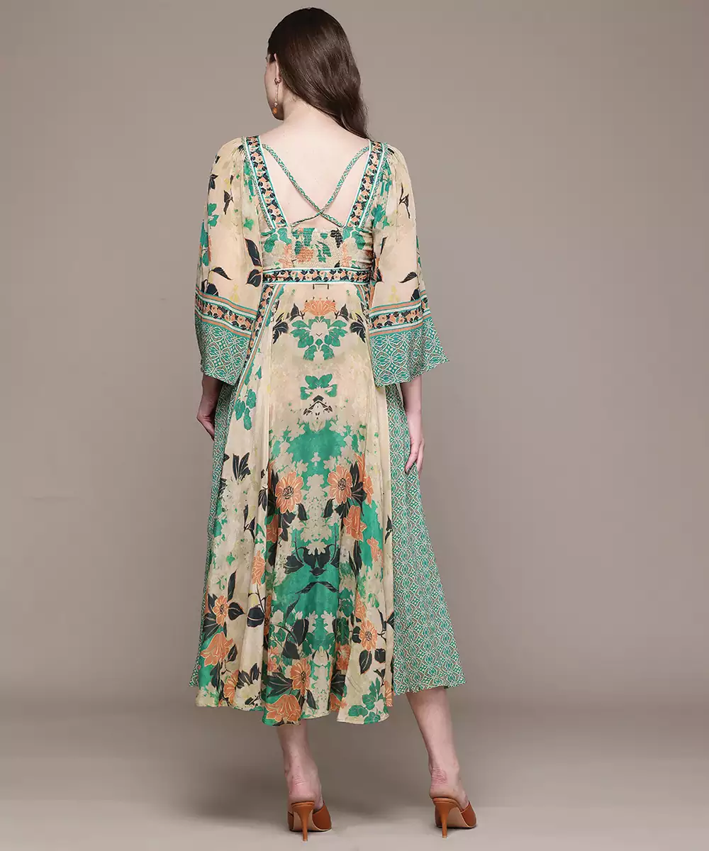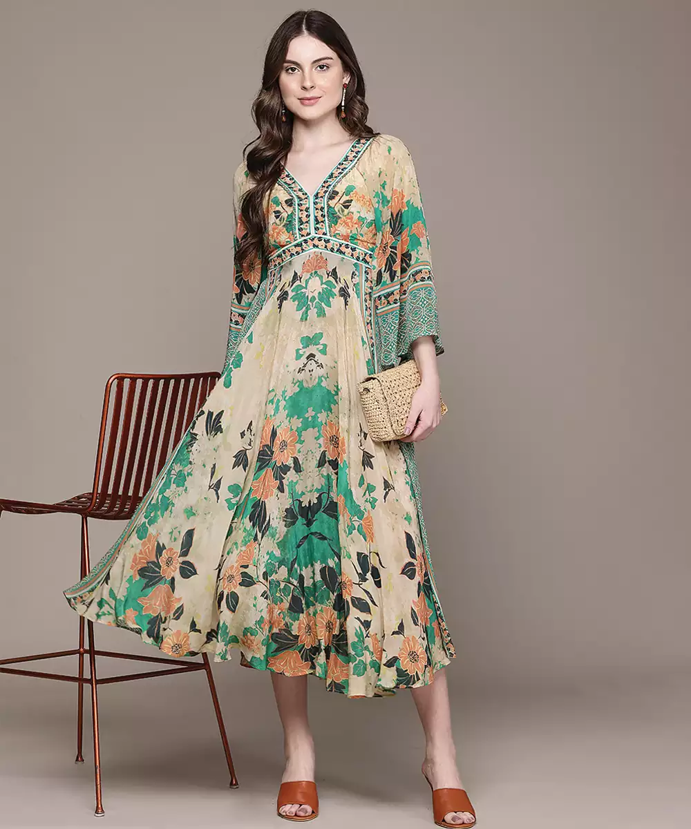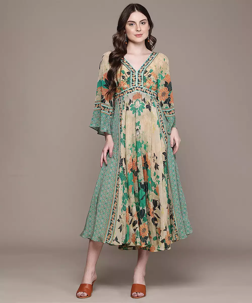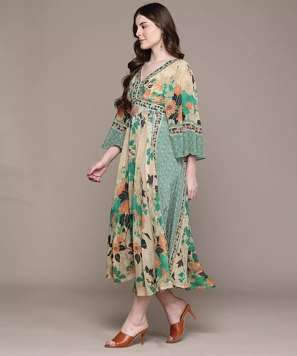 This Green Printed Crepe Dress Features A Smooth Texture With Elegant Patterns. The Comfortable Fit And Lightweight Fabric Make It Ideal For Everyday Wear. A Stylish Outfit That Blends Simplicity With A Fresh And Contemporary Look Effortlessly.
