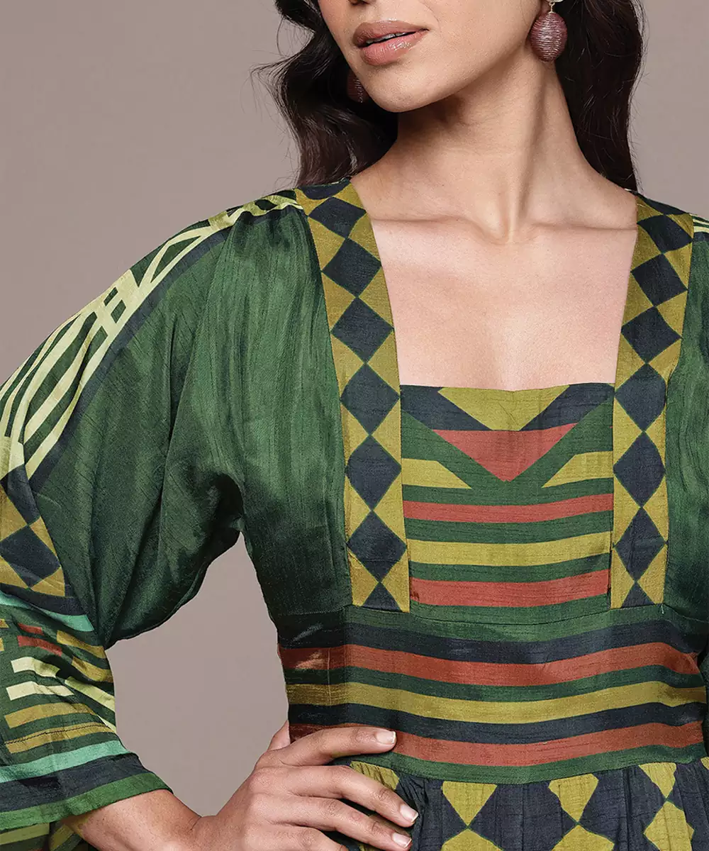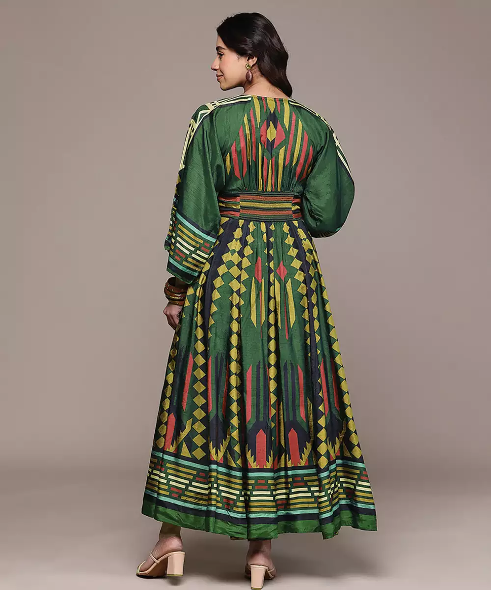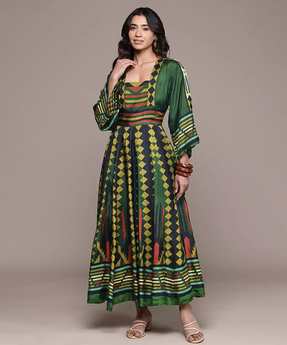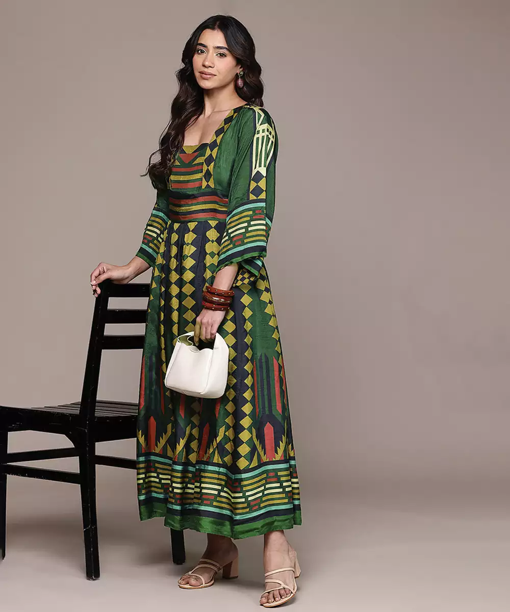This Green Printed Viscose Gown Features A Flowy Silhouette With Elegant Patterns. The Soft Fabric Ensures Comfort, While The Graceful Design Adds Charm. Perfect For Casual And Semi Formal Occasions, It Offers A Stylish And Modern Look With Effortless Elegance.