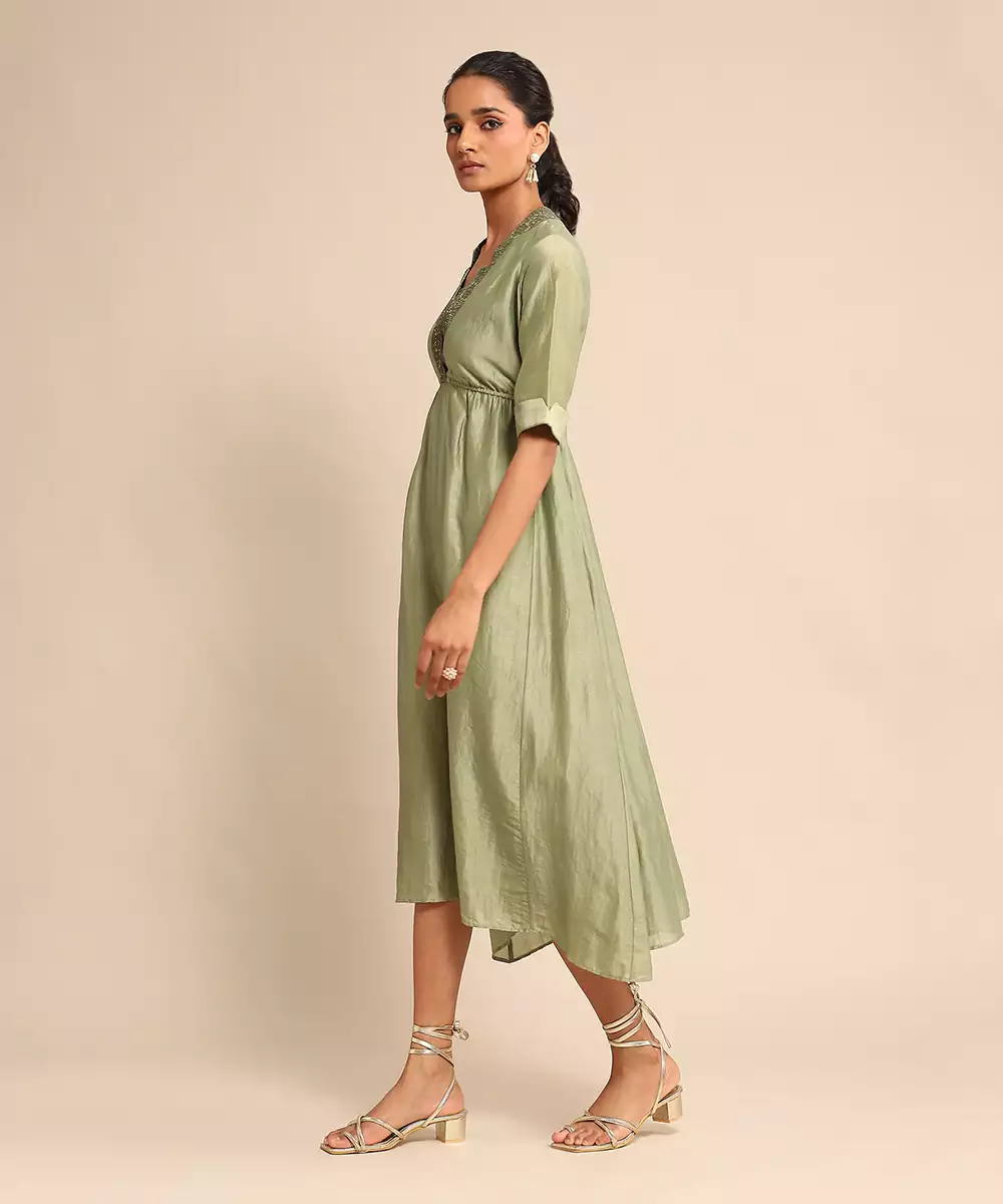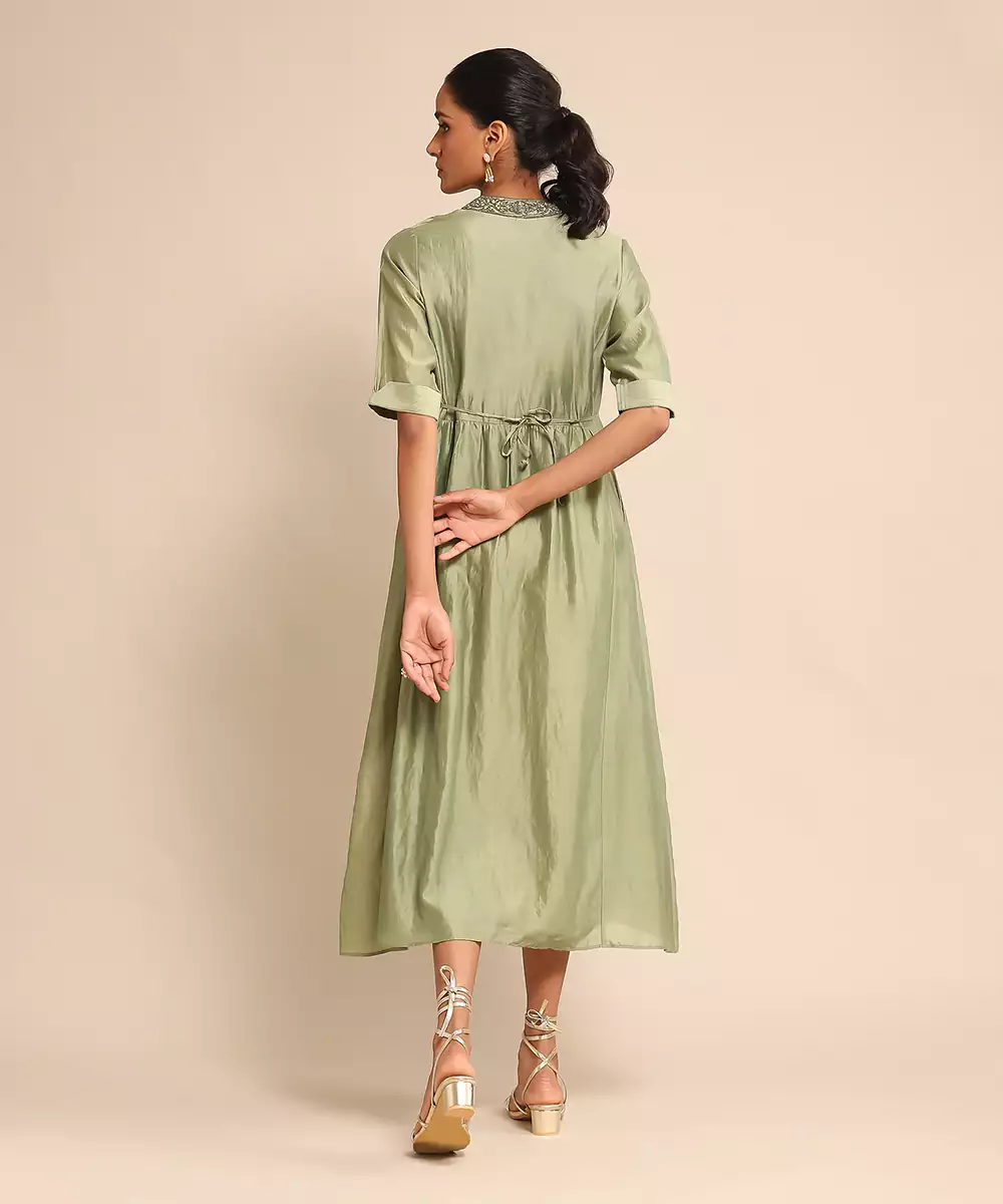Green Solid Dress With Minimal Neck Embroidered Detailing . Colour: Green Fabric: Chanderi Components: 1 Dress Work: Solid