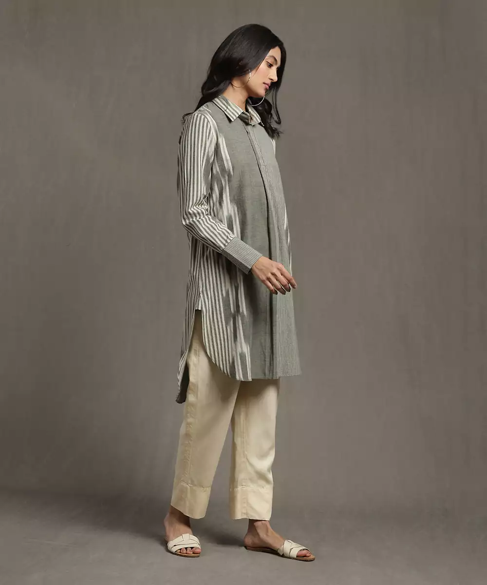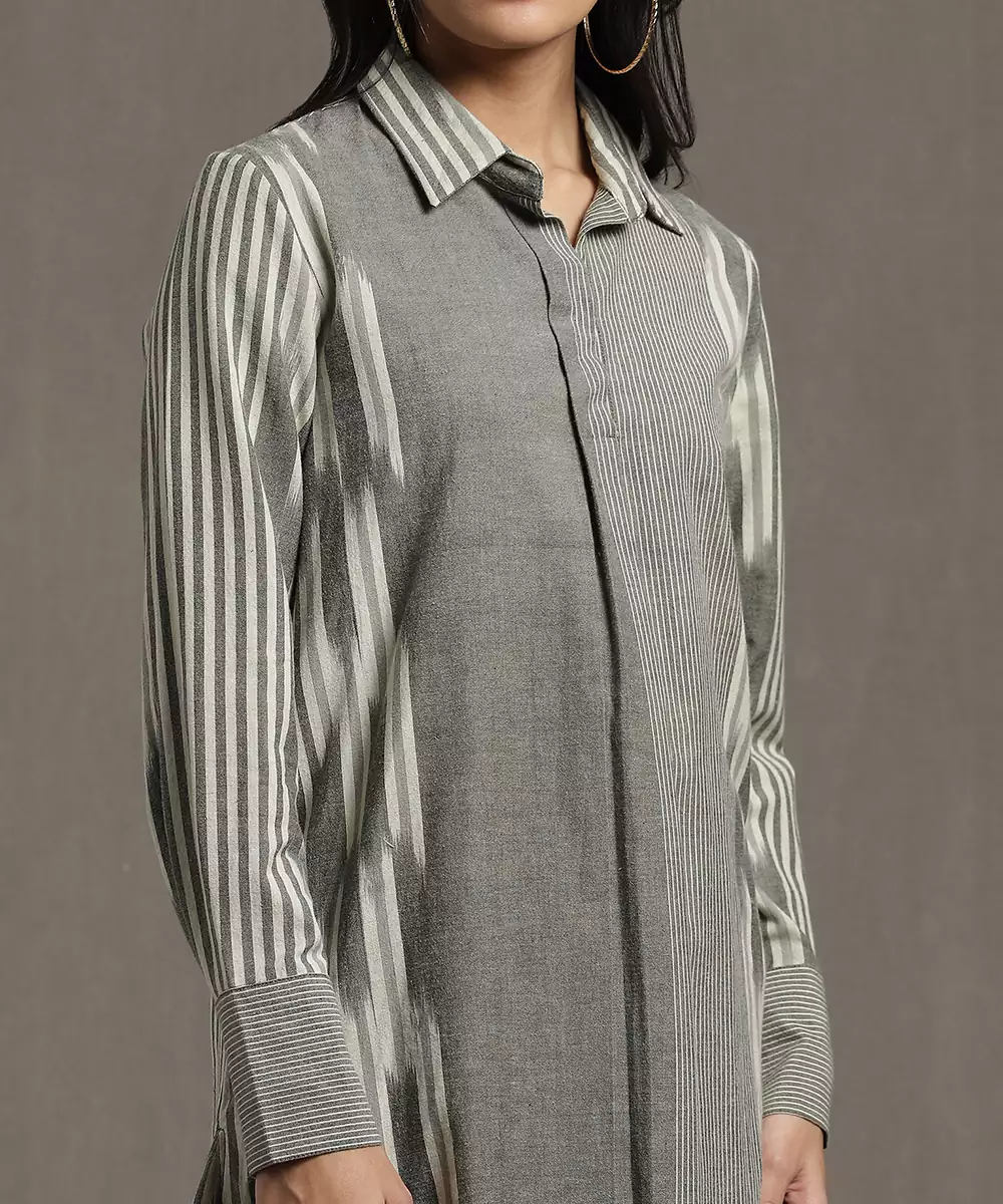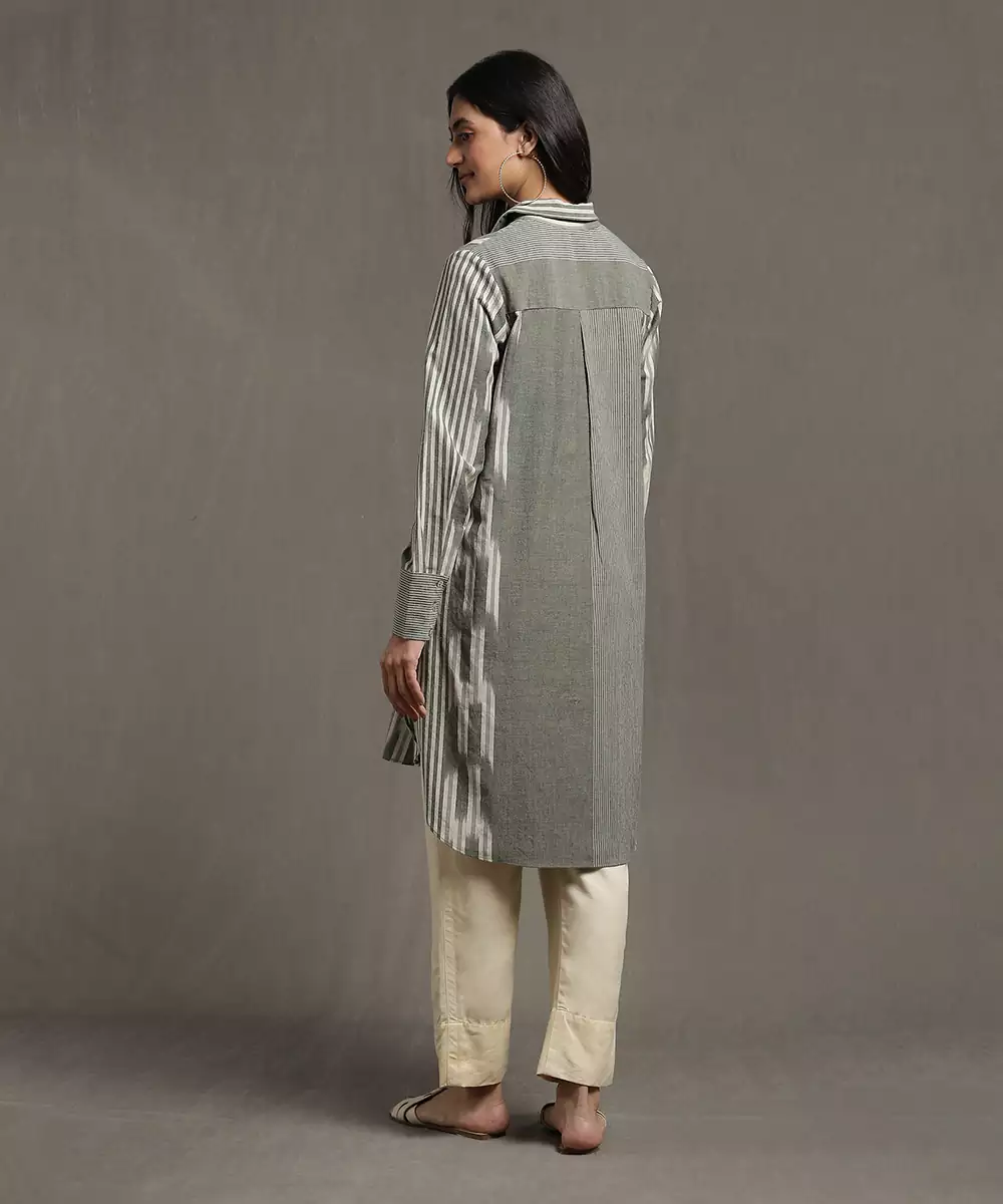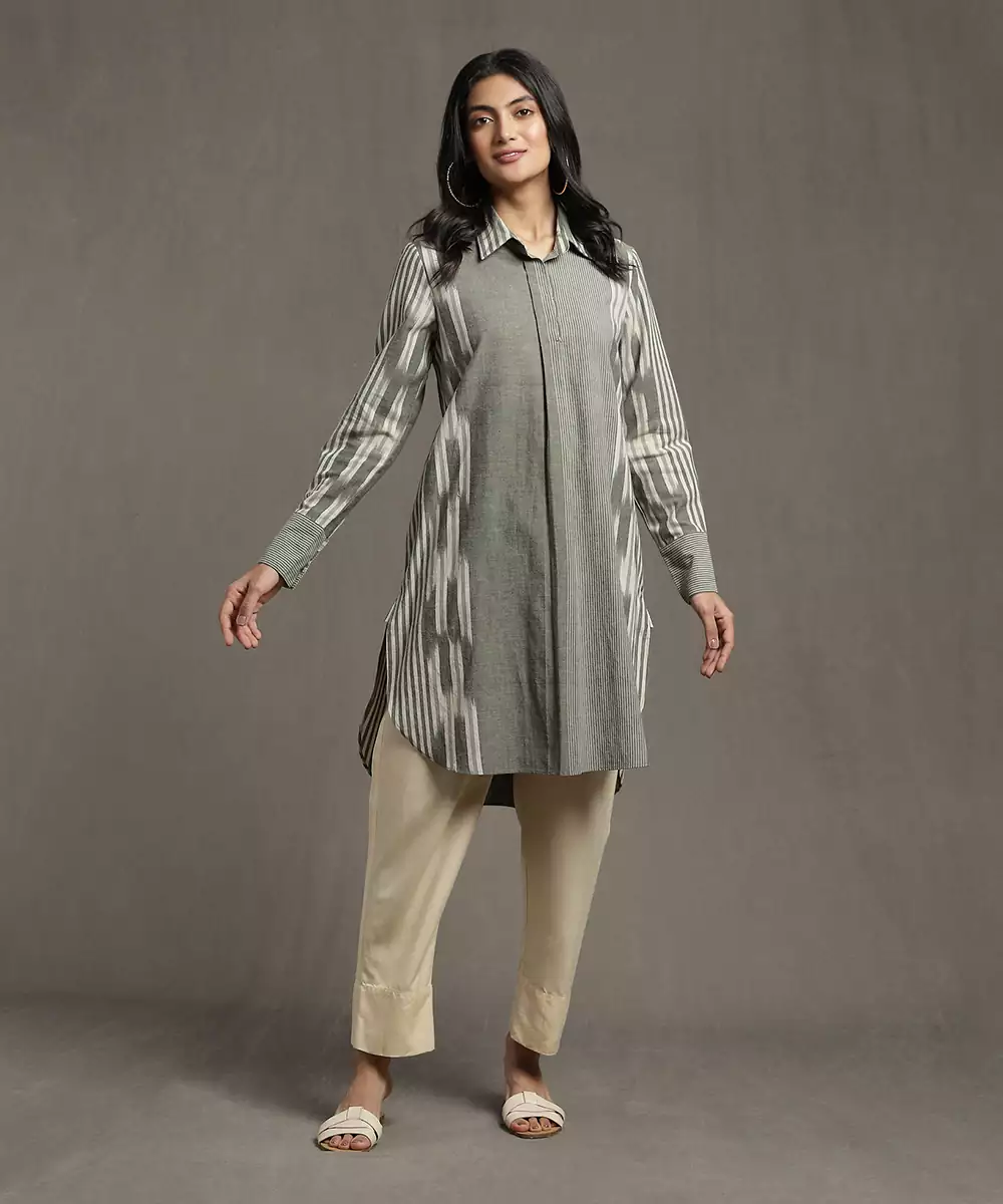 Green Stripe Straight Kurti With Concealed Placket Featuring Shirt Collar . Colour: Green Fabric: 100% Cotton Components: 1 Kurti Work: Self Design