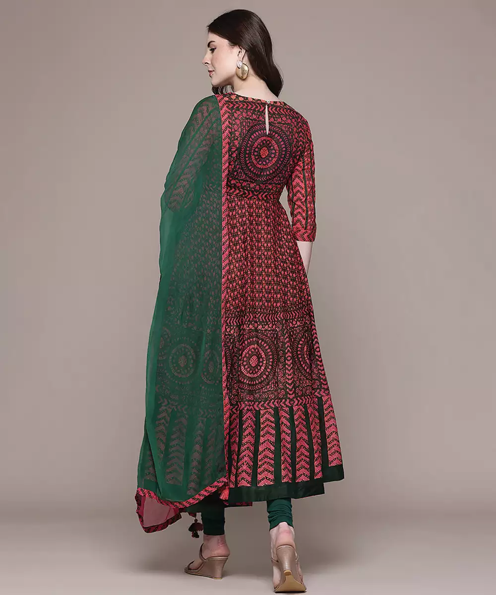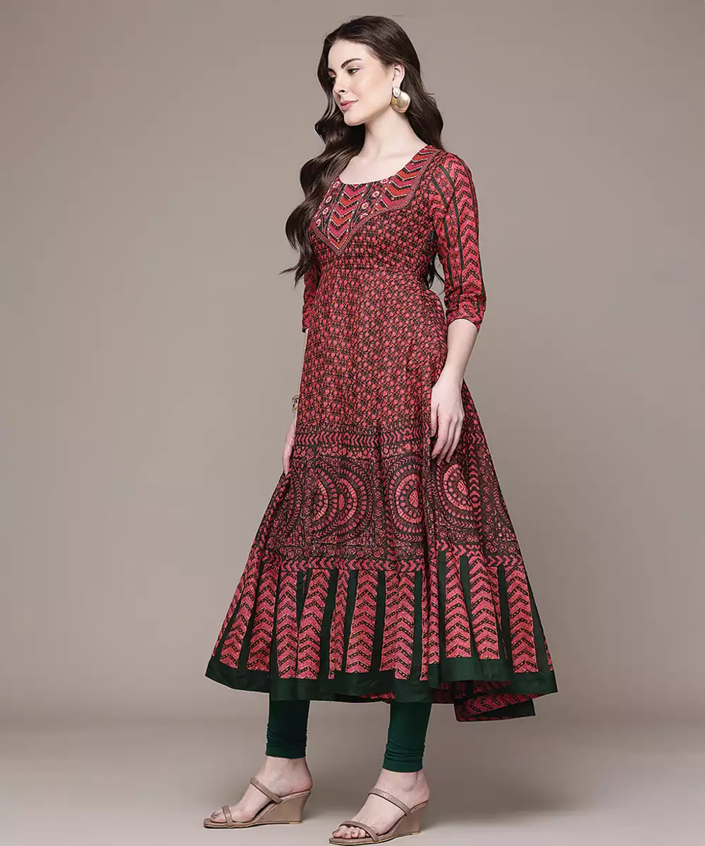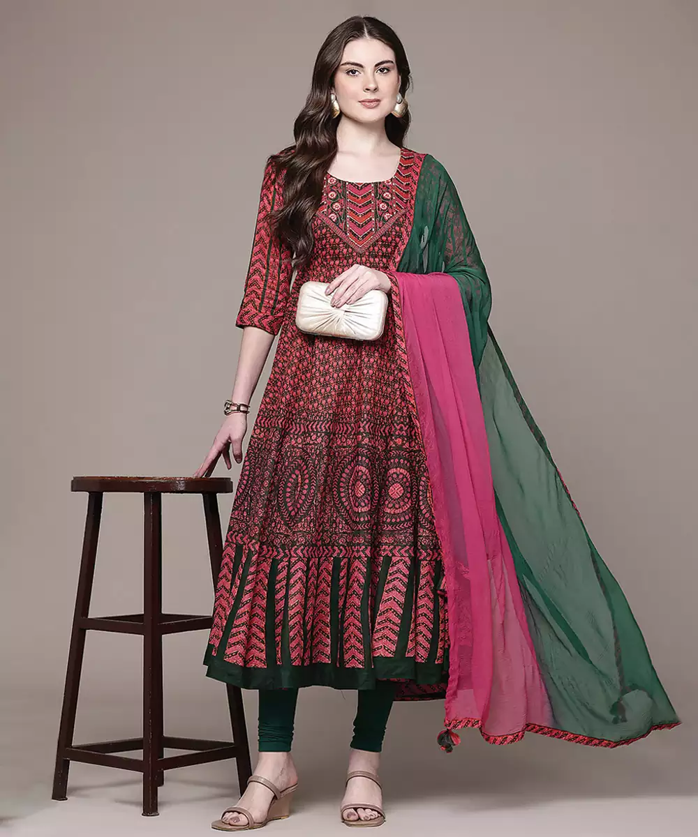 This Maroon Printed Lycra Anarkali Set Features A Comfortable Stretch Fabric With Elegant Prints. The Flared Silhouette Enhances Movement And Grace, Making It Ideal For Festive Occasions. A Stylish Outfit That Blends Comfort With A Rich And Sophisticated Ethnic Appeal.