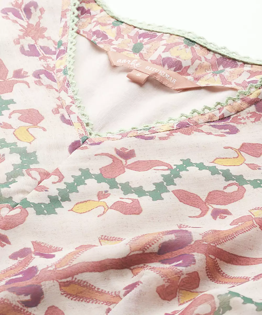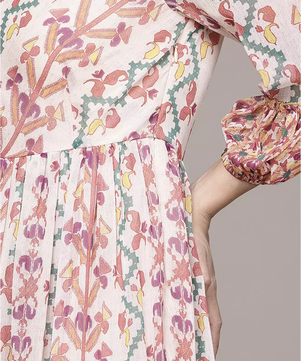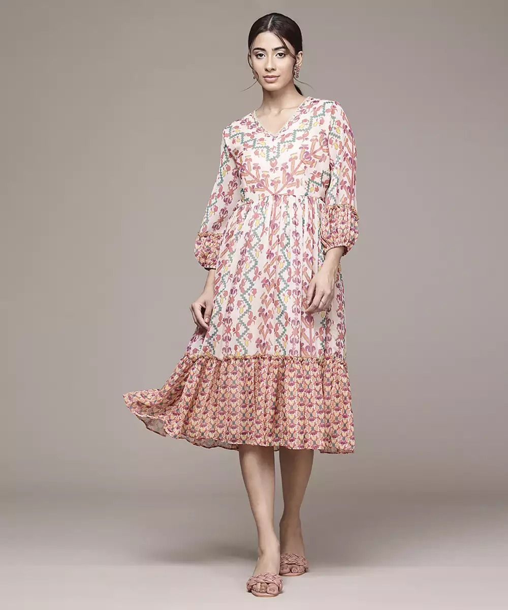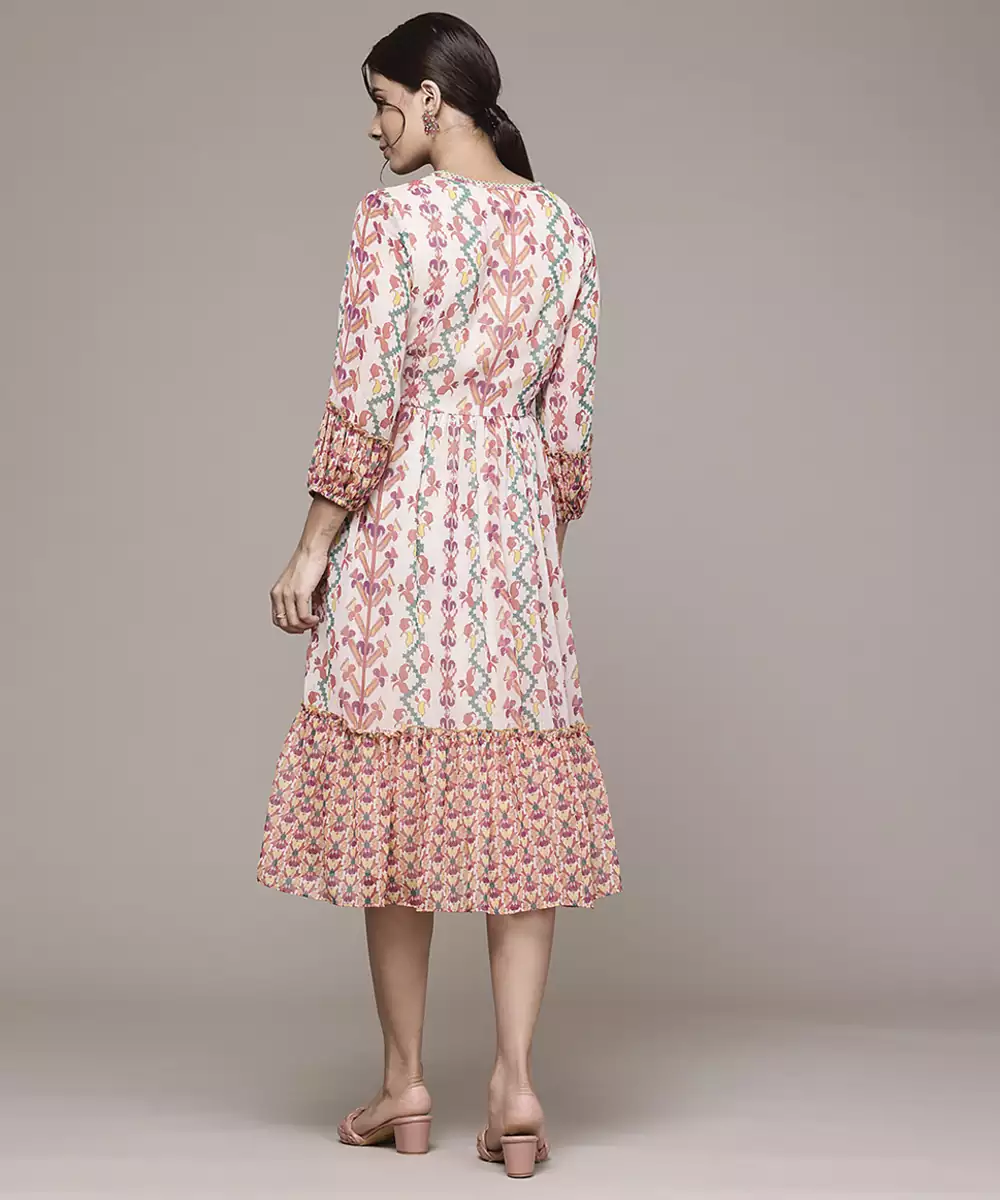 This Multicolor Chiffon Dress Features Printed Work On Lightweight And Breathable Fabric. The Chiffon Material Offers A Soft, Flowy Drape That Ensures Comfort And Ease Of Movement. Full Sleeves Provide Balanced Coverage And Structure. The Printed Design Adds Visual Detail While Maintaining A Cohesive Look Across The Garment. The Stitched Construction Ensures A Ready To Wear Form. Suitable For Casual Gatherings And Festive Occasions, This Dress Combines Comfort With A Contemporary Ethnic Aesthetic.