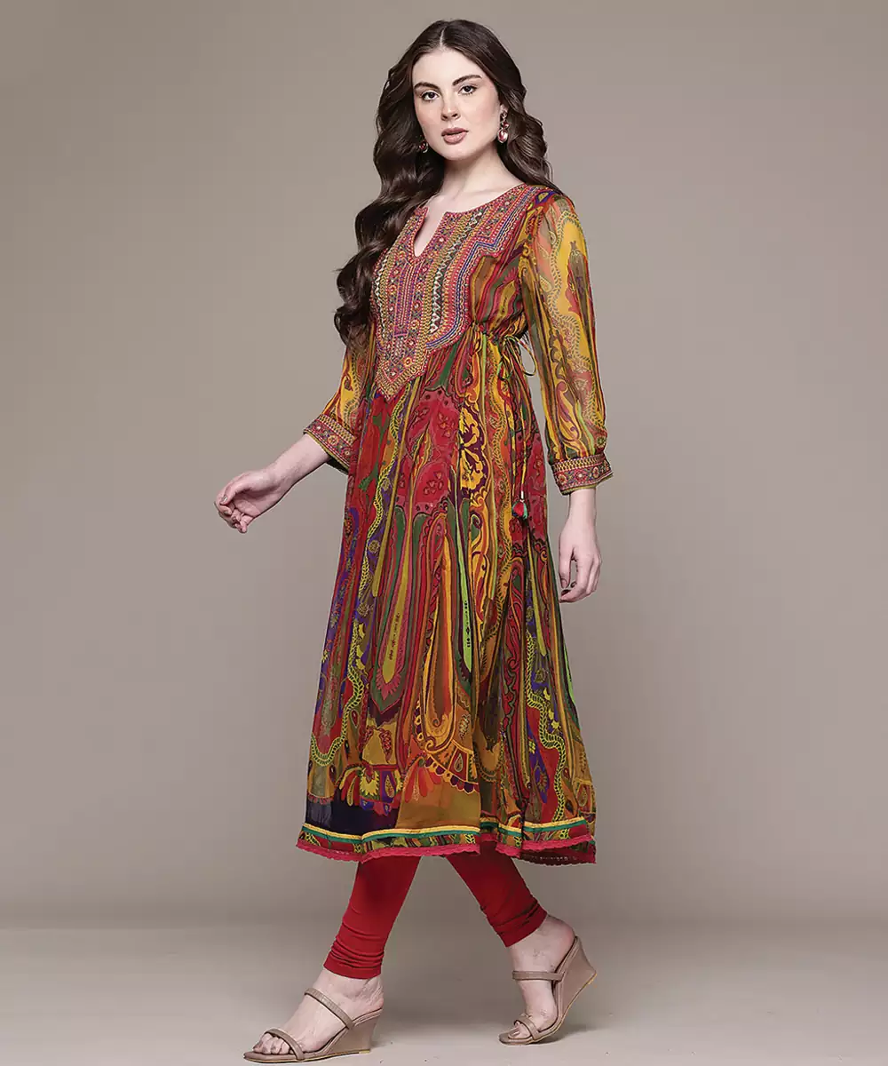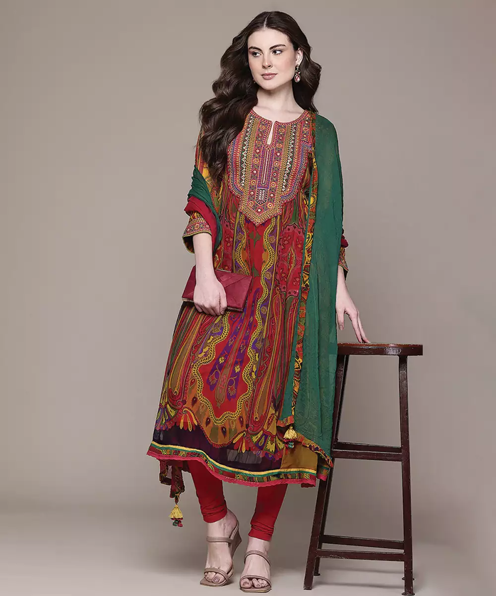 This Multicolor Embroidered Chiffon Kurta Set Features Vibrant Hues With Intricate Detailing. The Lightweight Fabric Ensures Comfort, While The Elegant Silhouette Adds Grace. Perfect For Festive Occasions, It Offers A Lively And Sophisticated Ethnic Look With A Modern Touch.