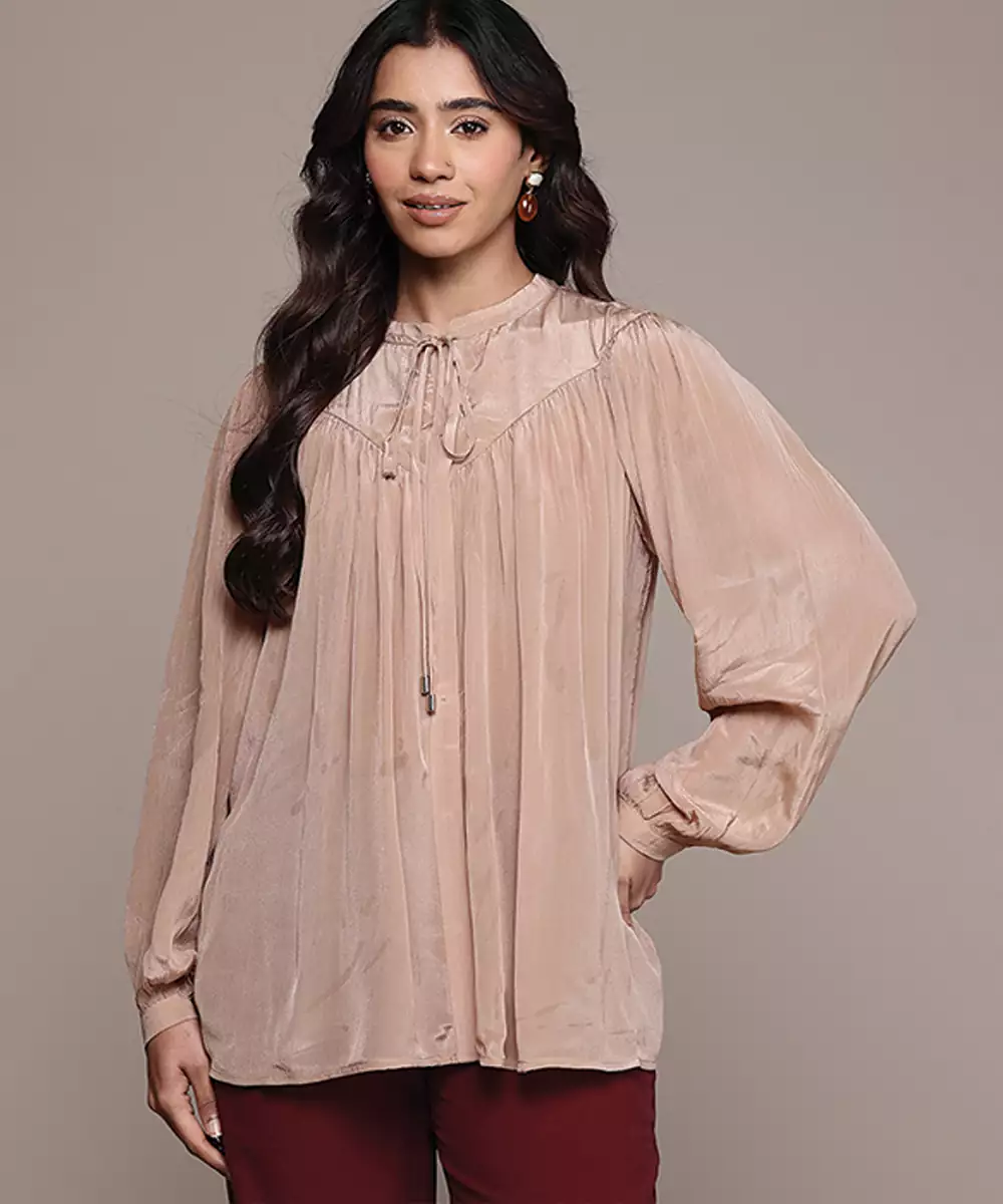 Soft And Elegant, This Peach Crepe Full Sleeves Top Offers A Smooth Texture With A Graceful Fit. The Subtle Hue Enhances Its Feminine Charm, Making It Perfect For Both Casual And Workwear Styling. A Versatile Wardrobe Essential That Blends Comfort With Understated Sophistication.