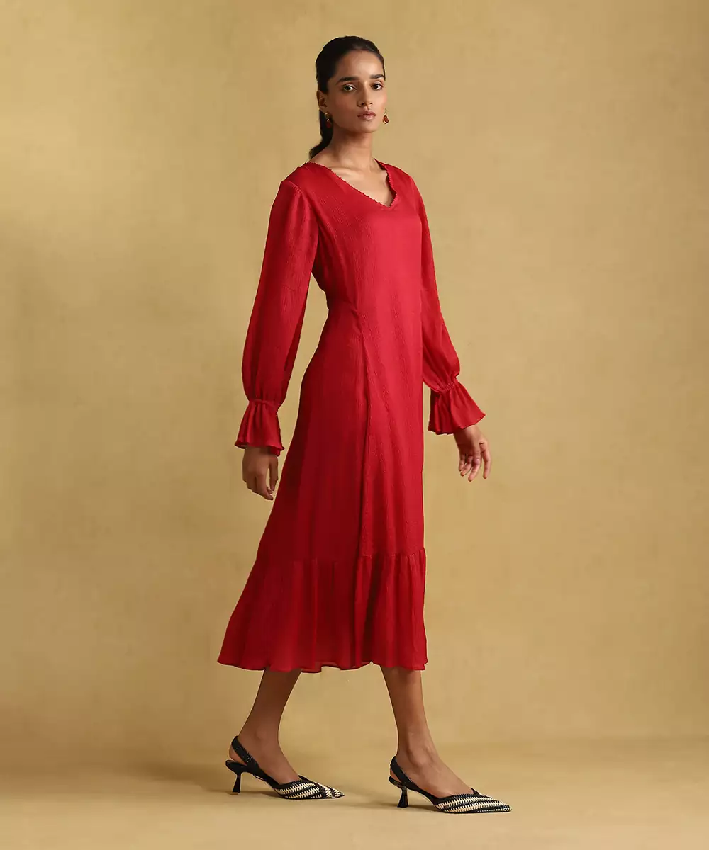 Pink Solid Dress With Balloon Sleeves . Colour: Pink Fabric: Crimp Satin Components: 1 Dress Work: Solid