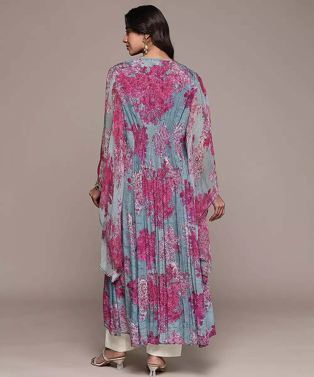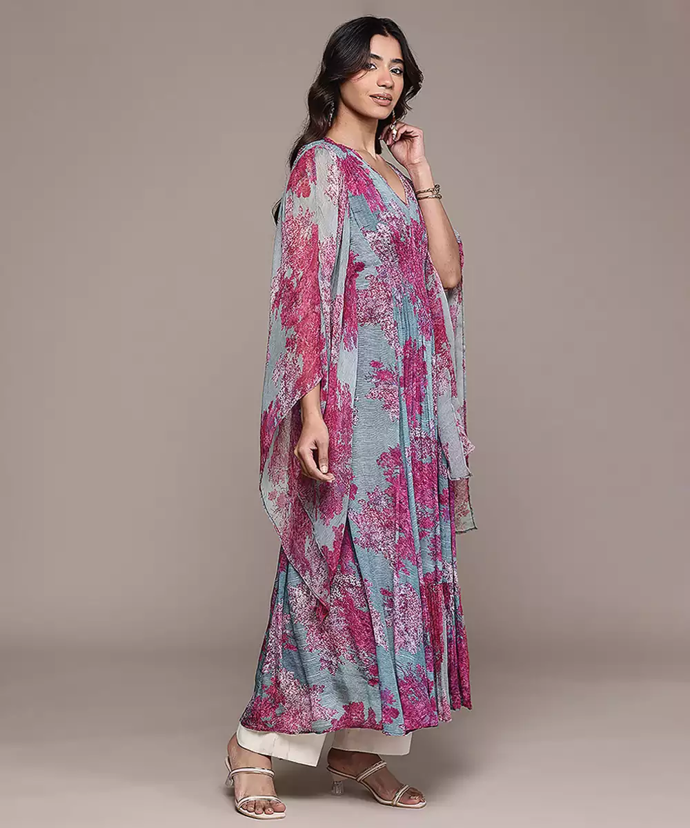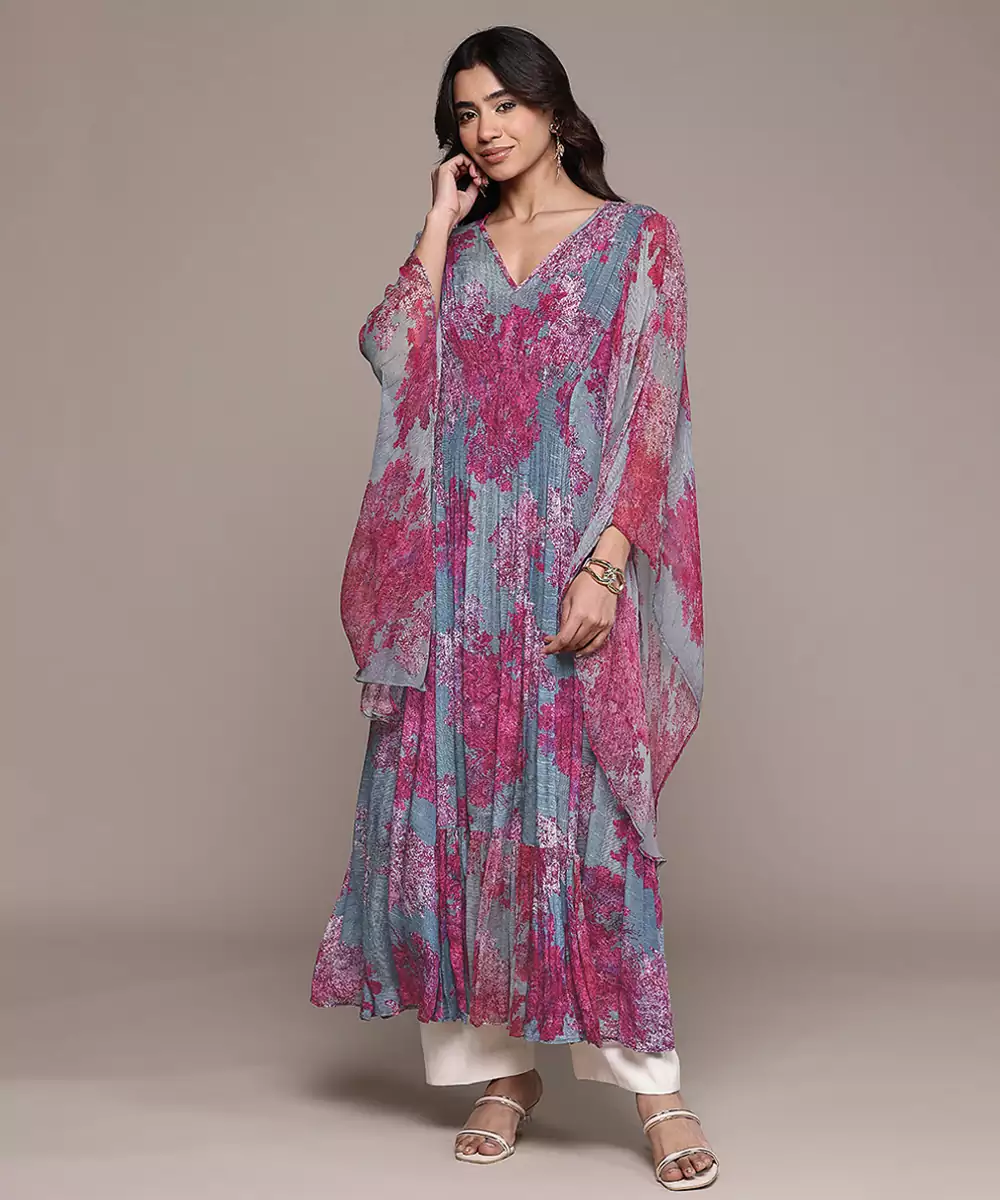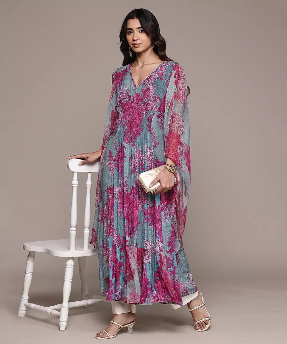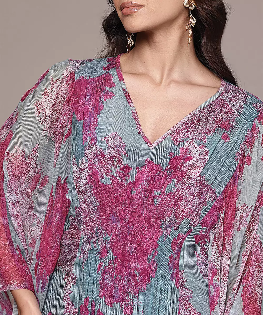 This Purple Printed Chinon Kaftan Offers A Graceful Silhouette With Soft, Flowy Fabric. The Elegant Prints Enhance Its Appeal, Making It Perfect For Casual Outings Or Resort Wear. A Comfortable Yet Stylish Piece That Blends Modern Ease With Ethnic Charm.