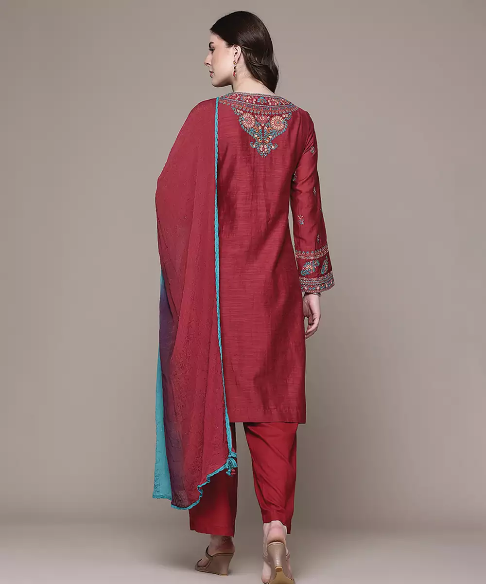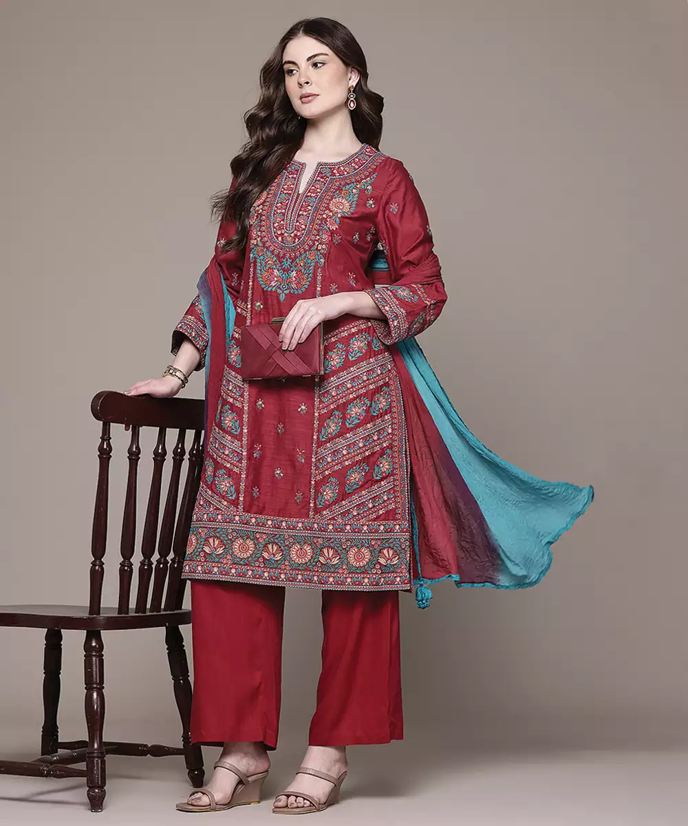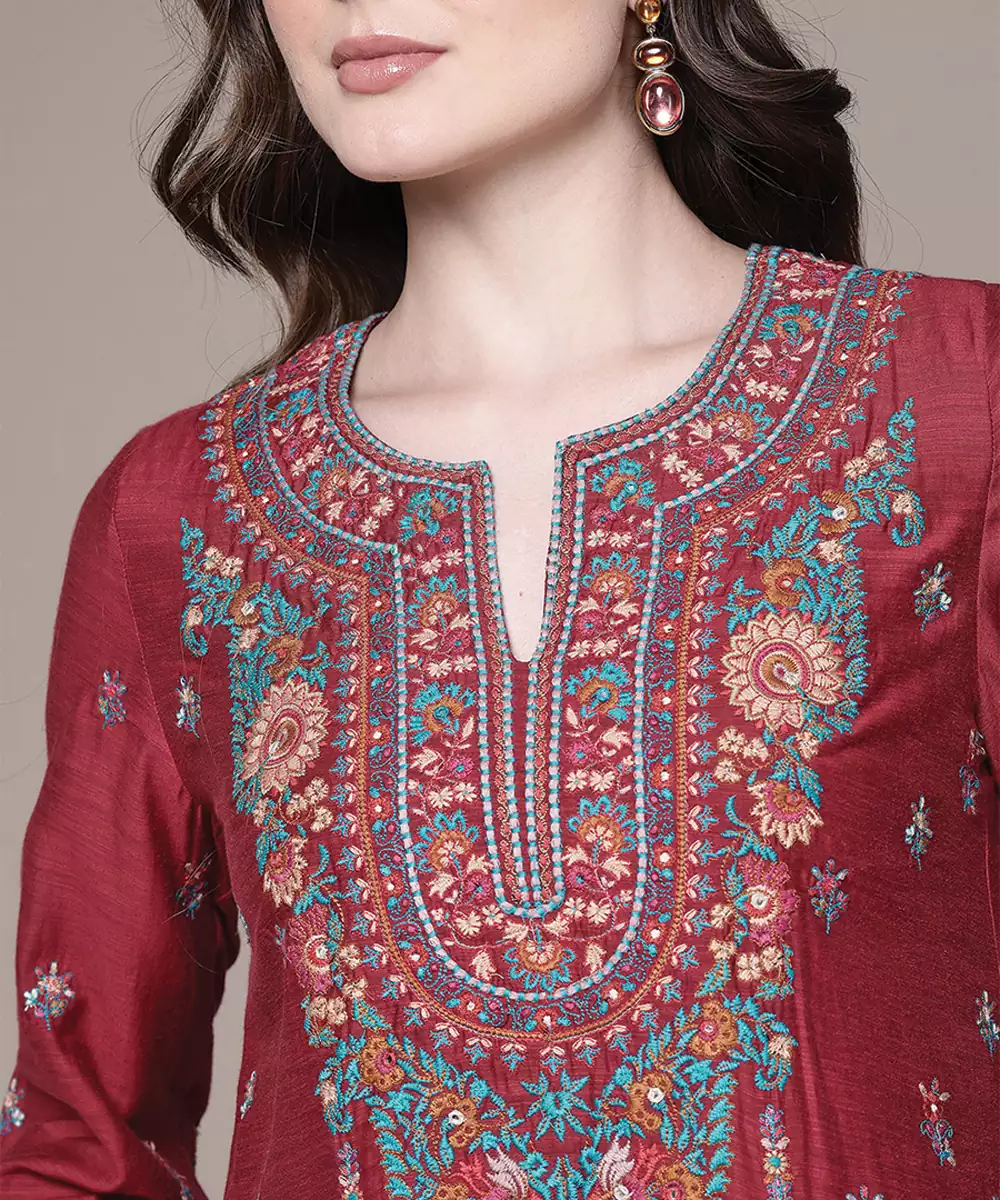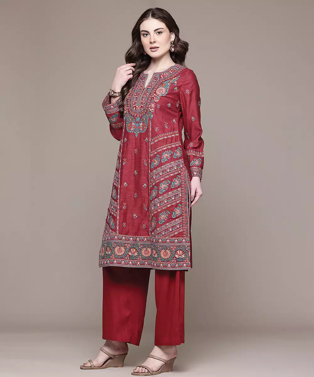 This Red Embroidered Chanderi Kurta Set Features A Subtle Sheen With Intricate Detailing. The Lightweight Fabric Ensures Comfort While Enhancing Its Festive Appeal. Perfect For Celebrations, It Offers A Graceful And Traditional Look With A Refined And Elegant Finish.