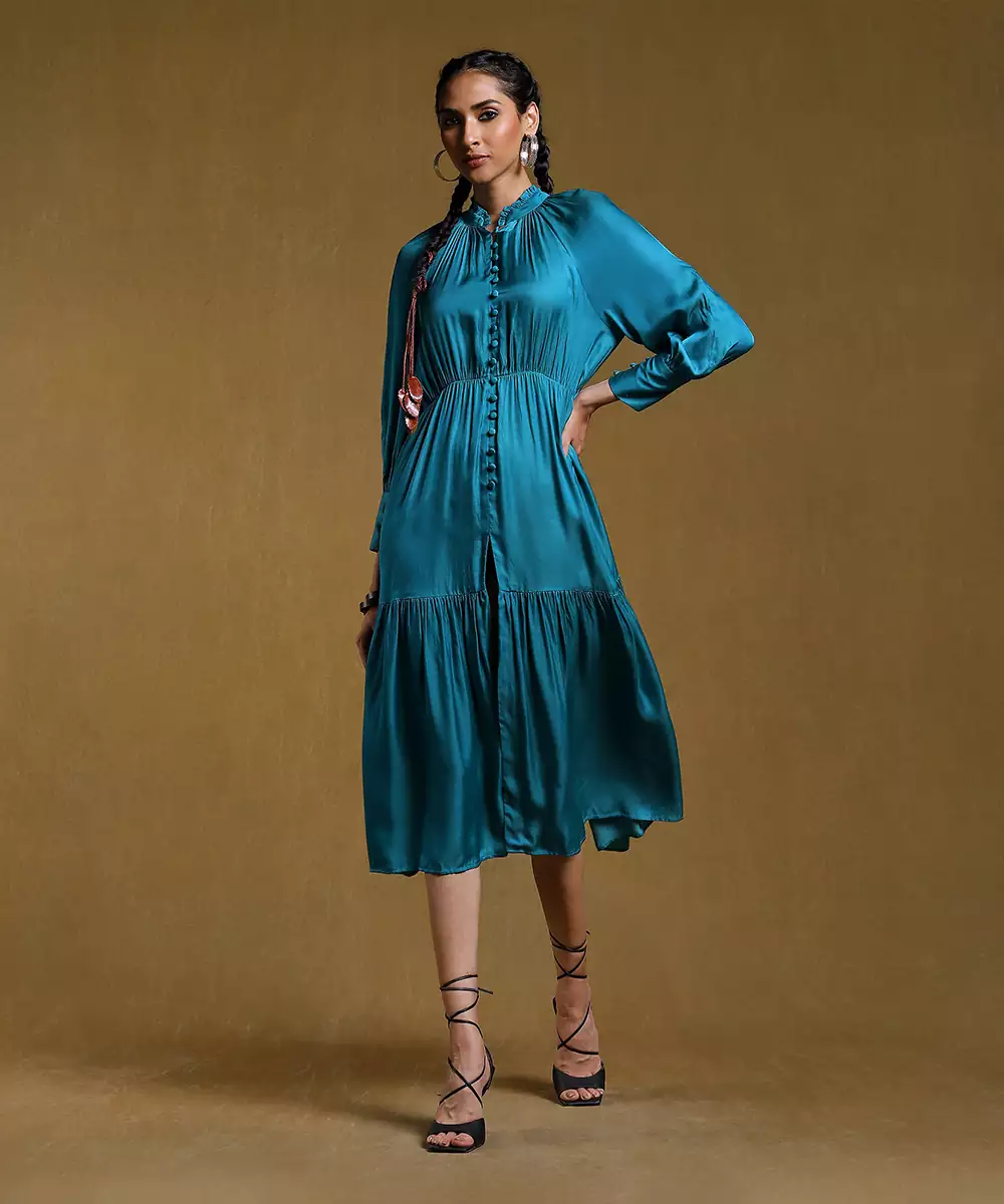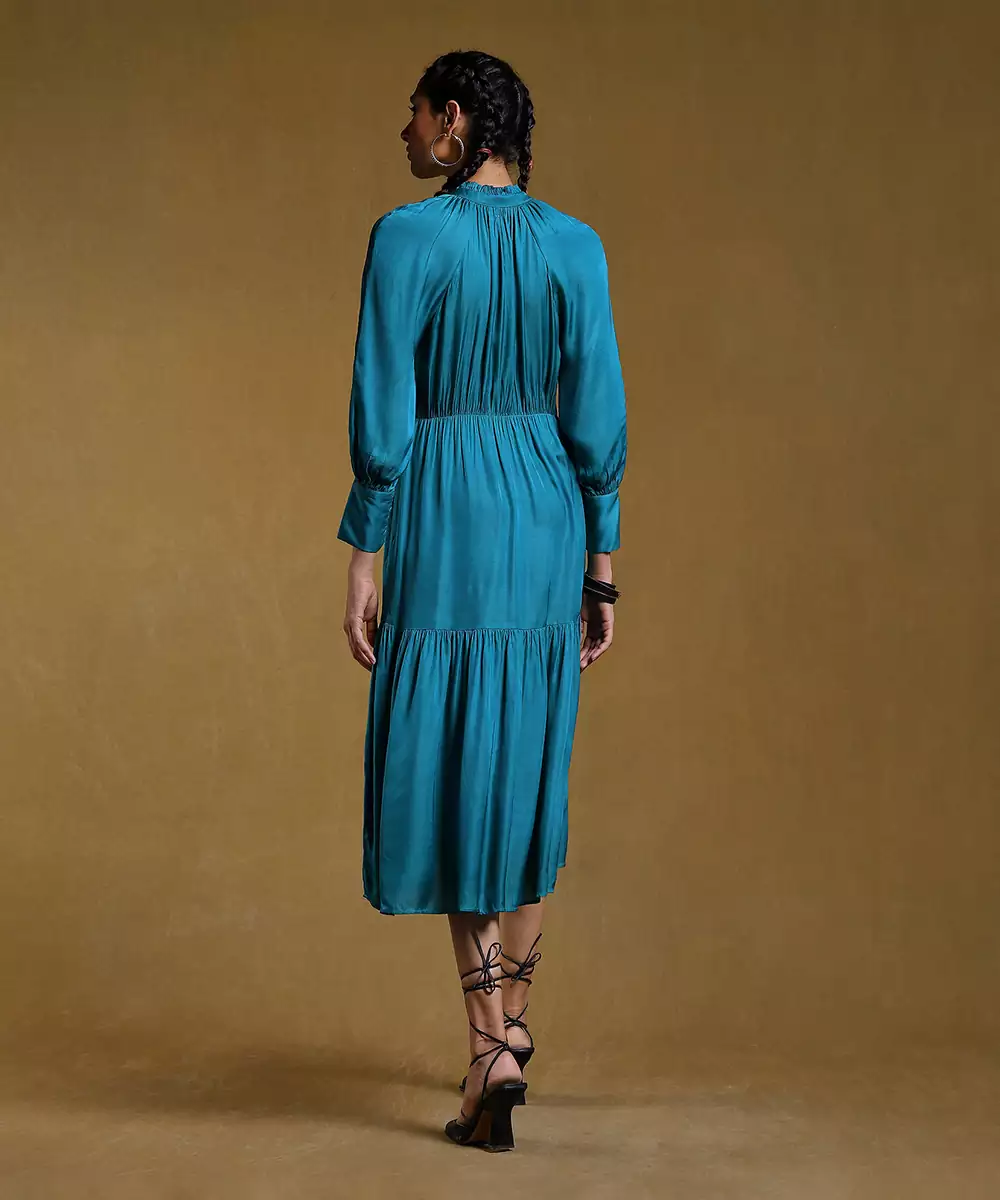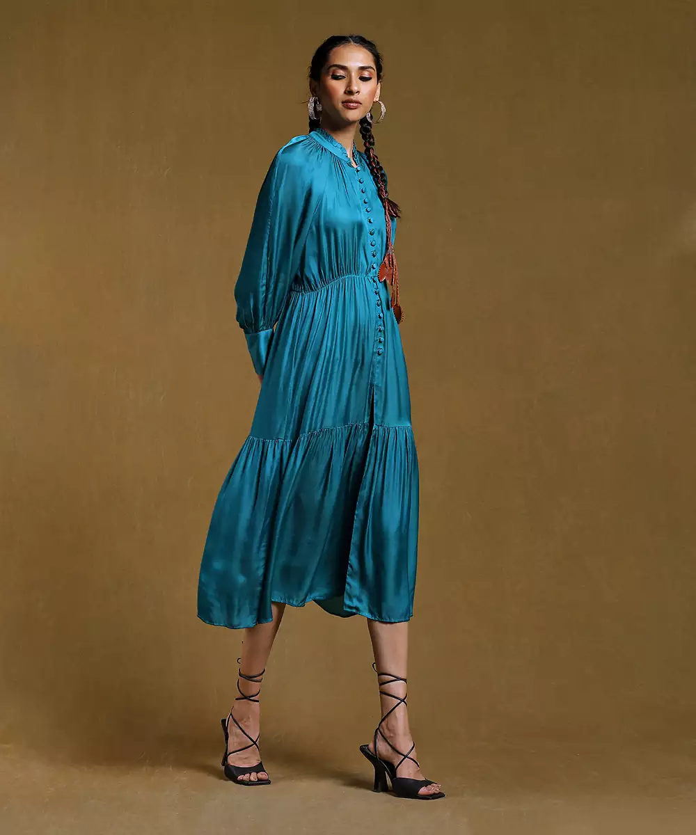 Teal Tiered Satin Dress .