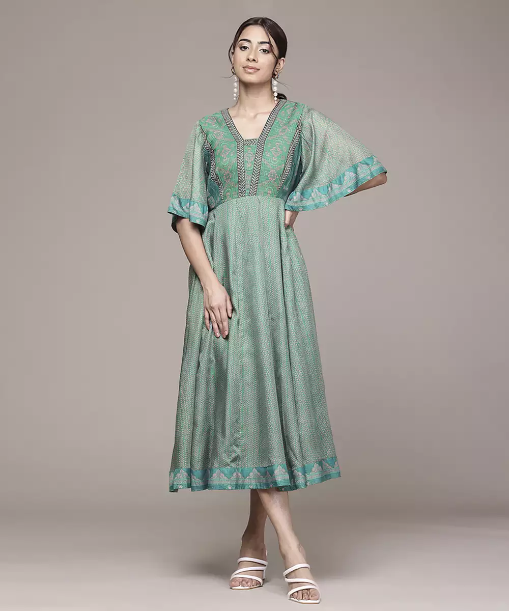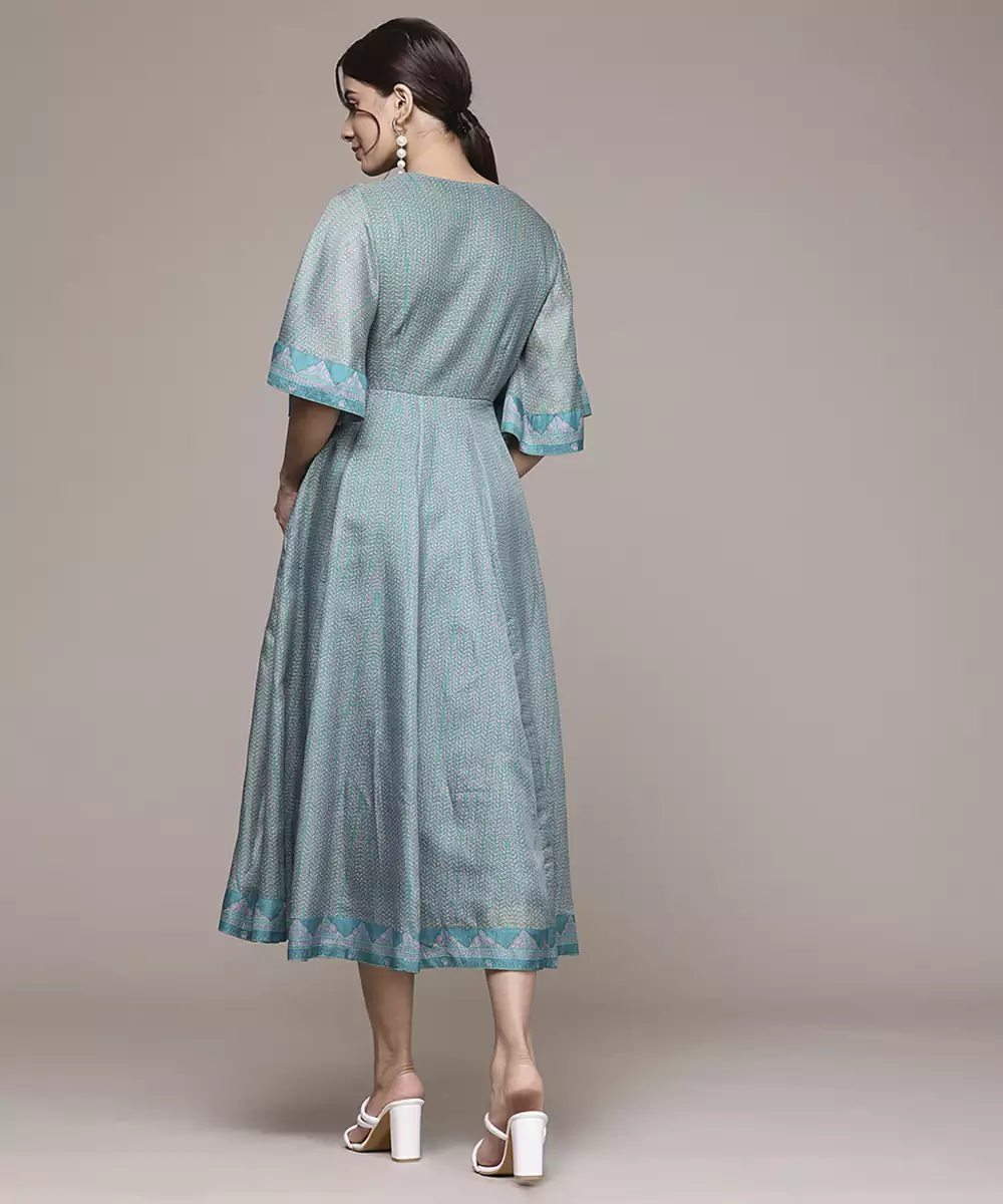 Crafted From Viscose Fabric, This Teal Dress Includes Floral Embroidered Work That Enhances Its Elegant Appeal. The Lightweight Texture Ensures Comfort Throughout Extended Wear. Designed With Half Sleeves, It Offers A Structured Yet Relaxed Fit. The Embroidery Adds Depth And Visual Richness While Maintaining Balance Across The Design. Ideal For Festive Gatherings And Semi Formal Occasions, This Stitched Dress Blends Traditional Craftsmanship With Modern Simplicity.