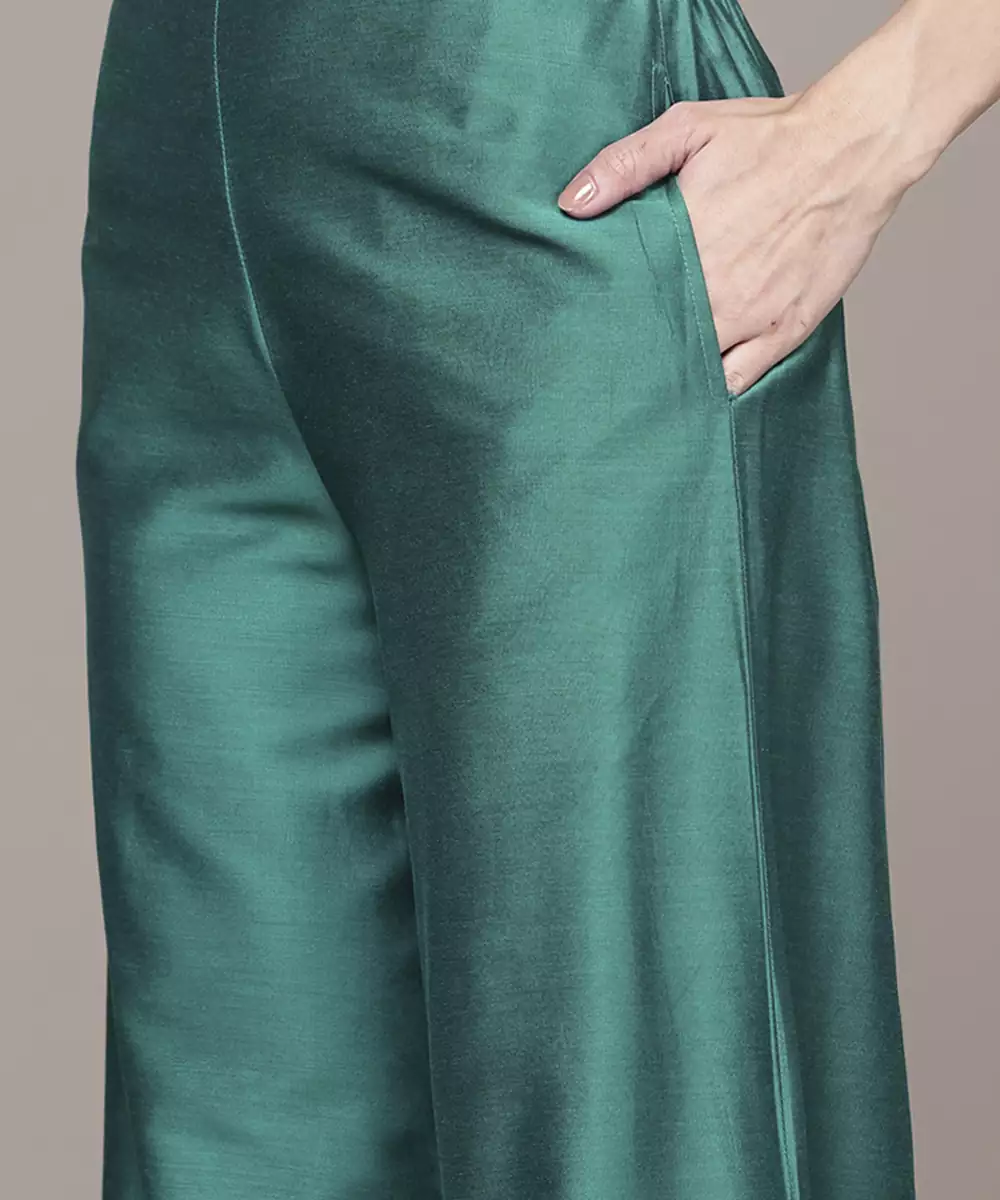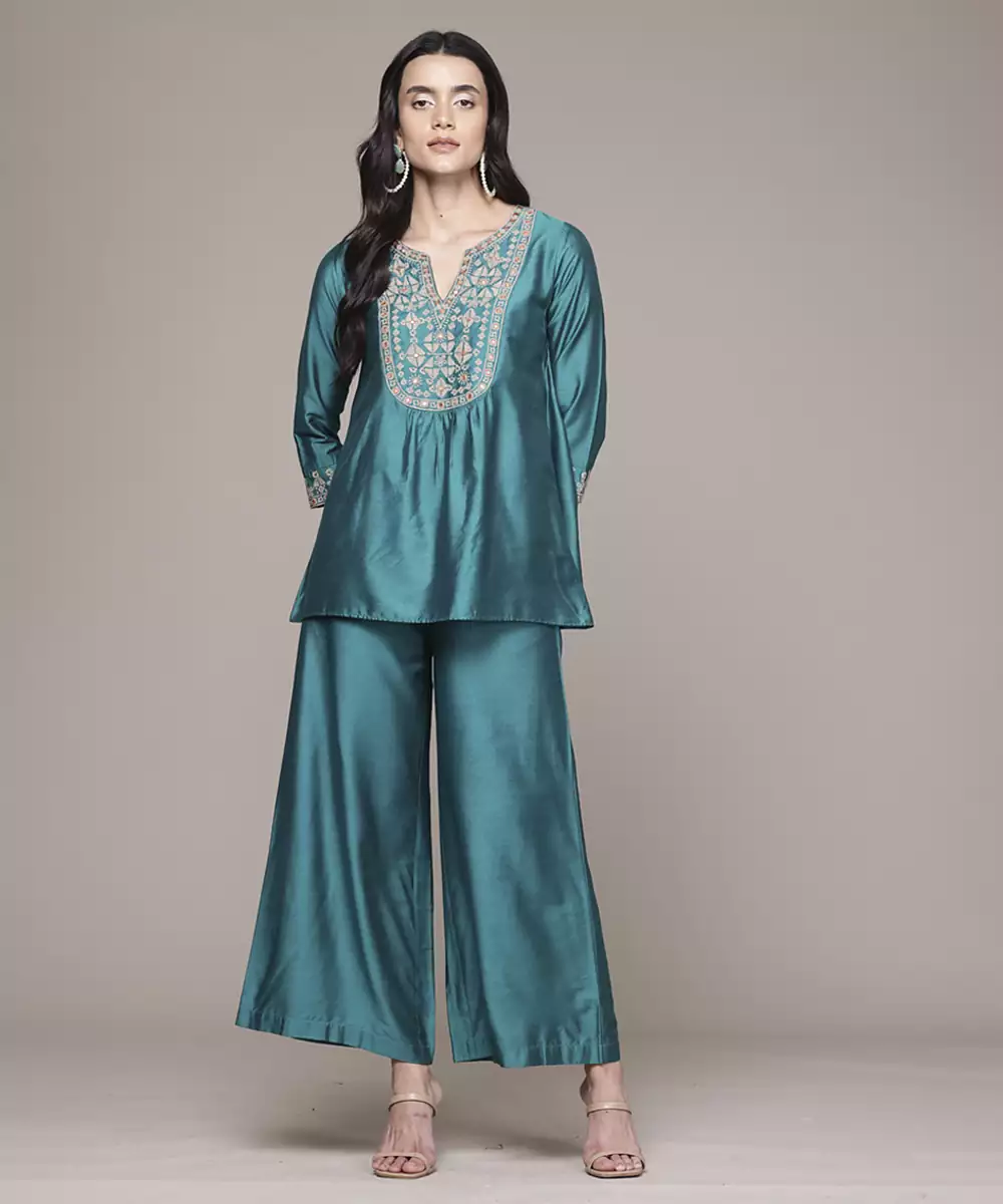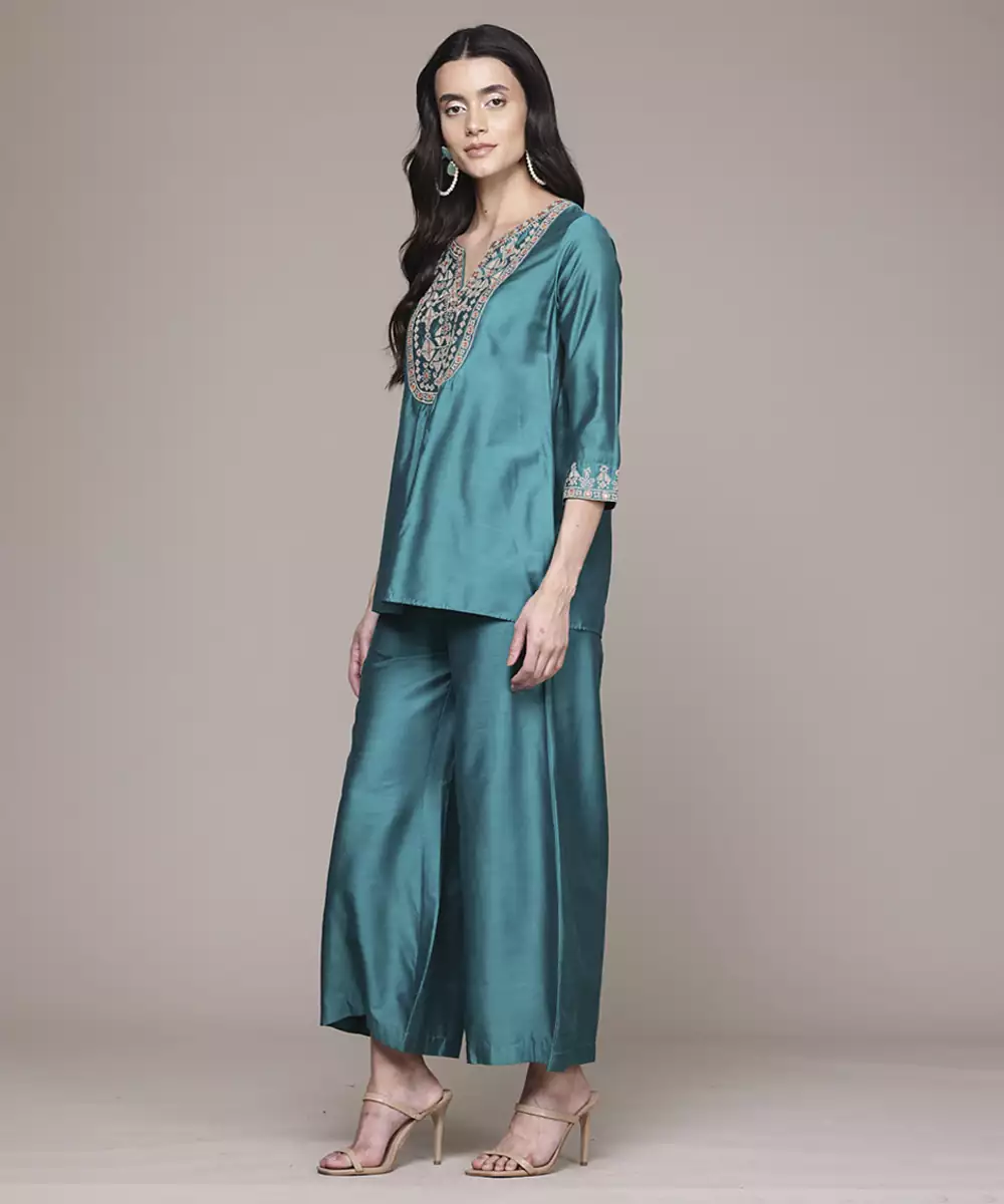 This Teal Viscose Kurta Set Features Embroidered Work Across A Soft And Breathable Fabric. The Viscose Material Provides A Smooth Drape And Comfortable Fit Suitable For Festive And Formal Occasions. The Set Includes A Kurta, Matching Bottoms, And A Dupatta For Coordinated Styling. Quarter Sleeves Offer A Balanced And Structured Silhouette. The Embroidery Adds Refined Detailing While Maintaining A Clean Appearance. The Stitched Construction Ensures A Ready To Wear Form. The Teal Shade Supports Versatile Ethnic Styling With Various Accessories.