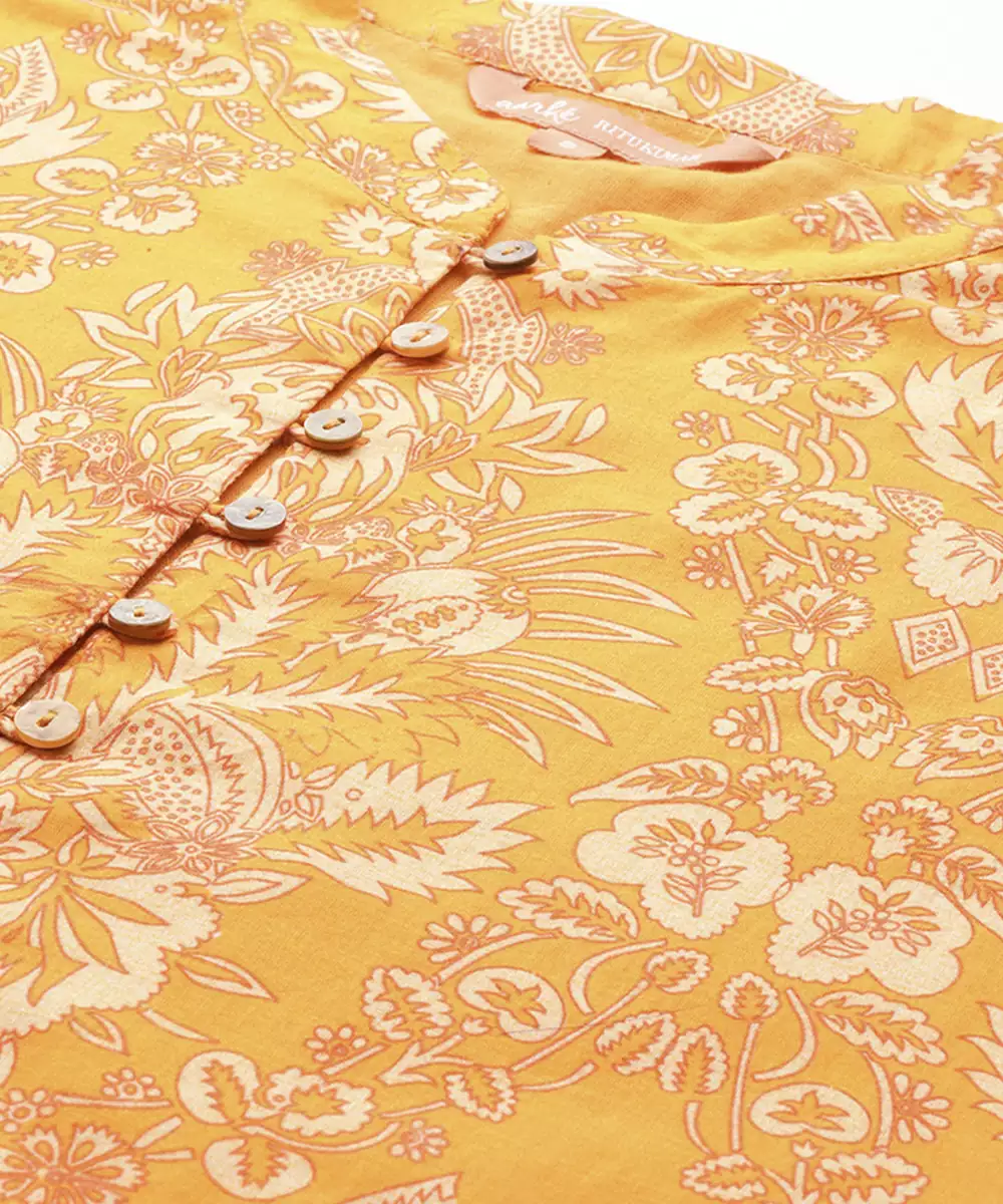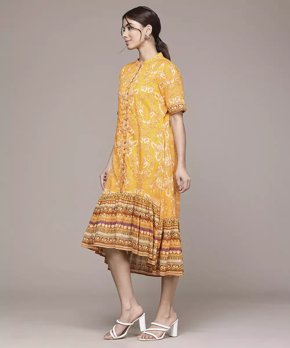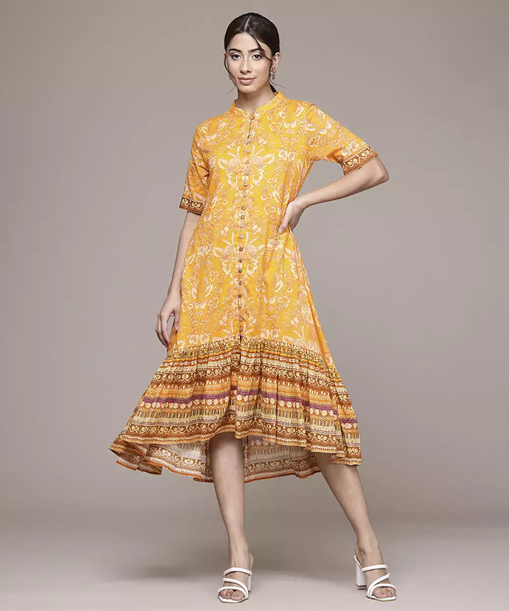 This Yellow Cotton Dress Features Printed Work On Soft And Breathable Fabric. The Cotton Material Ensures All Day Comfort With A Lightweight And Natural Feel. Half Sleeves Provide A Balanced And Relaxed Silhouette. The Printed Detailing Adds Visual Interest While Maintaining A Clean And Cohesive Look. The Stitched Construction Ensures A Ready To Wear Form. The Yellow Shade Enhances Its Cheerful Appeal, Making It Suitable For Casual Outings And Sunny Gatherings.
