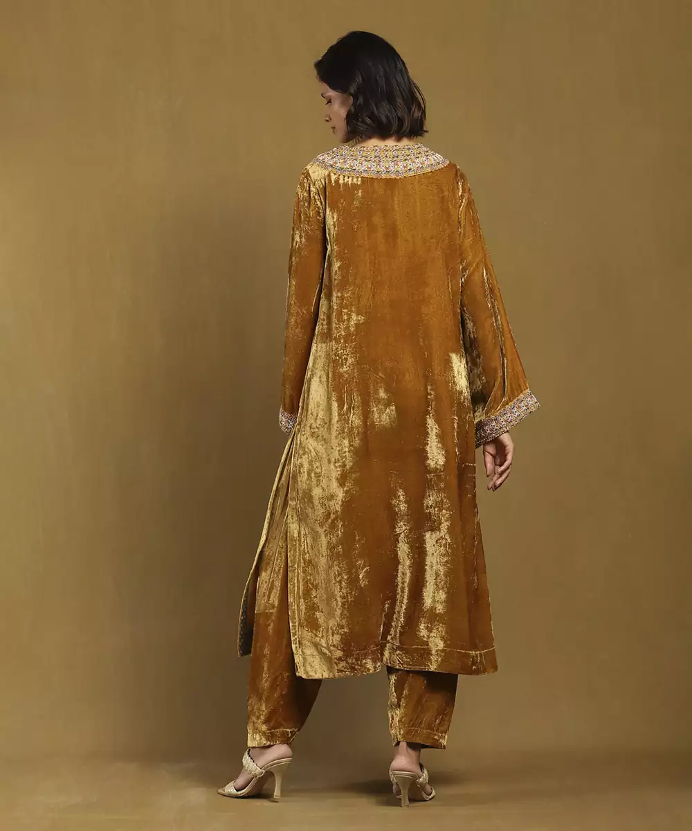 Yellow Pushp Kurta With Pant And Dupatta Colour: Yellow Fabric: Velvet Components : 1 Kurta / 1 Pants / 1 Dupatta