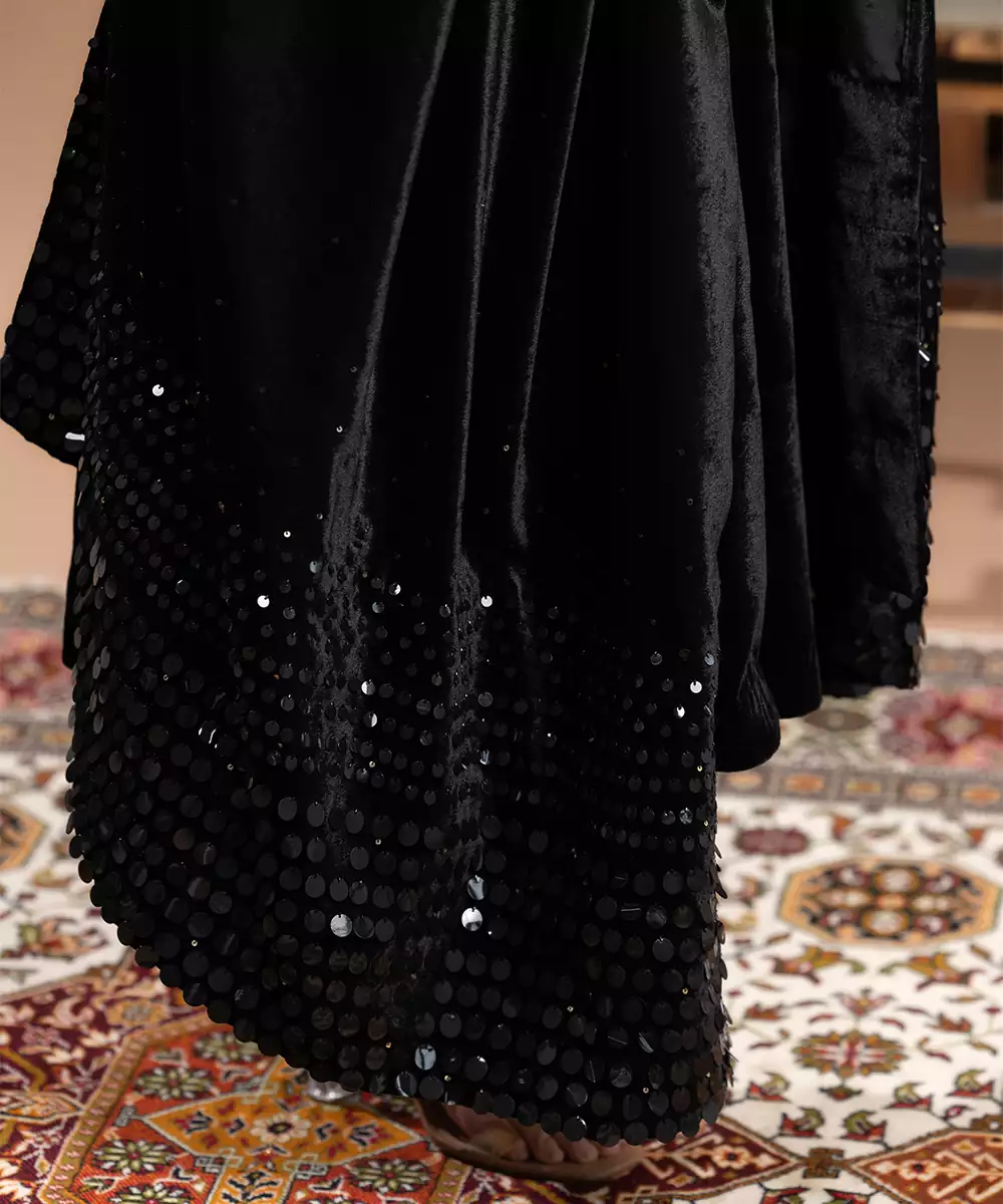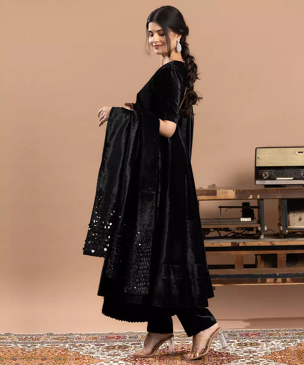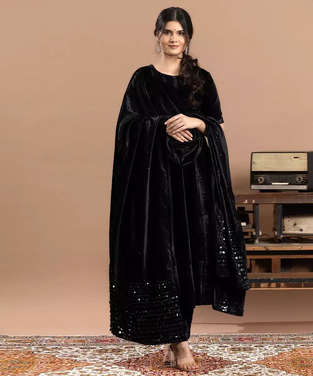 Luxurious And Elegant, This Black Embroidered Velvet Anarkali Set Is Crafted From Rich Velvet Fabric, Offering A Soft, Plush Feel And Graceful Drape. Adorned With Intricate Embroidery, It Exudes Sophistication And Charm. Perfect For Weddings, Festive Celebrations, And Special Occasions, Adding A Regal Touch To Your Ethnic Wardrobe.