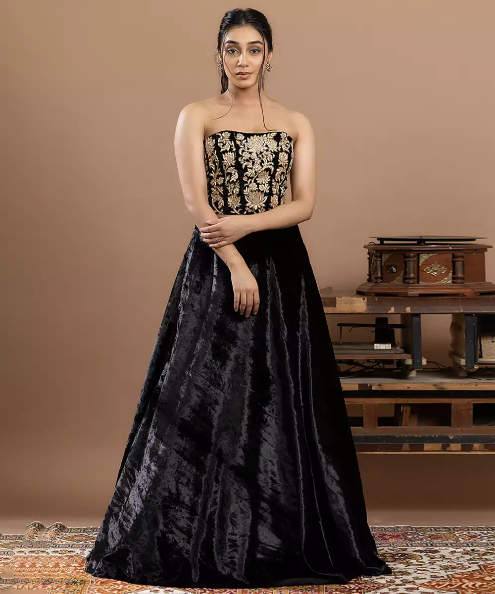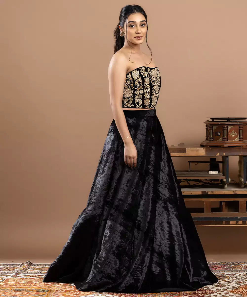 Make A Bold Style Statement At Weddings, Receptions, And Festive Celebrations With This Black Embroidered Velvet Lehenga With Rich Work — The Perfect Blend Of Luxury And Ethnic Allure! Crafted From Sumptuous Velvet, This Lehenga Features Intricate Embroidery That Adds Depth, Texture, And Captivating Shimmer To Your Ensemble. The Rich Black Hue Paired With Detailed Thread And Sequin Work Makes It A Standout Choice For Evening Events, Sangeet Nights, Or Glamorous Cultural Occasions. This Set Includes A Matching Embroidered Blouse And Graceful Dupatta To Complete Your Celebration Ready Look.