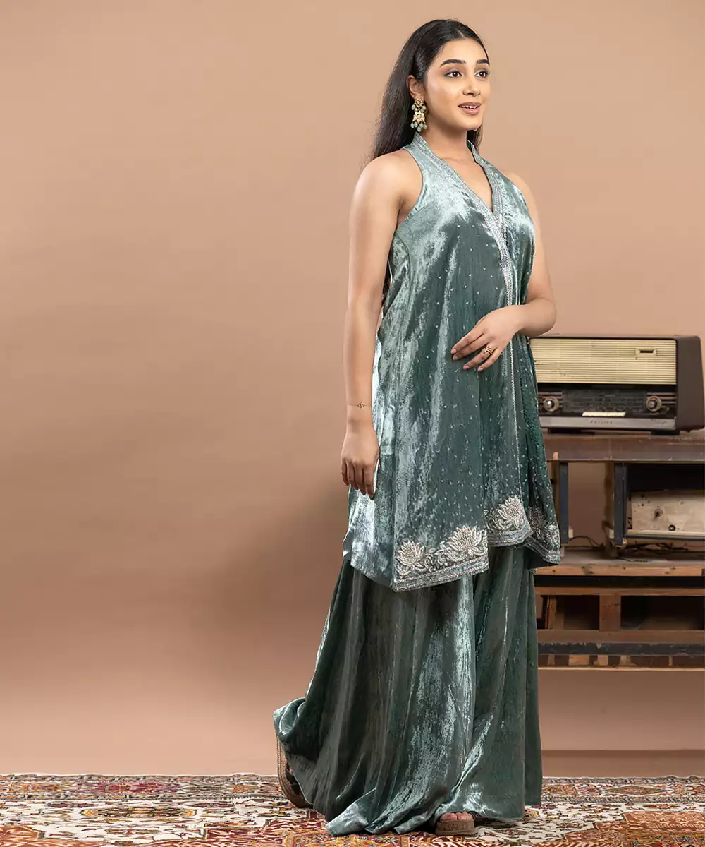 Elegant And Vibrant, This Blue Embroidered Tissue Sharara Set Is Crafted From Lightweight Tissue Fabric With A Delicate Shimmer. Featuring Intricate Embroidery, It Includes A Flared Sharara And Matching Kurta For A Graceful Silhouette. Perfect For Weddings, Festive Occasions, And Traditional Celebrations, Adding A Touch Of Sophistication To Your Ethnic Wardrobe.