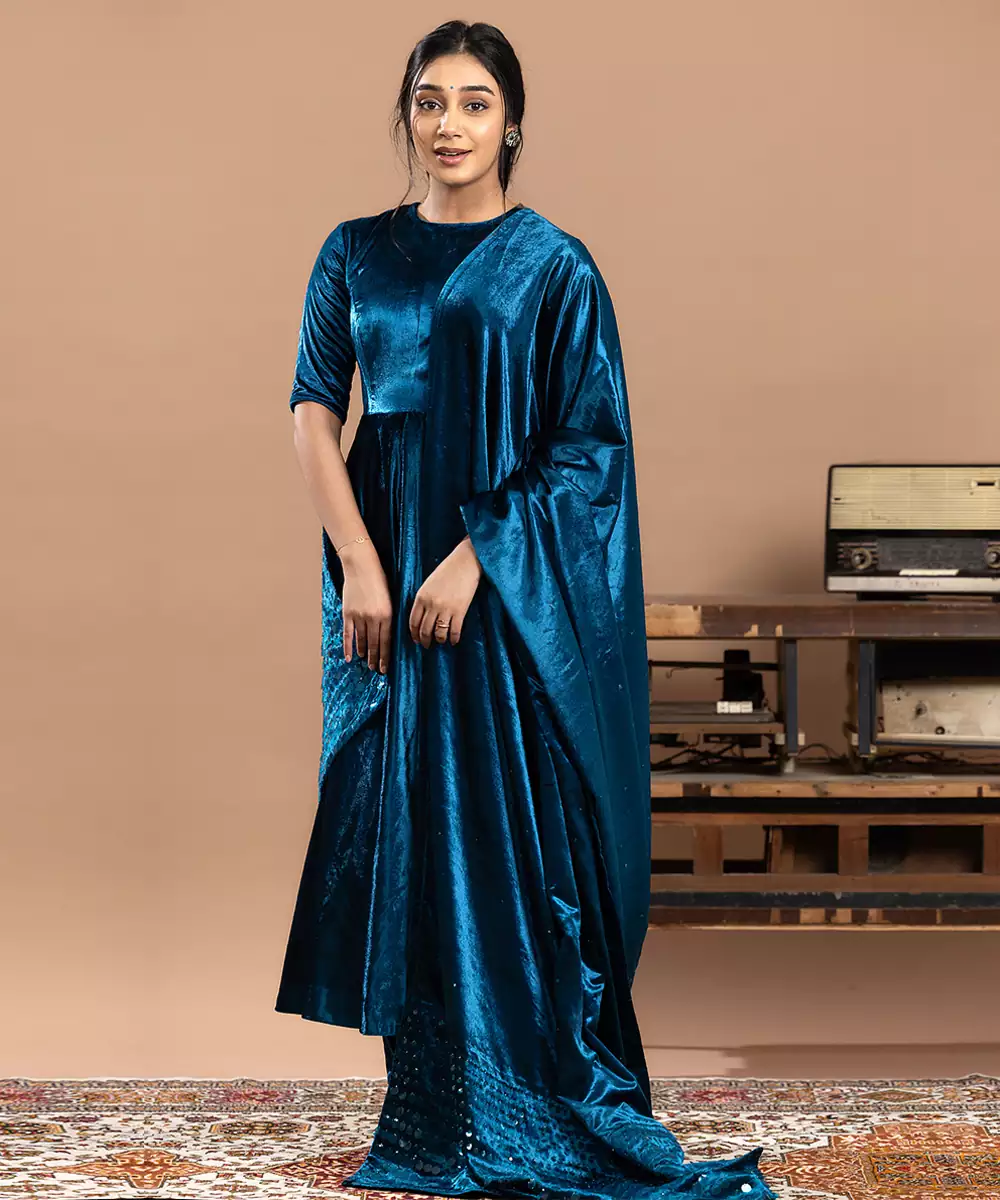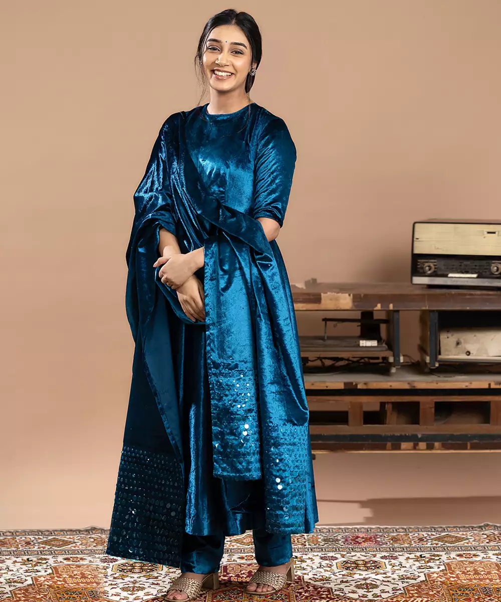 Luxurious And Elegant, This Blue Embroidered Velvet Anarkali Set Is Crafted From Rich Velvet Fabric, Offering A Soft, Plush Feel And Graceful Drape. Adorned With Intricate Embroidery, It Exudes Sophistication And Charm. Perfect For Weddings, Festive Celebrations, And Special Occasions, Adding A Regal Touch To Your Ethnic Wardrobe.