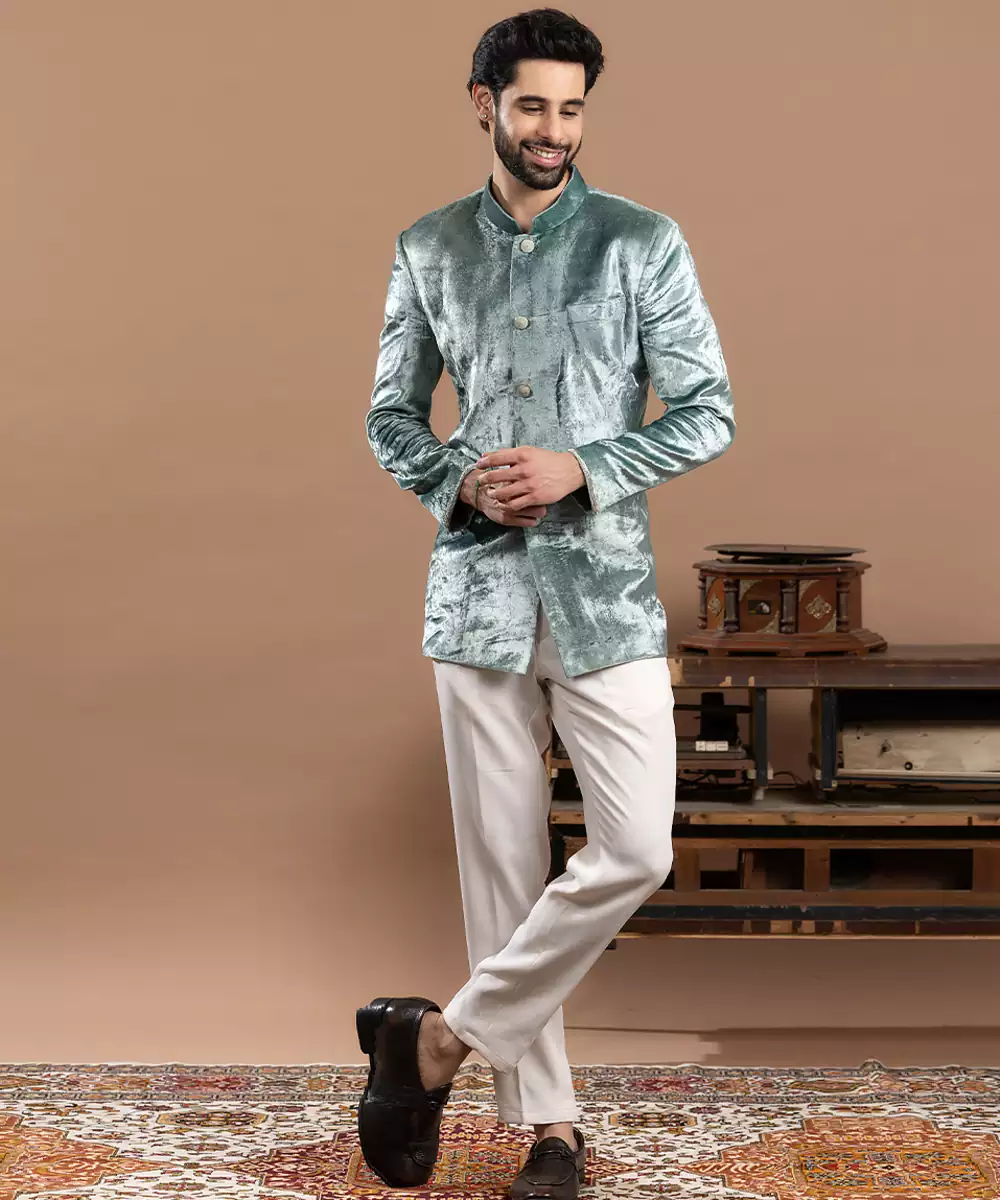 Blue Velvet Bandhgala Set Designed For Regal Elegance And Modern Sophistication. Crafted From Plush Velvet, It Features A Tailored Bandhgala Silhouette That Exudes Luxury. Perfect For Weddings, Festive Occasions, And Evening Celebrations, This Refined Ensemble Adds Depth, Richness, And Timeless Charm To Your Traditional Wardrobe.