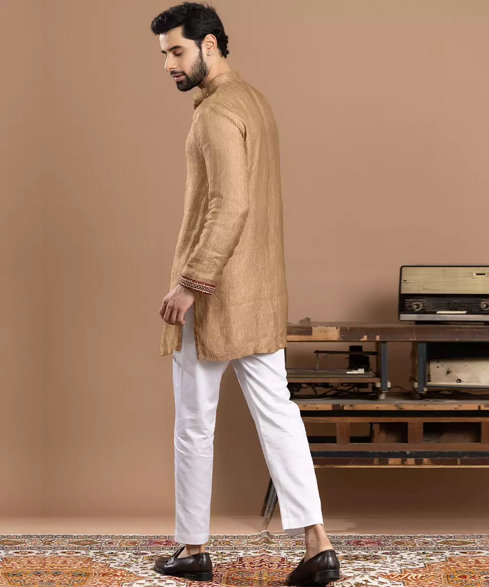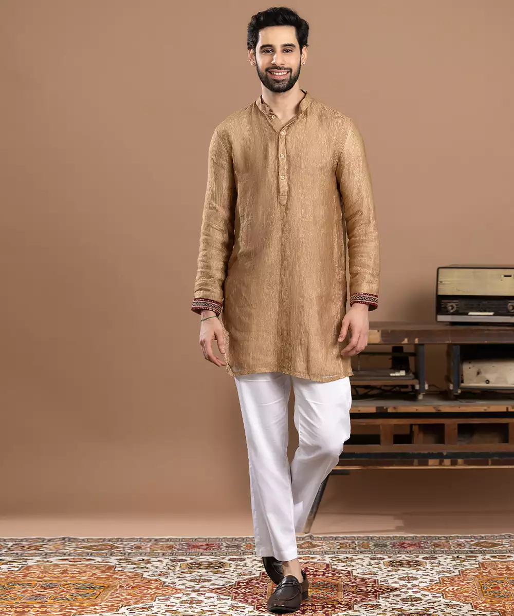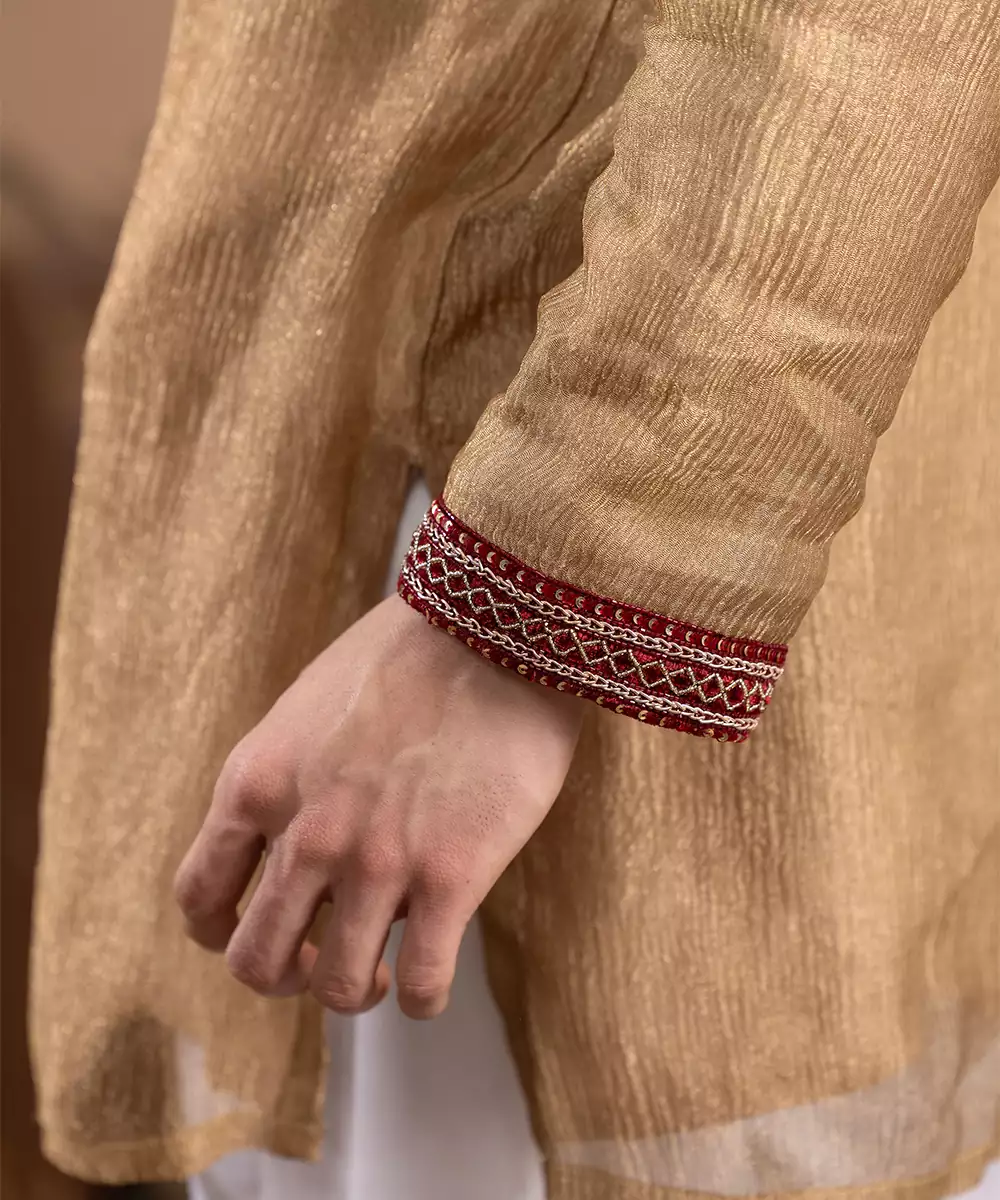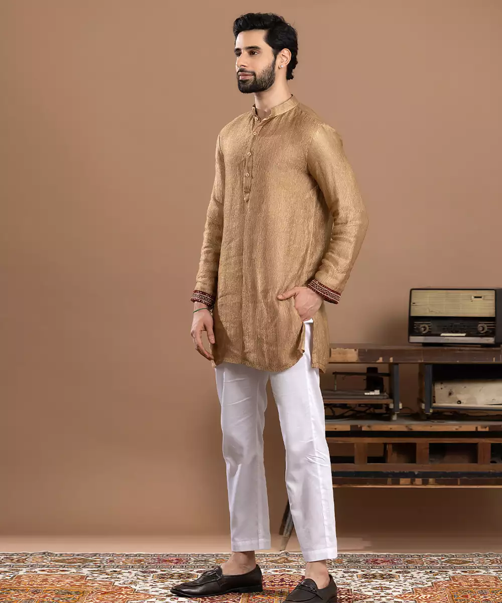 Gold Tissue Kurta Pajama Crafted For A Luminous And Elegant Festive Look. Made From Lightweight Tissue Fabric With A Rich Sheen, It Offers A Graceful Drape And Refined Appeal. Ideal For Weddings, Ceremonies, And Celebrations, This Ensemble Blends Traditional Charm With Sophisticated, Regal Style.