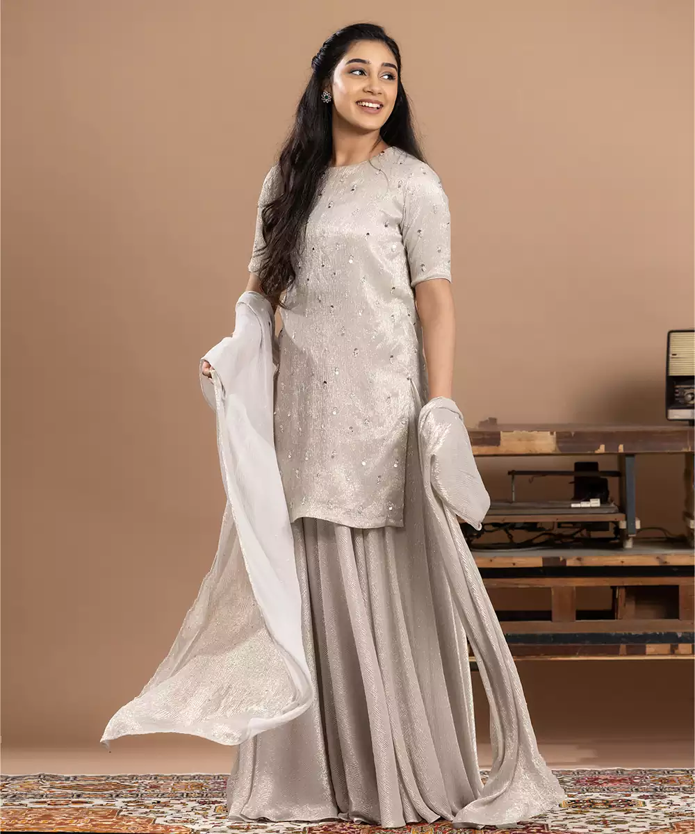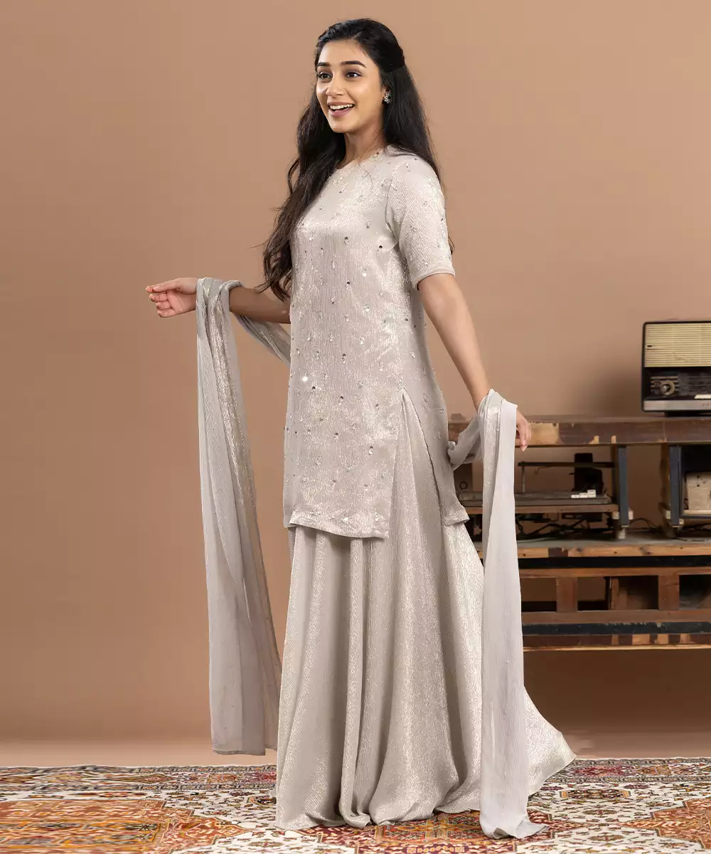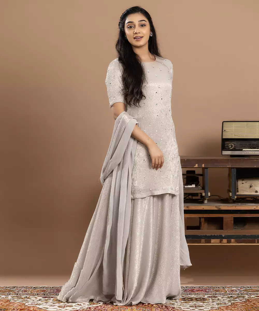 Sophisticated And Elegant, This Grey Embroidered Organza Sharara Set Is Crafted From Lightweight, Sheer Organza Fabric With A Subtle Sheen. Featuring Intricate Embroidery, It Includes A Flared Sharara And Matching Kurta For A Graceful Silhouette. Perfect For Weddings, Festive Occasions, And Traditional Celebrations, Adding Timeless Charm To Your Ethnic Wardrobe.