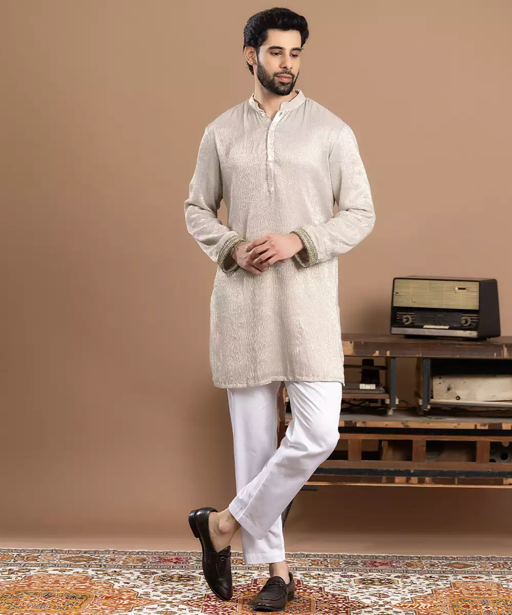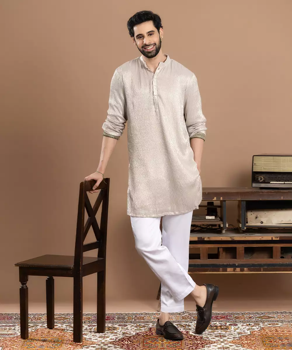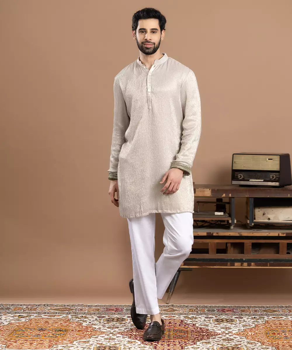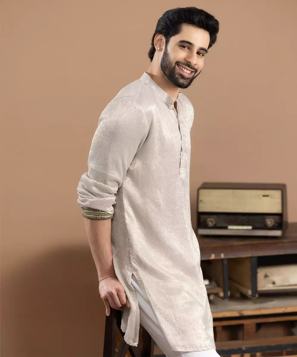 Ivory Tissue Kurta Pajama Designed For Subtle Elegance And Festive Grace. Crafted From Lightweight Tissue Fabric With A Soft Sheen, It Offers A Refined And Airy Feel. Perfect For Weddings, Traditional Functions, And Celebrations, This Classic Ensemble Reflects Timeless Style, Comfort, And Understated Ethnic Charm.