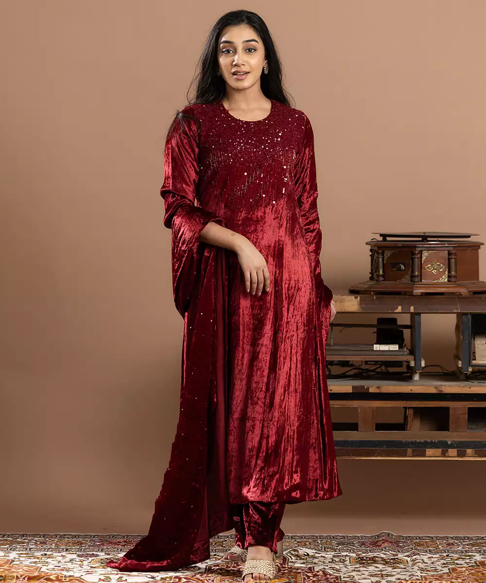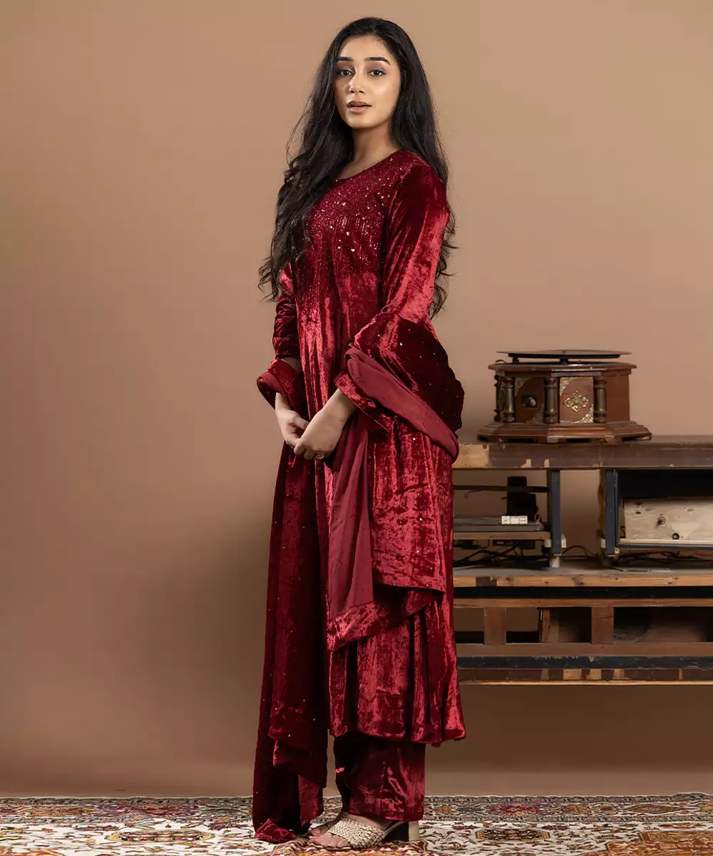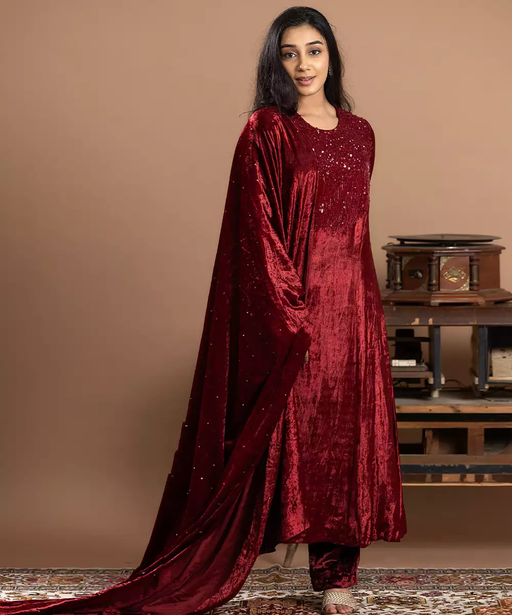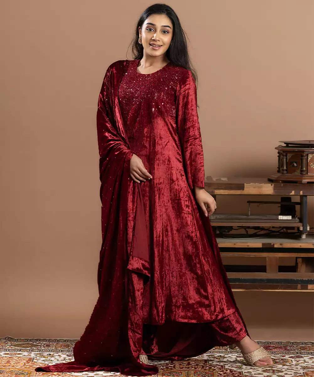 Luxurious And Elegant, This Maroon Embroidered Velvet Anarkali Set Is Crafted From Rich Velvet Fabric, Offering A Soft, Plush Feel And Graceful Drape. Adorned With Intricate Embroidery, It Exudes Sophistication And Charm. Perfect For Weddings, Festive Celebrations, And Special Occasions, Adding A Regal Touch To Your Ethnic Wardrobe.