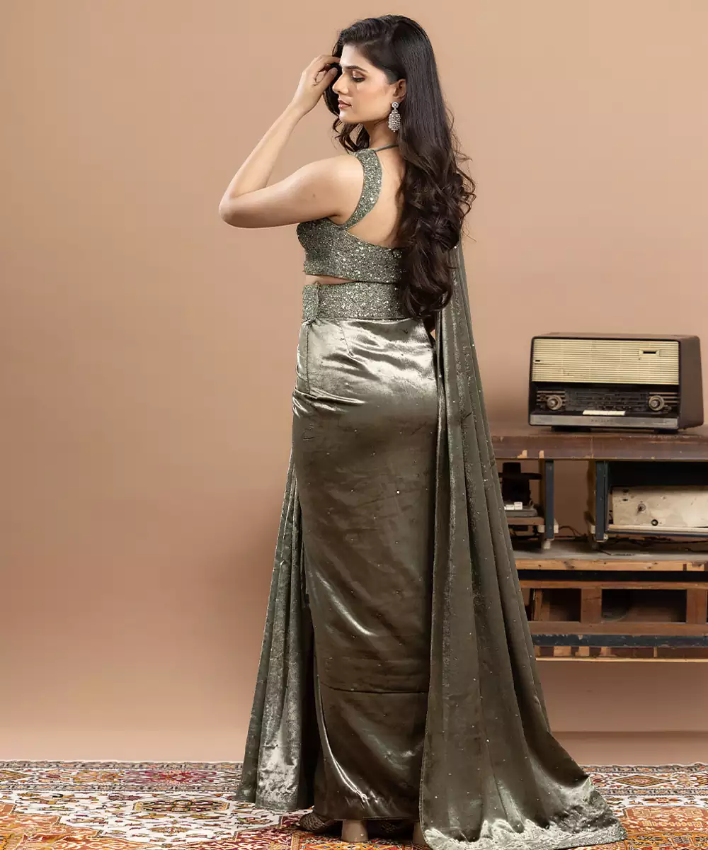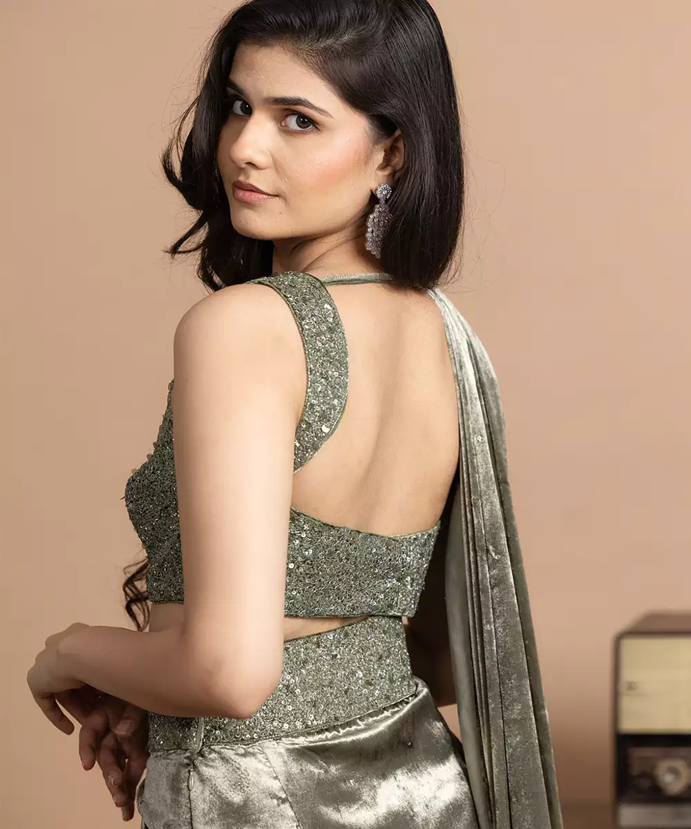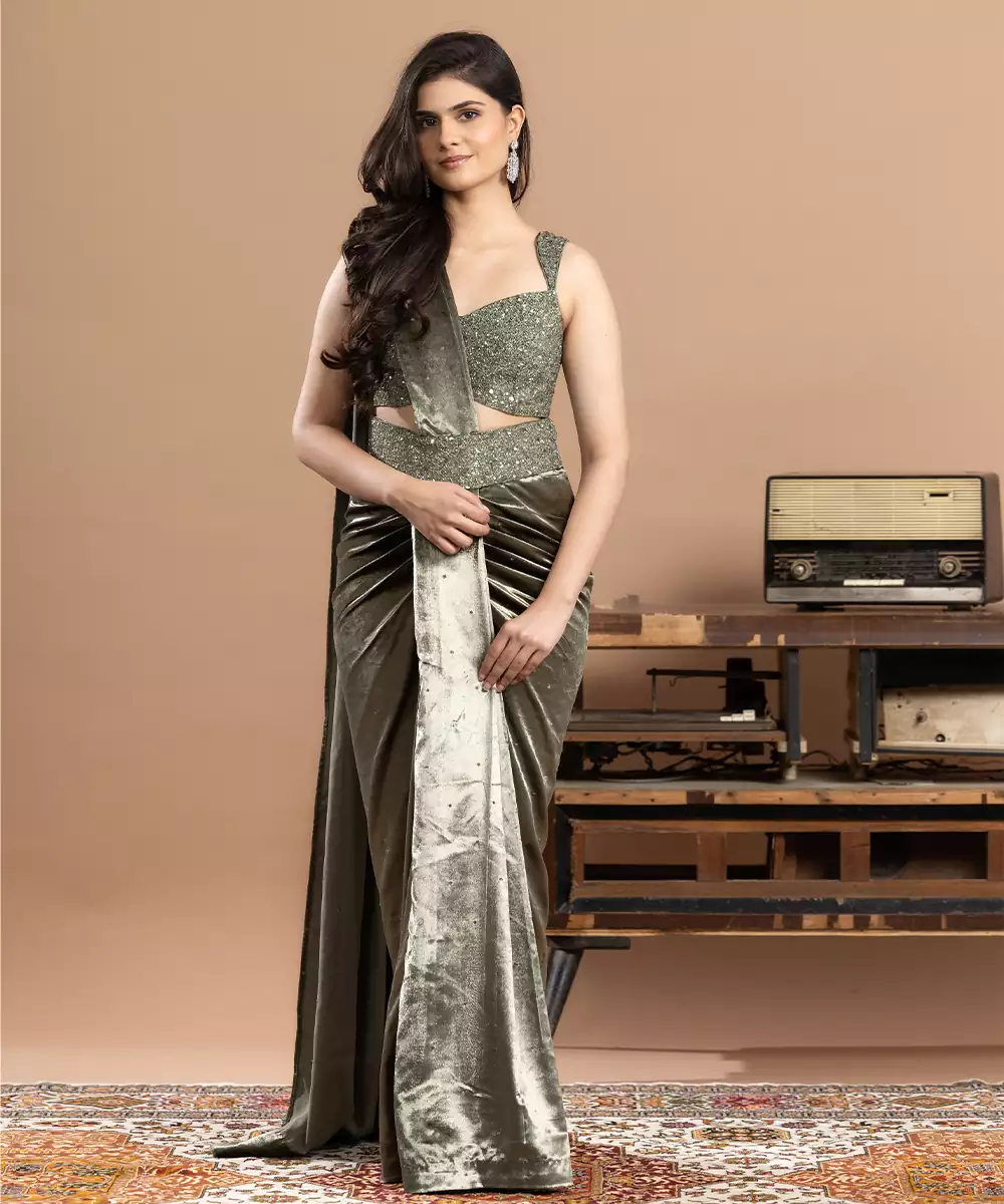 Sage Green Embroidered Velvet Saree Exudes Subtle Elegance And Regal Charm. Crafted From Luxurious Velvet, It Features Intricate Embroidery That Enhances Its Delicate Appeal. Perfect For Weddings, Festive Occasions, And Evening Celebrations, This Graceful Saree Offers A Rich Drape, Timeless Sophistication, And A Refined Traditional Look.