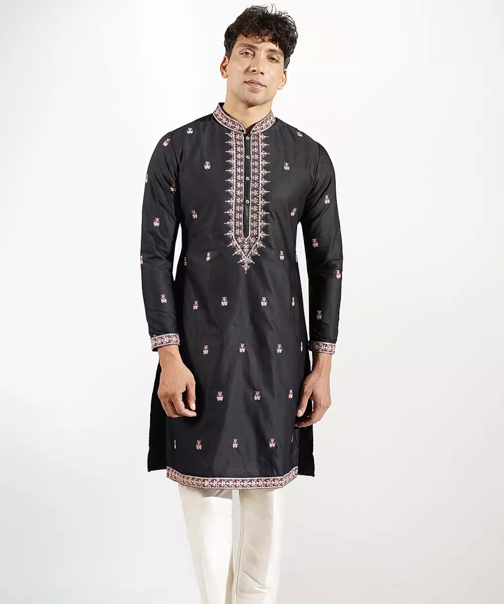 This Black Embroidered Cotton Silk Kurta Pajama Exudes Timeless Elegance And Refined Charm. Crafted From A Soft Cotton Silk Blend, It Features Delicate Embroidery That Enhances Its Sophisticated Appeal. The Tailored Kurta Paired With A Classic Pajama Offers Comfort And A Polished Silhouette, Perfect For Festive Occasions And Traditional Celebrations.