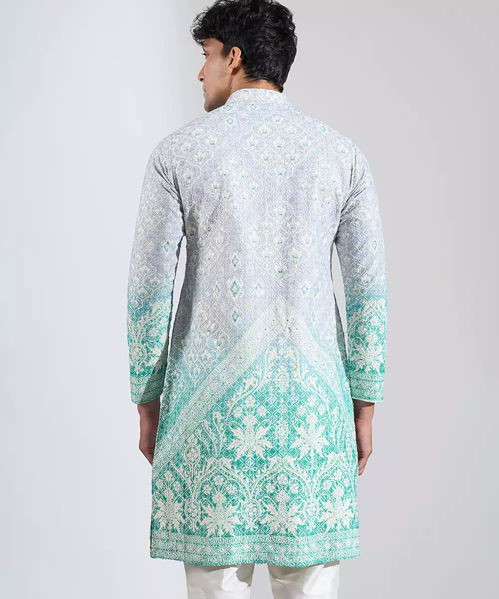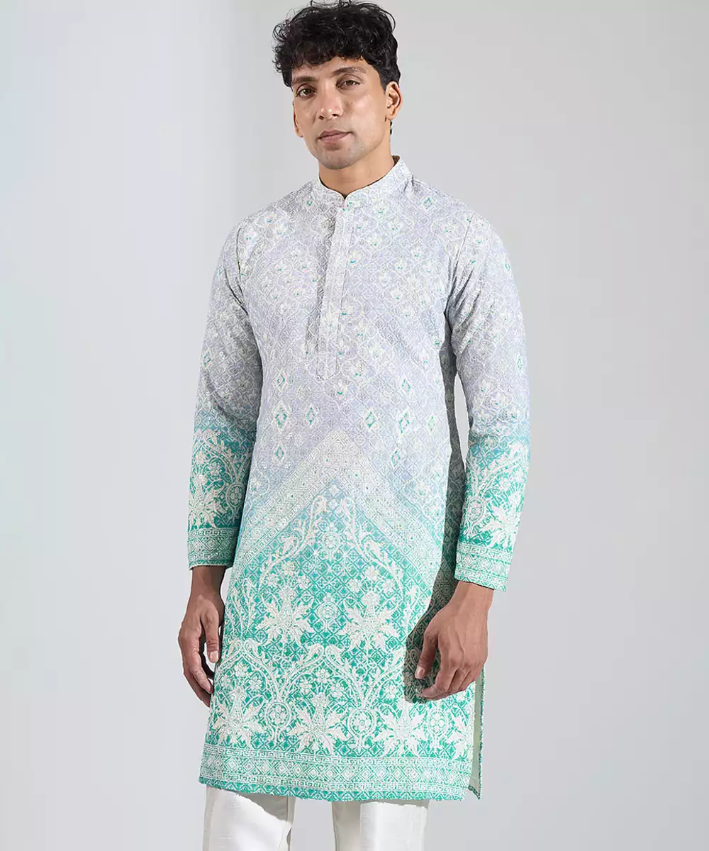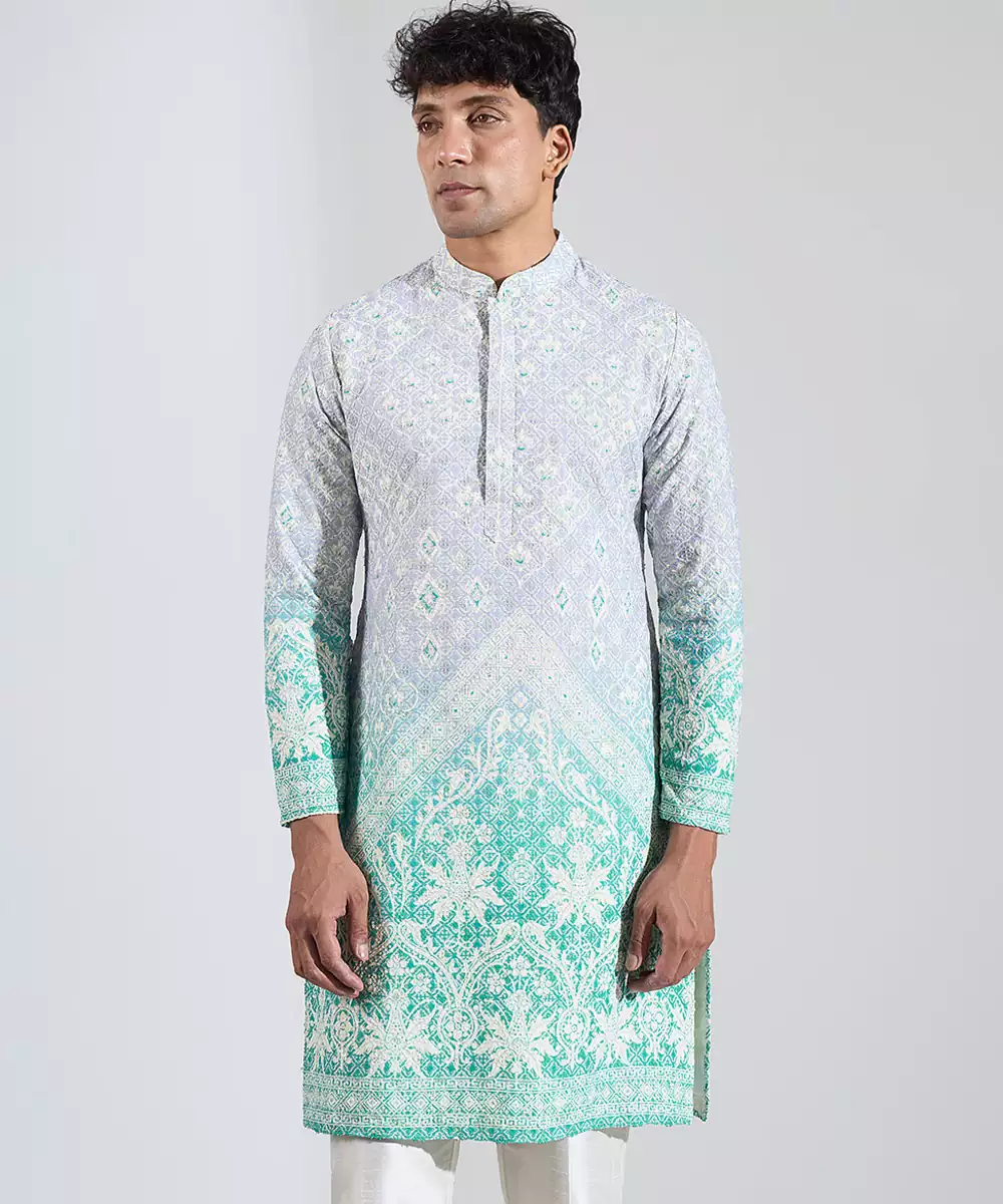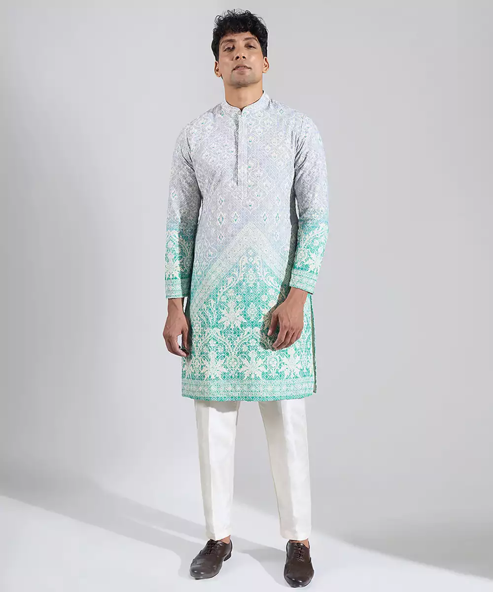 This Blue Embroidered Cotton Silk Kurta Pajama Blends Earthy Elegance With Festive Sophistication. Crafted From A Luxurious Cotton Silk Blend, It Features Intricate Embroidery That Enhances Its Refined Appeal. The Tailored Kurta Paired With A Classic Pajama Offers Comfort And Style, Making It Ideal For Celebrations, Cultural Events, Or Special Occasions.