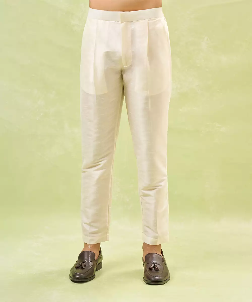Cream Brocade Silk Based Jacket With Floral Zari Print, Paired With A Blush Pink Cotton Silk Based Kurta And An Off White Dupion Silk Based Pants.
