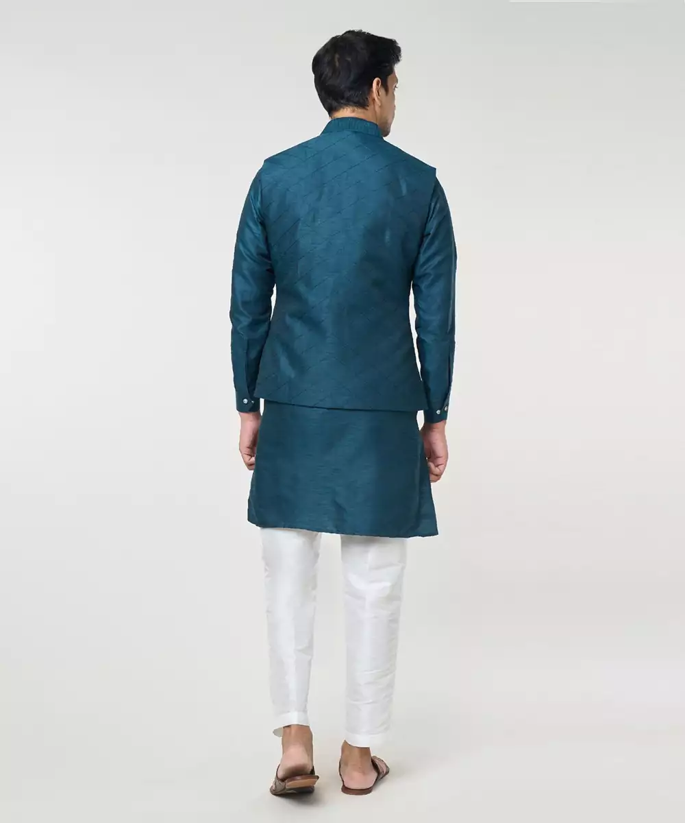 Rama Green Dupion Silk Based Open Jacket, Enhanced With Diamond Pintuck Embroidery, Paired With A Matching Embroidered Dupion Silk Kurta And An Off White Dupion Silk Based Mexican Pants.