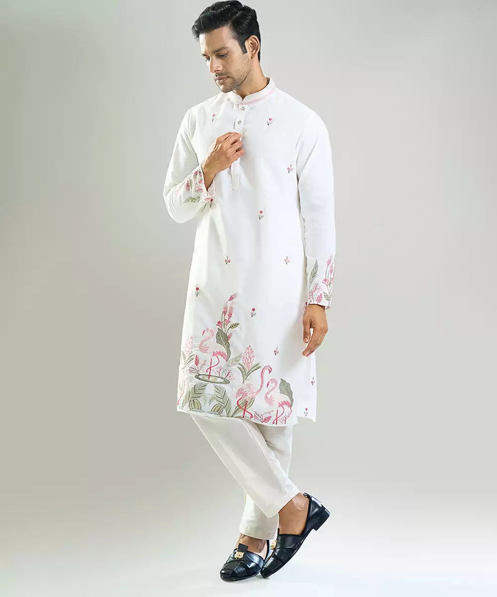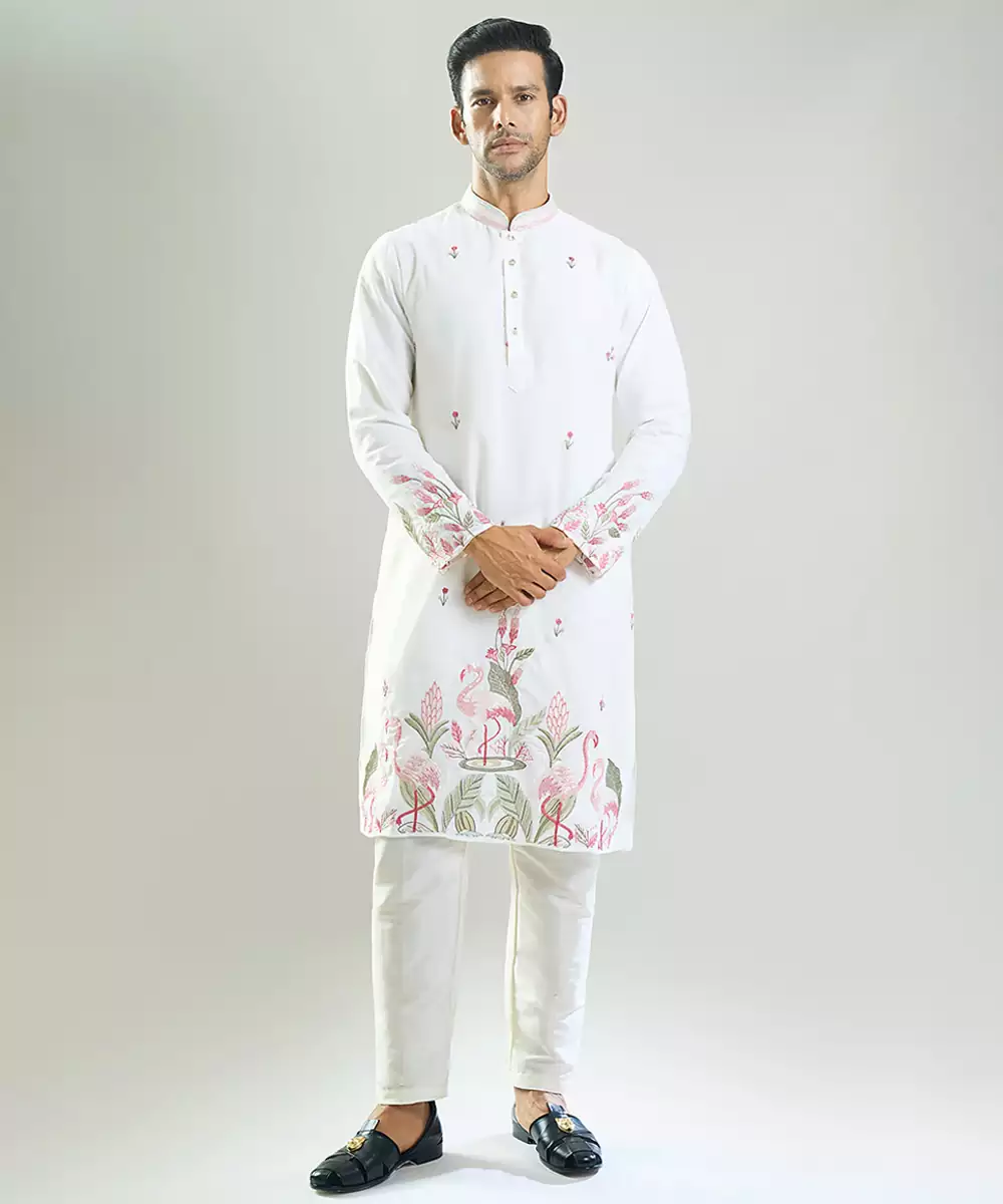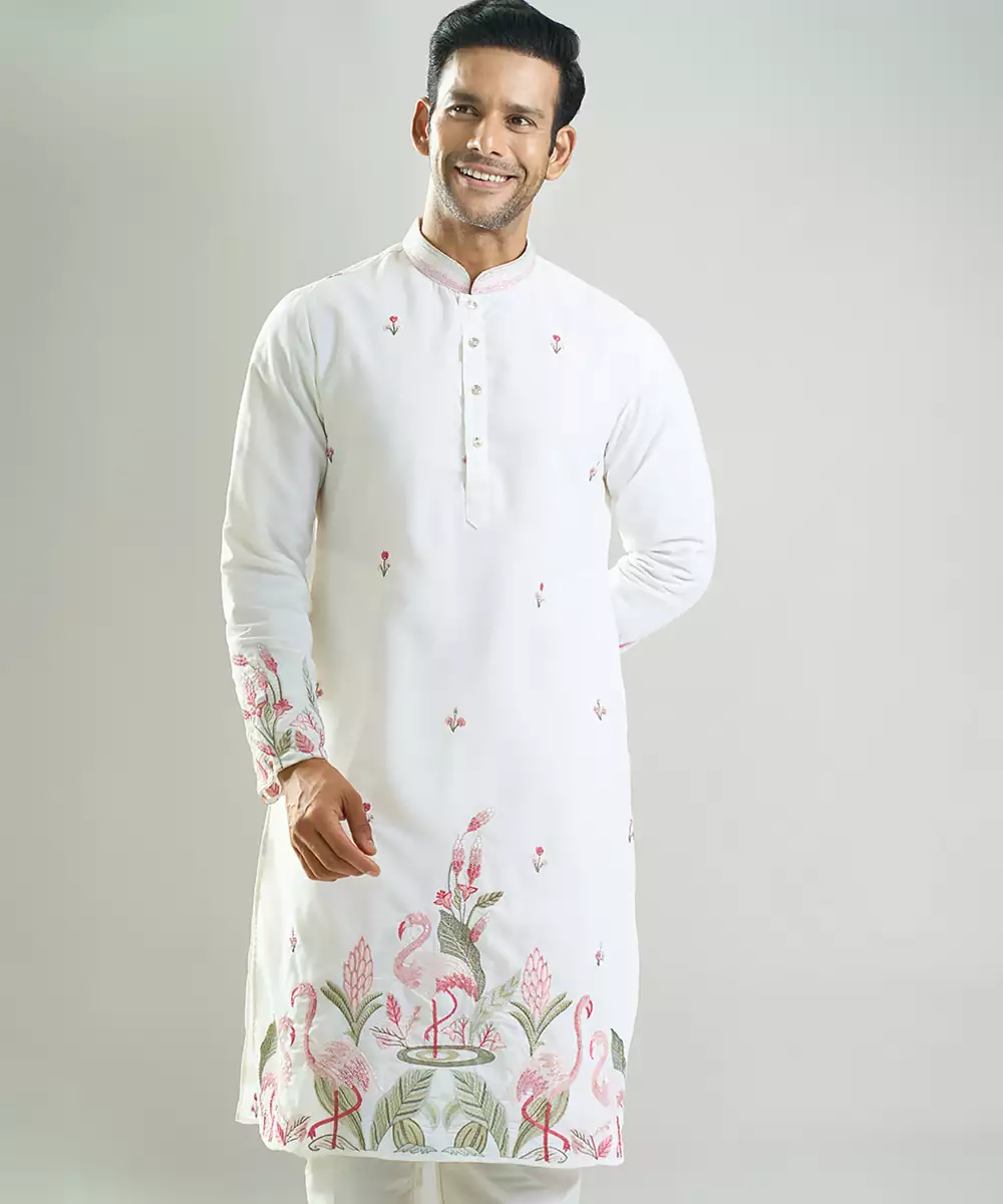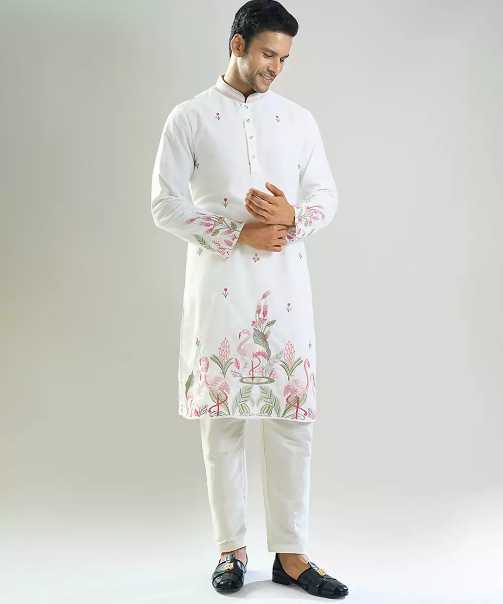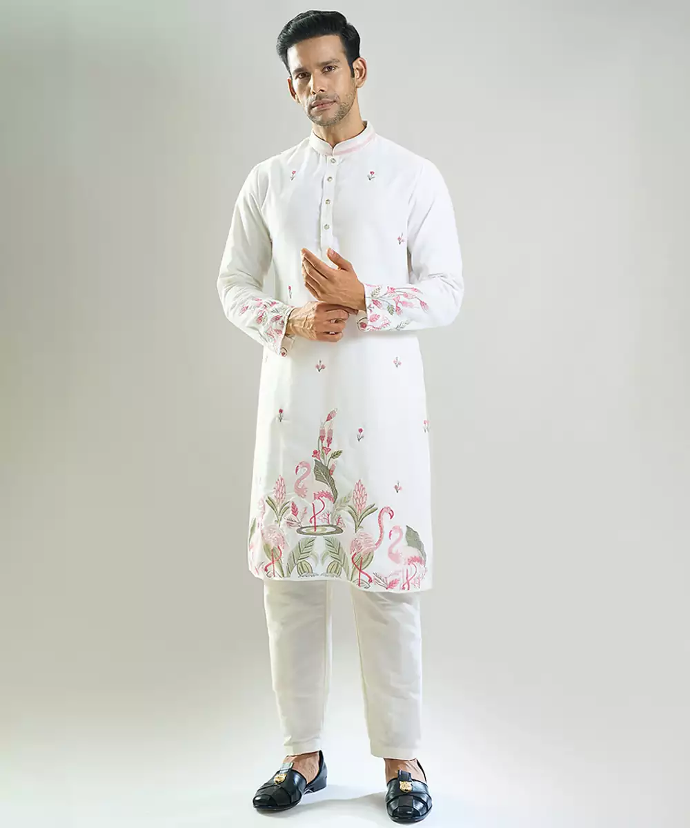 This White Embroidered Crepe Kurta Pajama Exudes Understated Elegance And Refined Charm. Crafted From Smooth Crepe Fabric, It Features Delicate Embroidery That Enhances Its Sophisticated Appeal. The Tailored Kurta Paired With A Classic Pajama Ensures Comfort And A Polished Silhouette, Making It Perfect For Festive Occasions, Celebrations, Or Formal Gatherings.