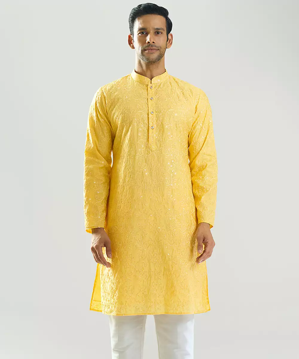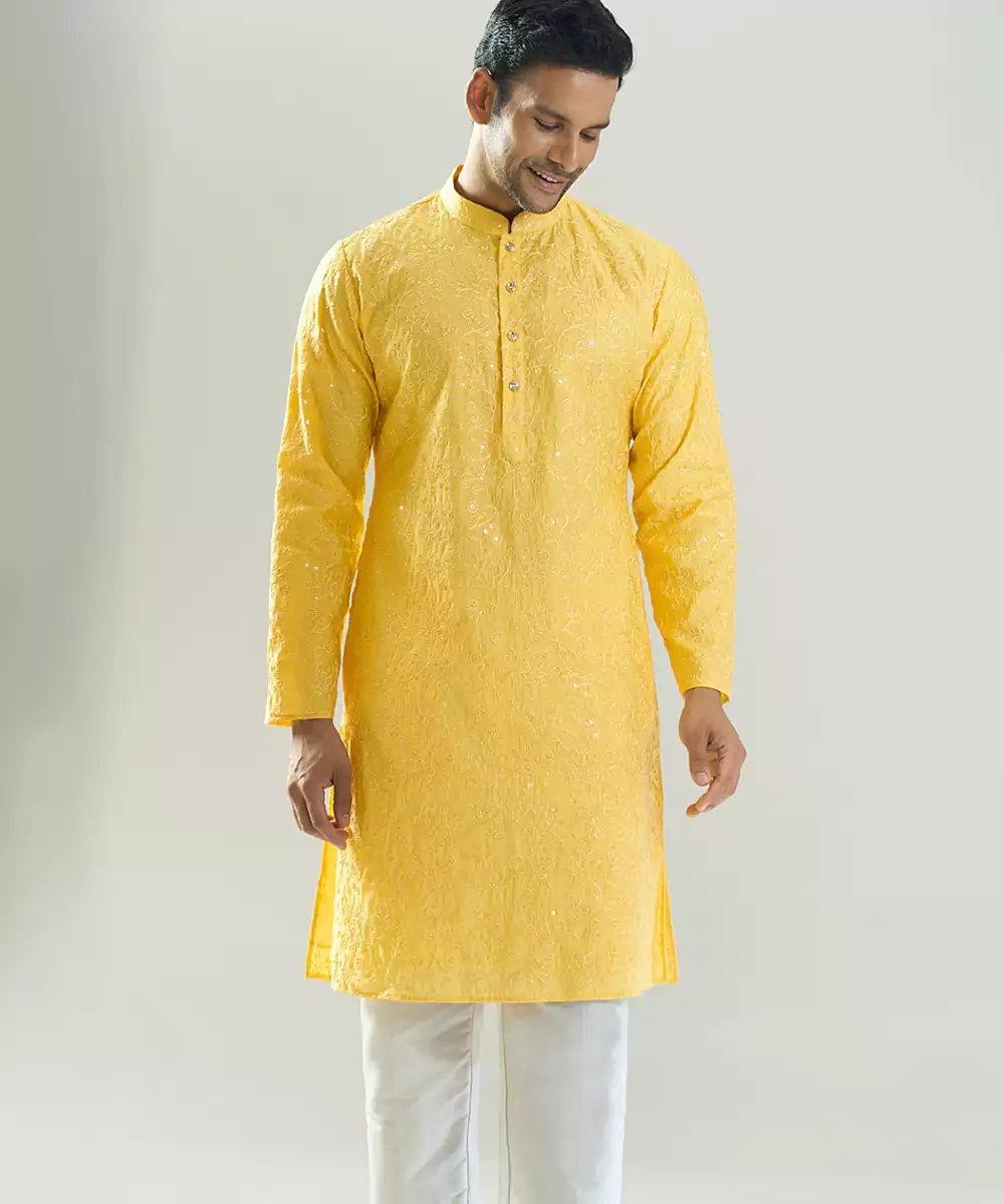 This Yellow Embroidered Cotton Silk Kurta Pajama Blends Vibrant Charm With Refined Elegance. Crafted From A Soft Cotton Silk Blend, It Features Intricate Embroidery That Enhances Its Sophisticated Appeal. The Tailored Kurta Paired With A Classic Pajama Offers Comfort And Style, Making It Perfect For Festive Occasions And Special Celebrations.