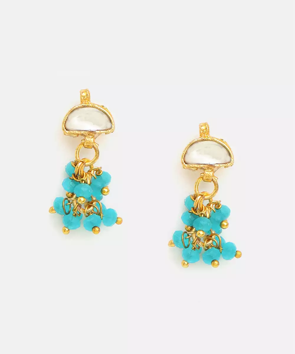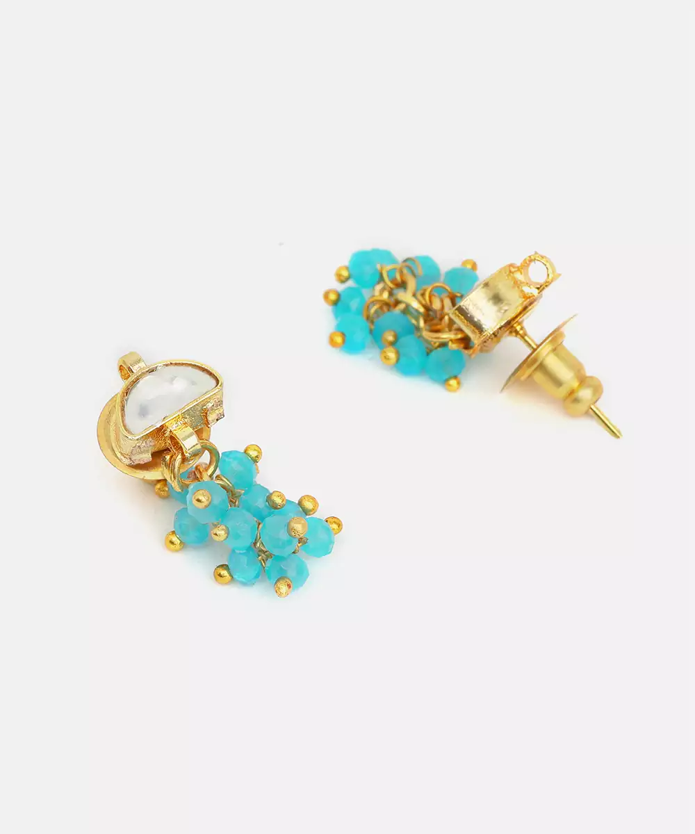 Featuring Striking Blue Stones, These Gold Plated Kundan Earrings Bring A Cool, Royal Vibe To Ethnic Attire. Crafted With Intricate Detailing, They Enhance Facial Features And Bridal Looks Gracefully. Perfect For Weddings And Festive Occasions, They Pair Beautifully With Lehengas And Sarees, Adding Sophistication And Cultural Elegance.