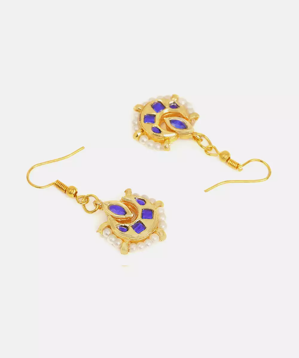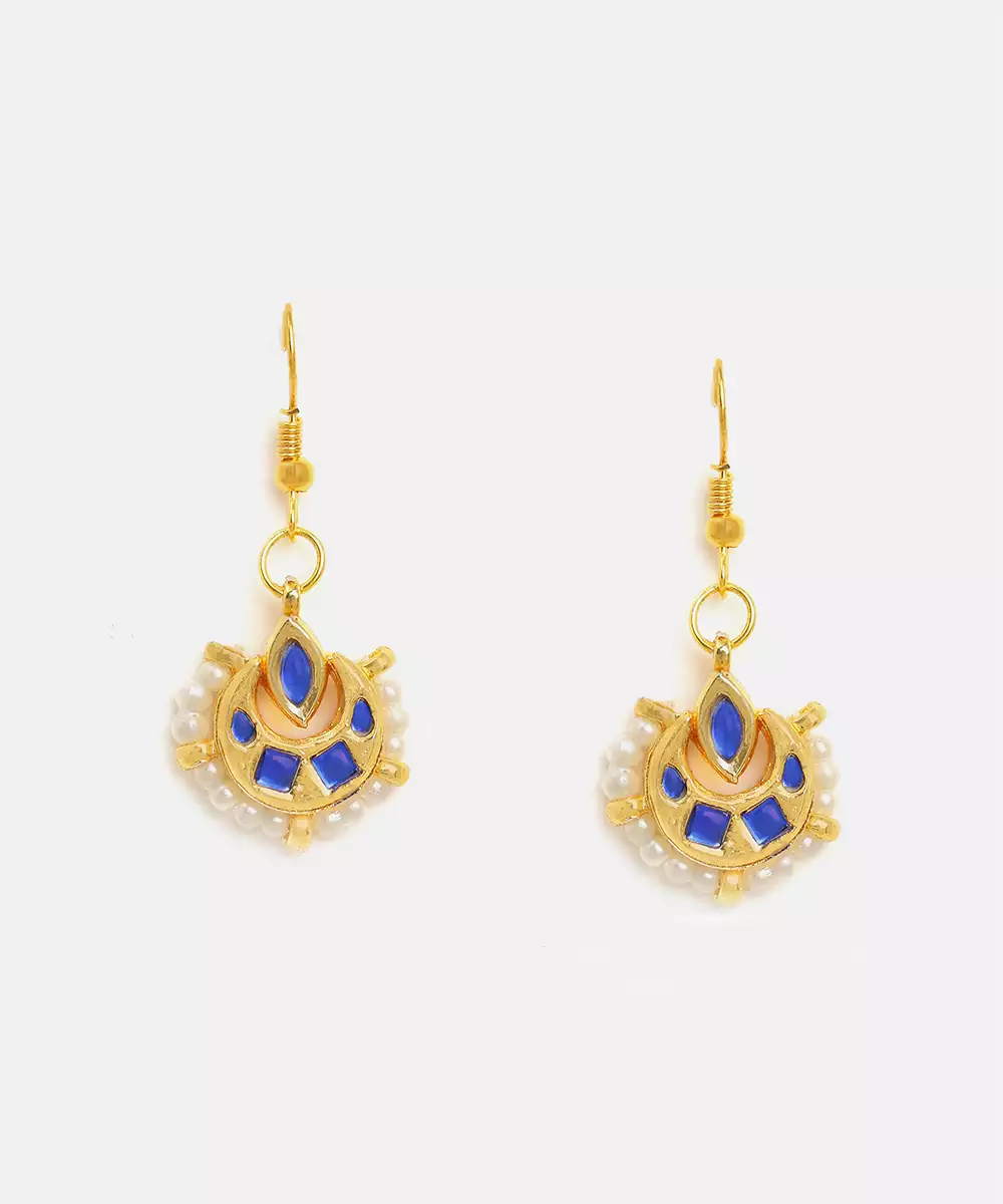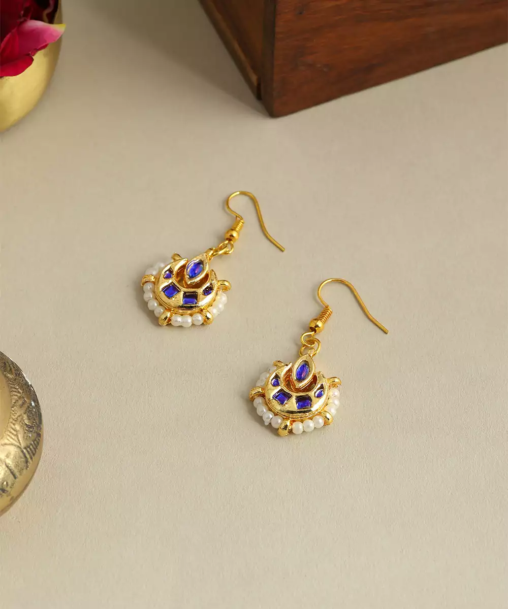 These Gold Plated Kundan Earrings Feature Vibrant Blue Stones For A Striking And Royal Appearance. The Detailed Craftsmanship Highlights Traditional Artistry While Enhancing Facial Features. Ideal For Weddings, Festive Occasions, And Bridal Wear, They Pair Beautifully With Sarees And Lehengas, Adding Elegance, Sophistication, And Cultural Charm.