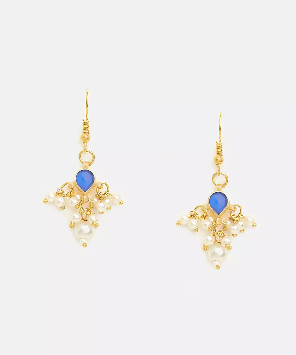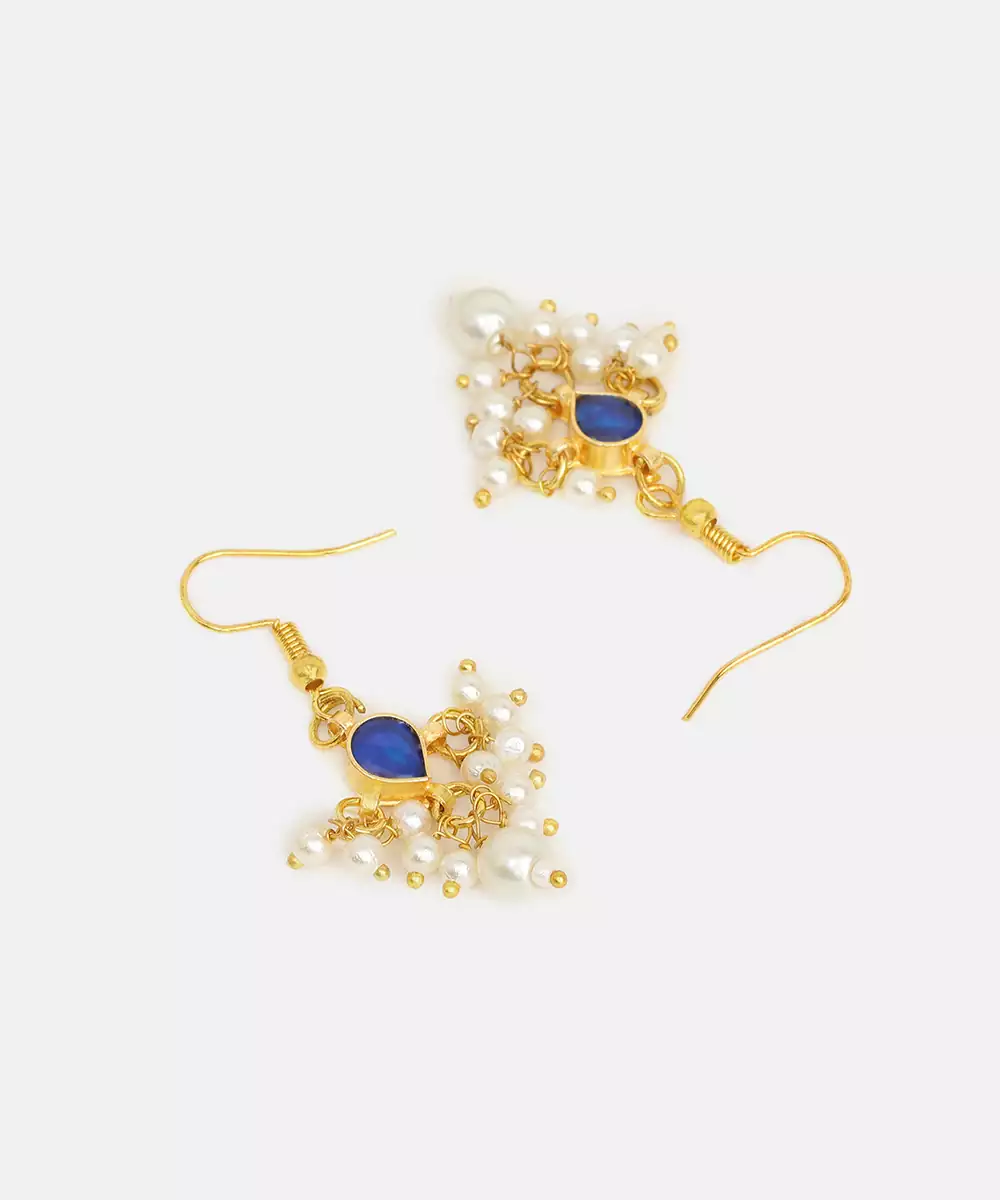 These Gold Plated Kundan Earrings Feature Striking Blue Stones Set In A Traditional Motif. The Delicate Craftsmanship Creates A Graceful, Regal Effect Suitable For Bridal And Festive Wear. Perfect For Pairing With Sarees And Lehengas, They Add Elegance, Charm, And A Timeless Ethnic Accent To Any Ensemble.