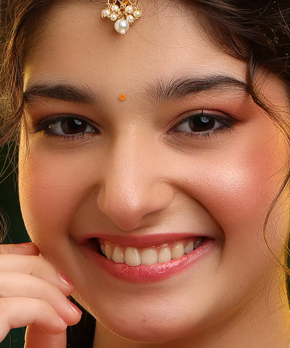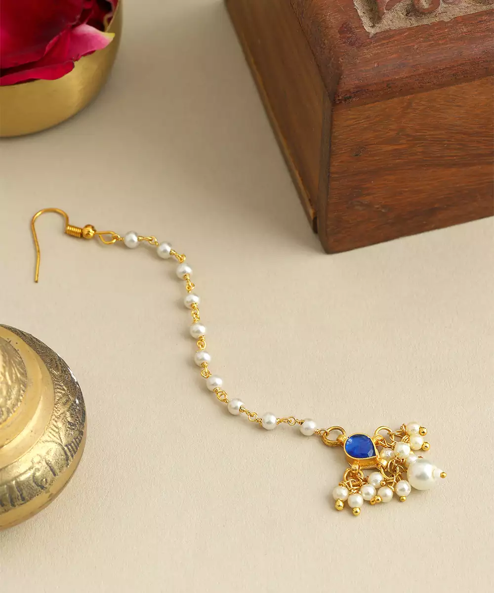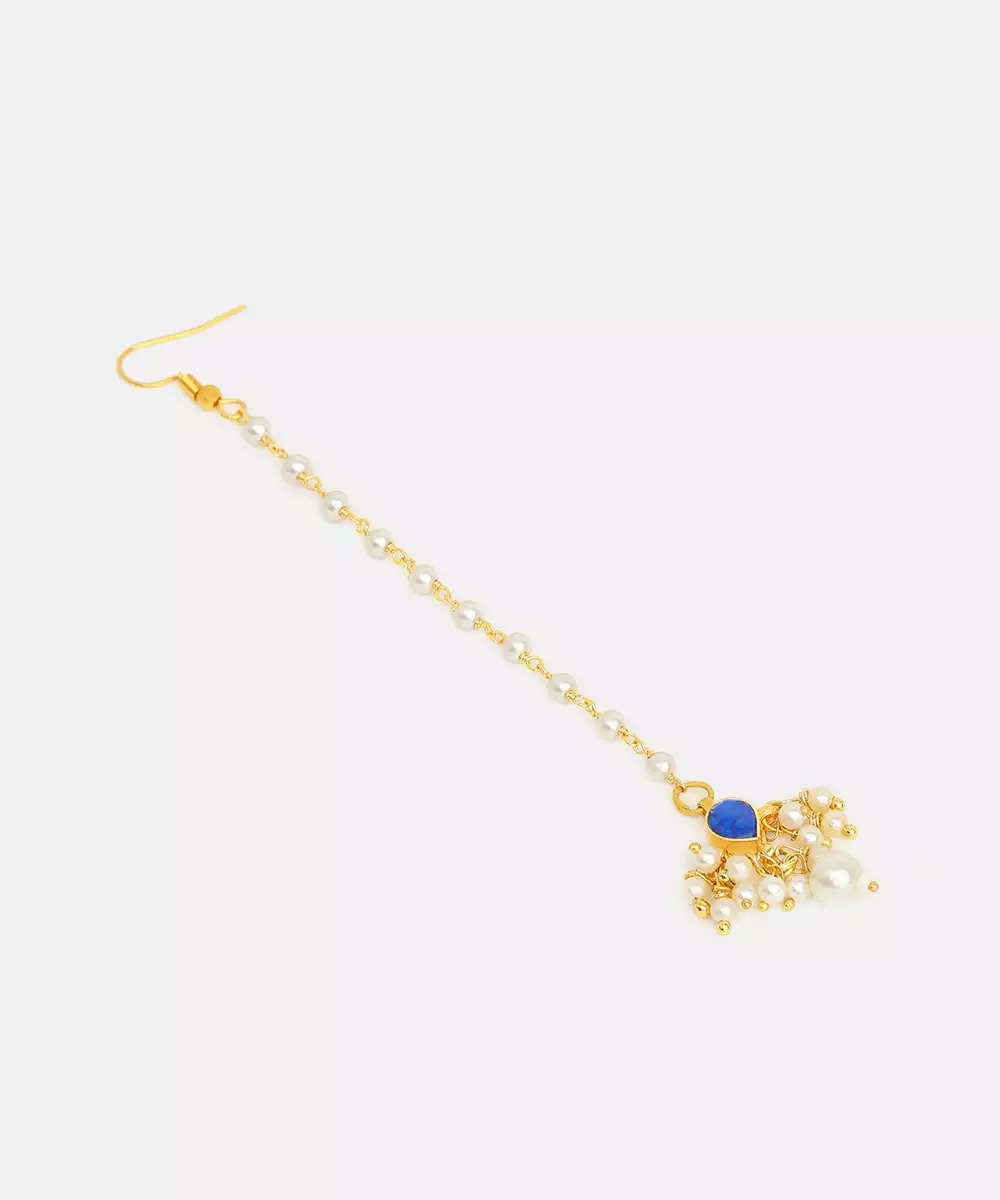 Highlighted With Deep Blue Stones, This Gold Plated Kundan Maang Tikka Adds Royal Charm And Elegance. The Intricate Craftsmanship Ensures A Comfortable Fit And Stunning Visual Appeal. Perfect For Weddings And Festive Celebrations, It Complements Sarees And Lehengas, Enhancing Ethnic Hairstyles With Timeless Beauty.