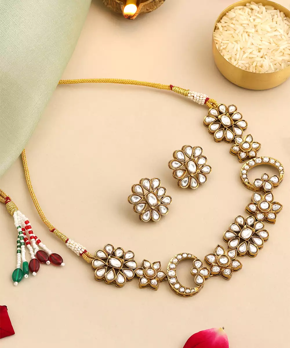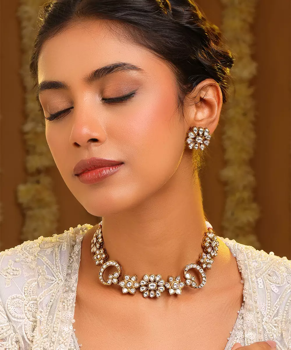 This Gold Plated Kundan Choker Necklace Set Showcases Timeless Elegance And Refined Artistry. Crafted With Traditional Kundan Detailing, It Adds A Royal Accent To Bridal And Festive Looks. Ideal For Weddings And Celebrations, This Choker Set Pairs Beautifully With Sarees And Lehengas For A Sophisticated Finish.