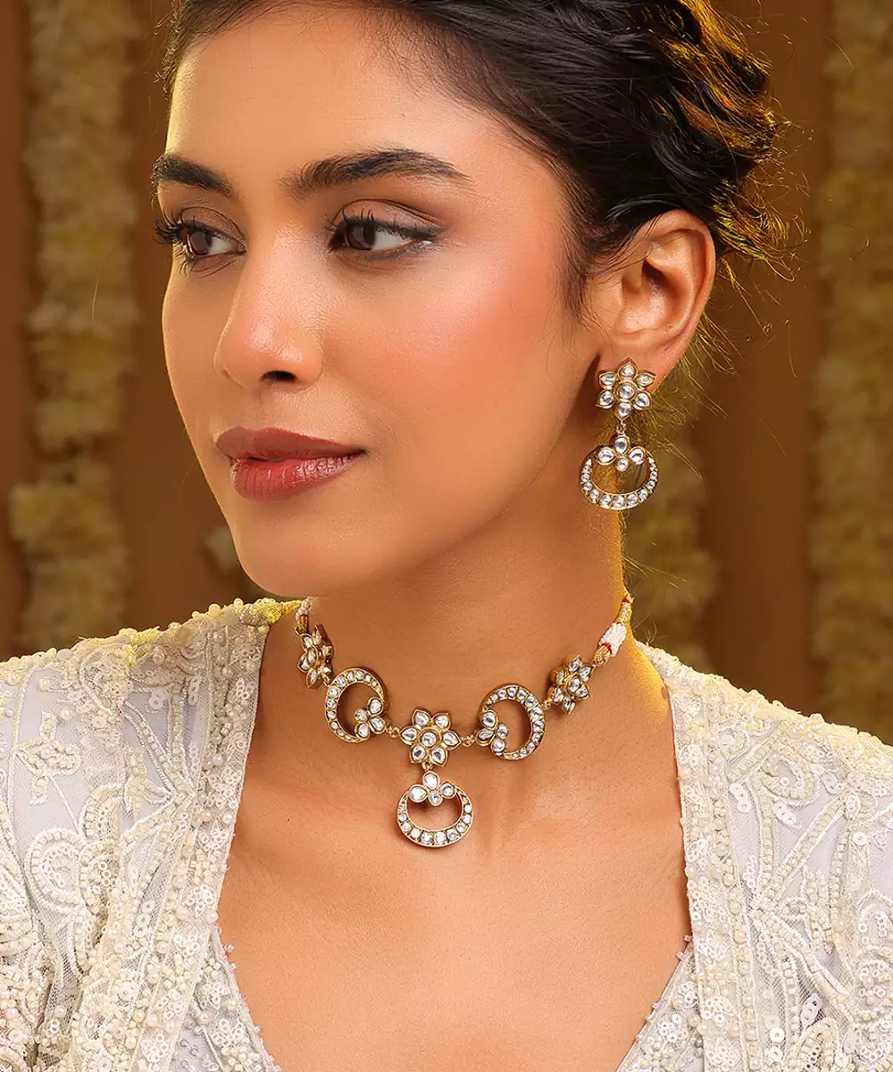 This Gold Plated Kundan Choker Necklace Set Reflects Timeless Craftsmanship And Regal Appeal. Designed With Intricate Kundan Detailing, It Enhances Bridal And Festive Ensembles With Elegance. Ideal For Weddings And Special Occasions, This Choker Set Pairs Beautifully With Sarees And Lehengas For A Refined And Sophisticated Look.