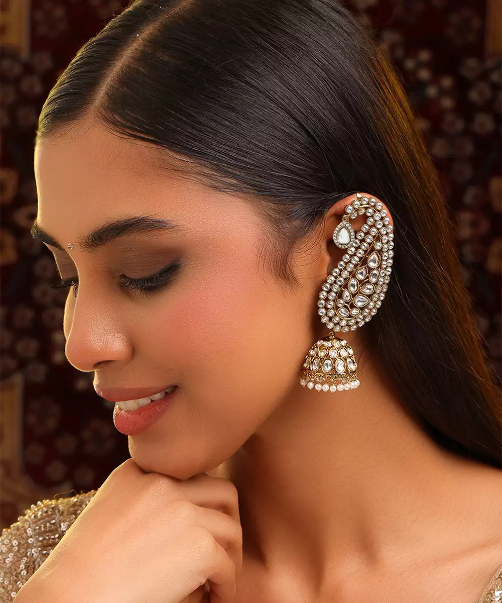 These Gold Plated Kundan Earrings Embody Classic Elegance And Fine Craftsmanship. Featuring Intricate Kundan Work, They Create A Timeless Accessory For Festive And Bridal Styling. Perfect For Weddings And Celebrations, These Earrings Enhance Sarees, Lehengas, And Traditional Outfits With Graceful Appeal.