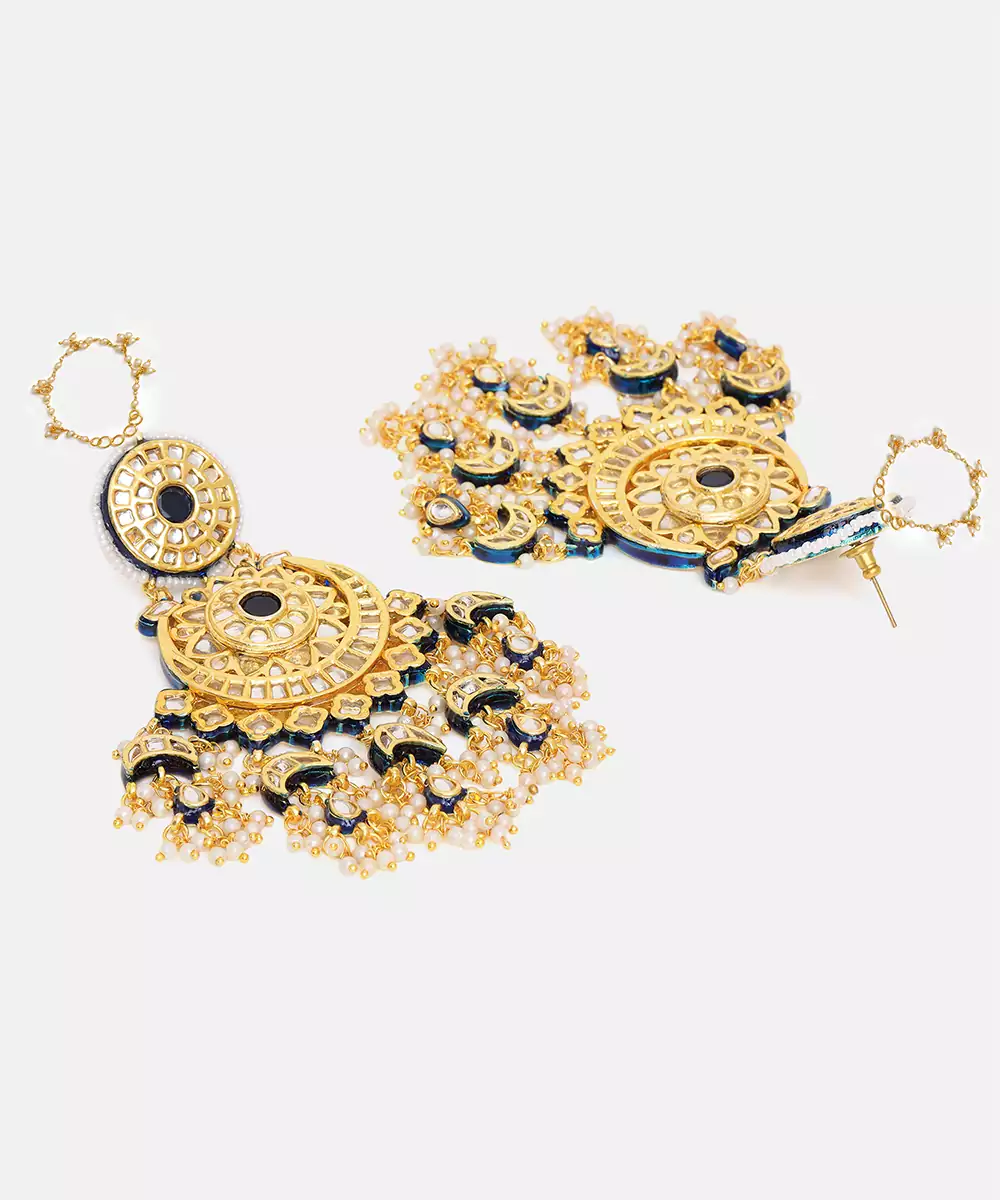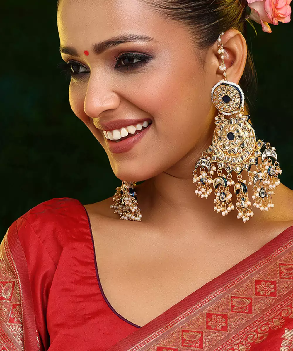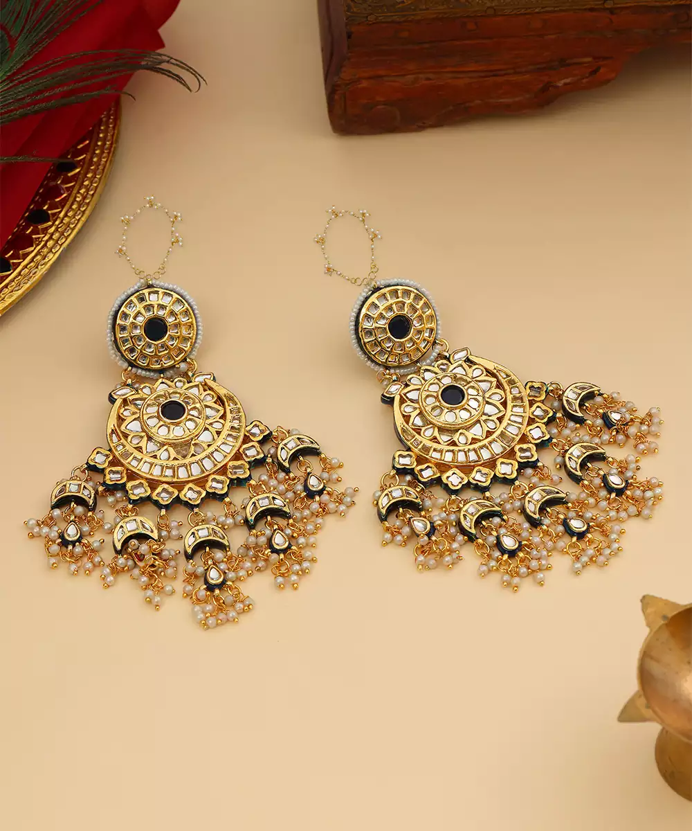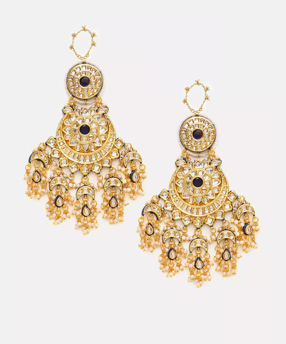 This Gold Plated Kundan Green Stone Chandbali Earrings Exudes Timeless Elegance With Its Classic Crescent Design And Intricate Craftsmanship. Adorned With Shimmering Kundan Detailing In Soft White Tones, It Adds A Refined, Regal Touch. Perfect For Weddings, Festive Occasions, And Celebrations, It Beautifully Complements Traditional And Contemporary Ethnic Ensembles.