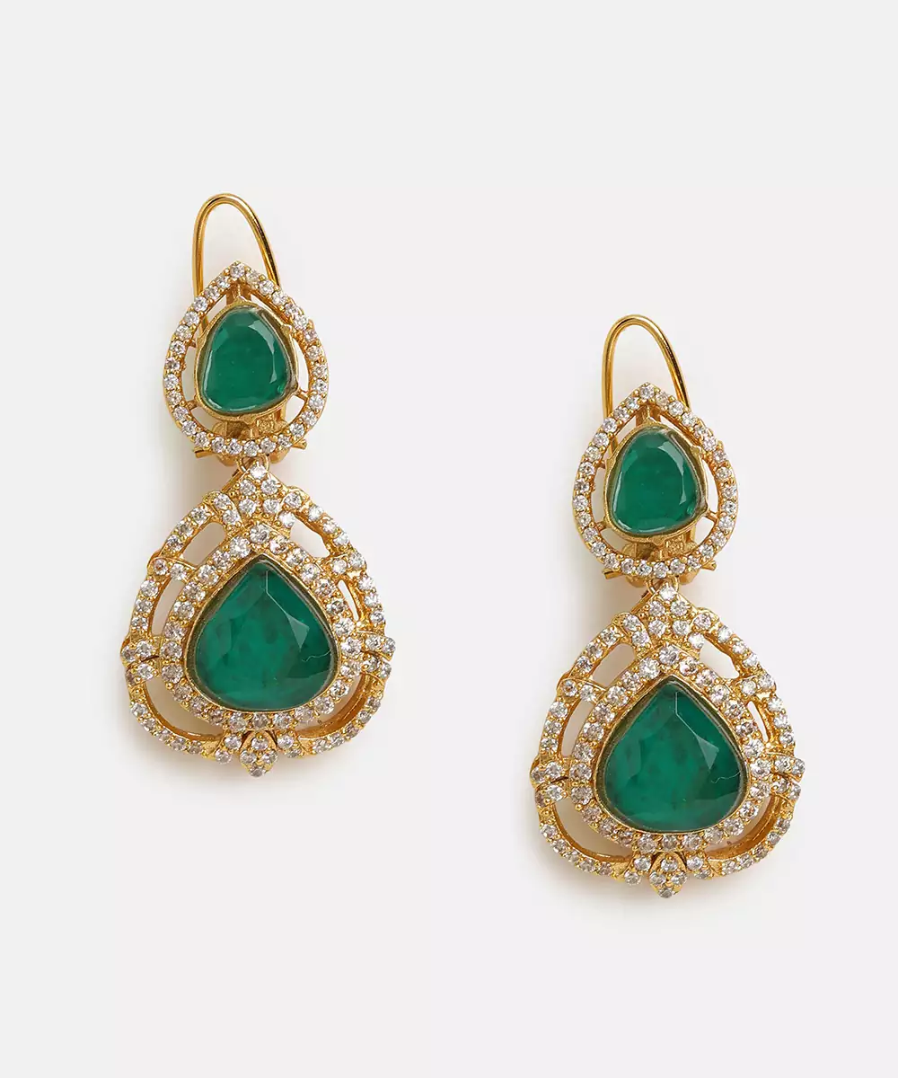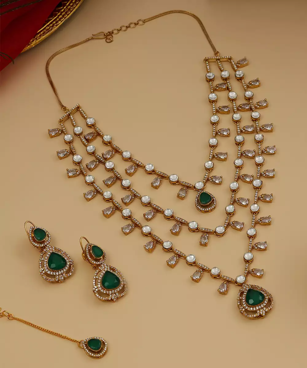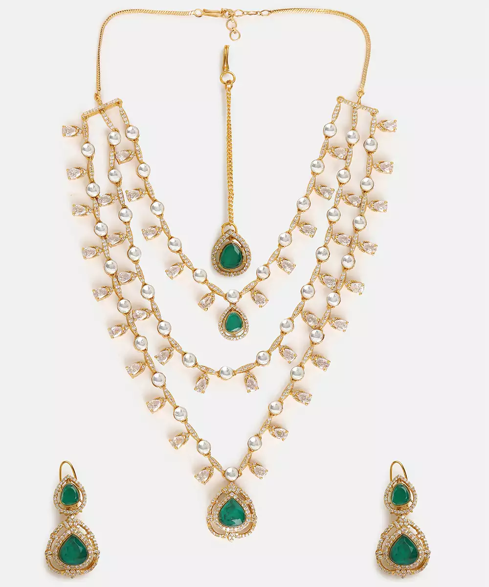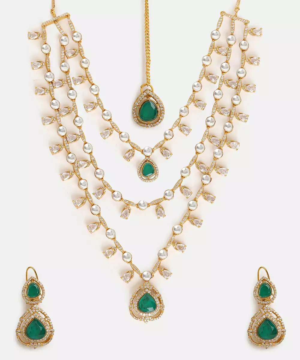 This Gold Plated Kundan Green Stone Necklace Set Radiates Regal Elegance With Its Intricate Craftsmanship And Rich Detailing. Adorned With Classic Kundan Work And Vibrant Green Accents, It Adds A Festive, Traditional Charm. Perfect For Weddings, Celebrations, And Special Occasions, It Beautifully Complements Ethnic And Bridal Ensembles With Timeless Sophistication.