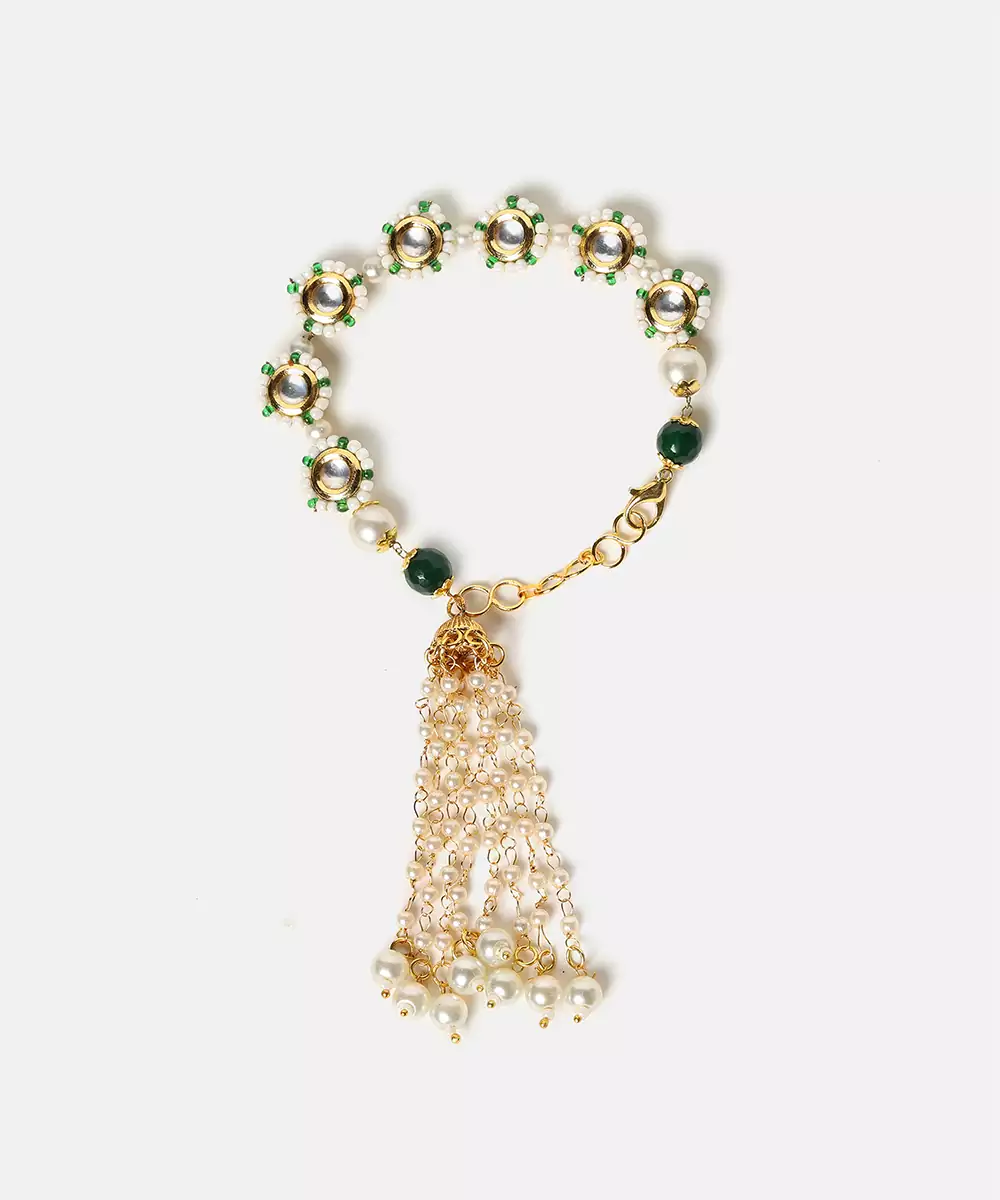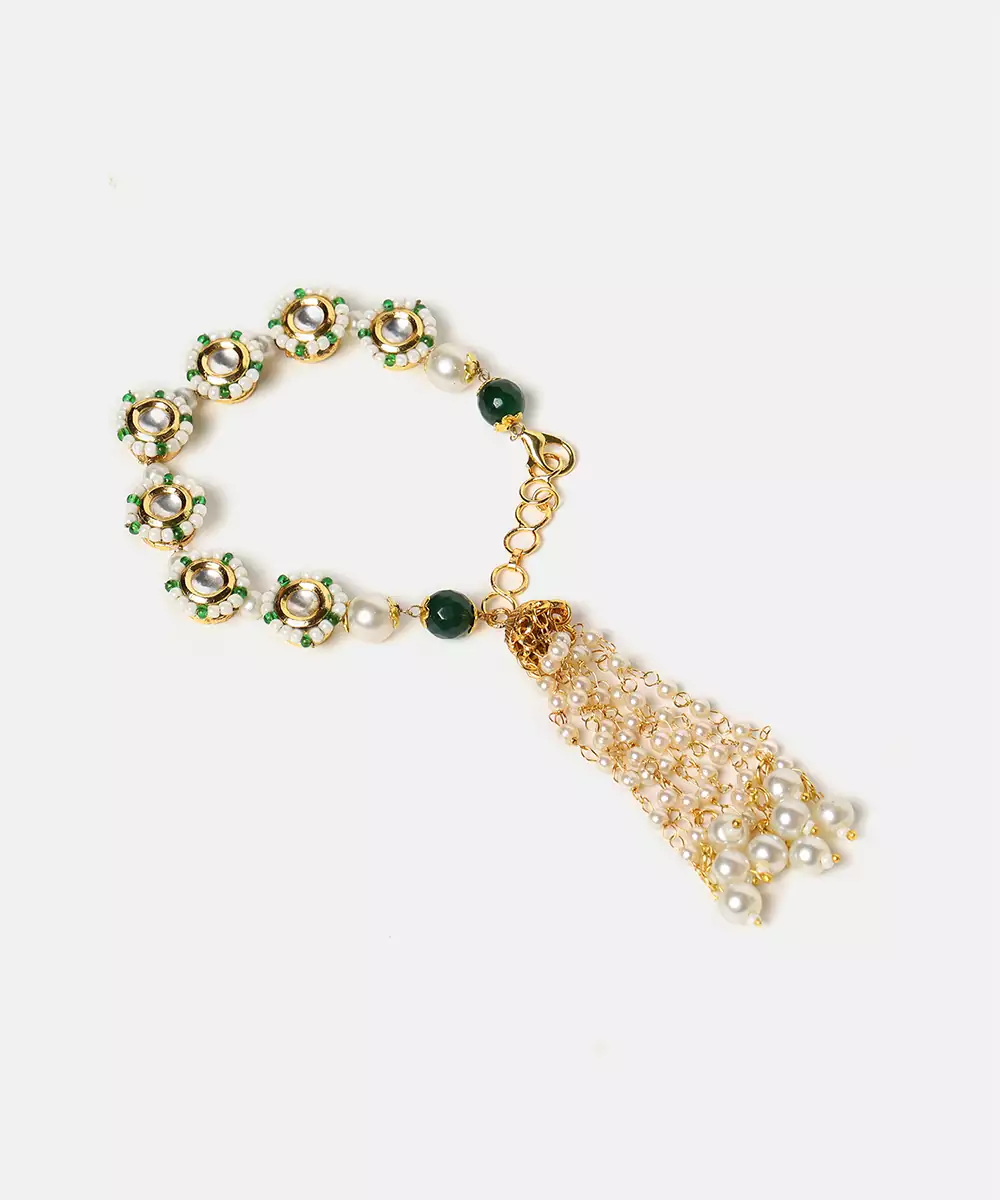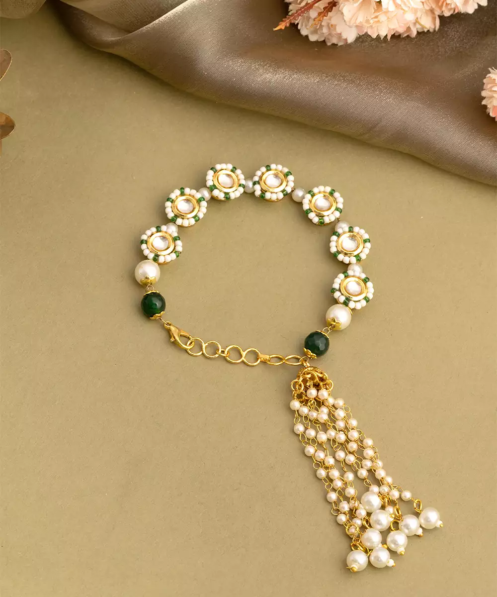 This Gold Plated Kundan Green Stones Bracelet Blends Refined Craftsmanship With Regal Beauty. Adorned With Rich Green Stones And Kundan Detailing, It Enhances Ethnic And Festive Outfits Effortlessly. Perfect For Weddings And Special Occasions, This Bracelet Adds Elegance And Charm To Sarees And Lehengas.
