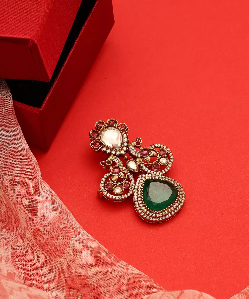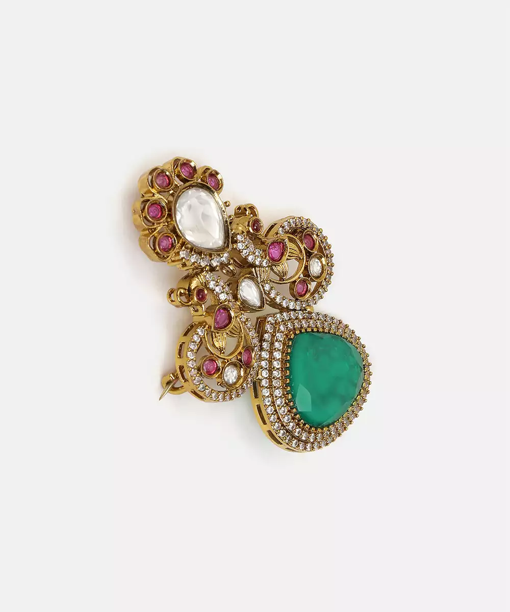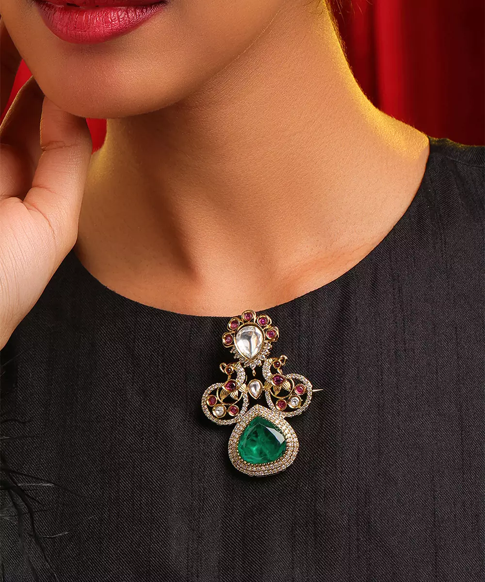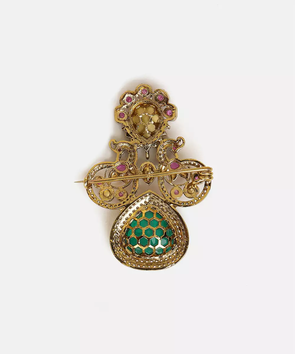 This Gold Plated Kundan Green Stones Brooch Embodies Royal Elegance And Fine Detailing. Featuring Classic Kundan Work With Rich Green Stones, It Adds A Luxurious Touch To Traditional Attire. Perfect For Weddings And Festive Occasions, This Brooch Complements Sherwanis, Bandhgalas, And Ethnic Ensembles With Grace.